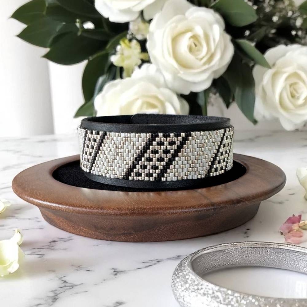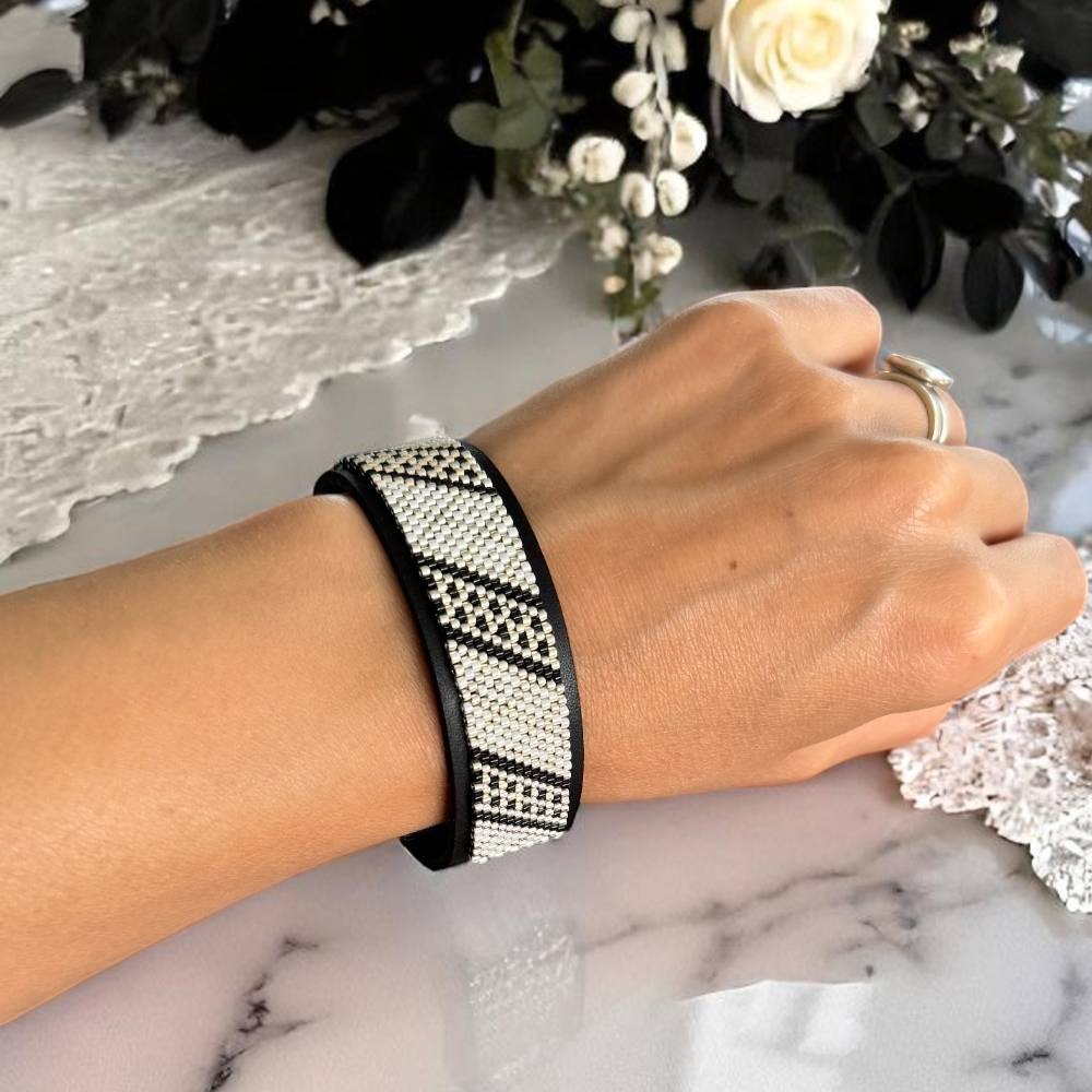 Bratara rigida Lira din margele miyuki in nuante negru-argintiu este un accesoriu deosebit, elegant si modern. Bratara cu margele de sticla este cusuta manual si aplicata pe un suport din piele naturala. Cu o lungime de 18 cm, aceasta bratara este potrivita atat pentru ocazii speciale, cat si pentru outfituri de zi cu zi. Combinatia dintre margelele negre si argintii ofera un contrast subtil, dar plin de stil, ideal pentru iubitoarele de accesorii sofisticate.