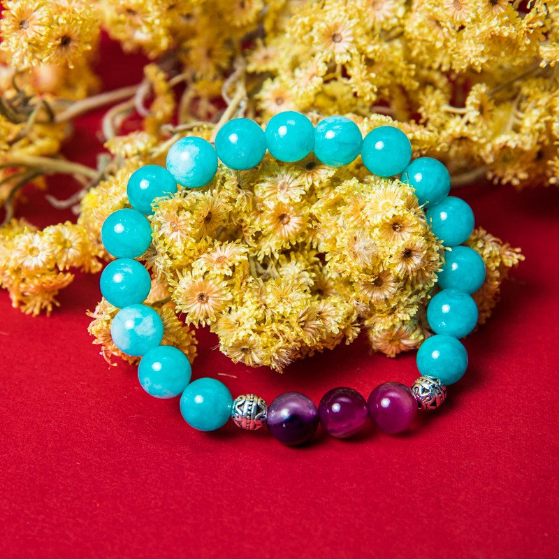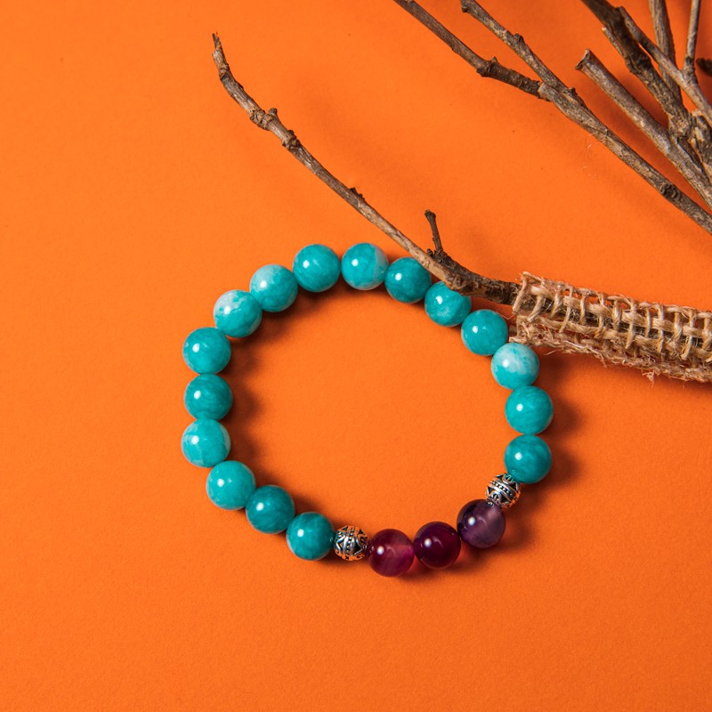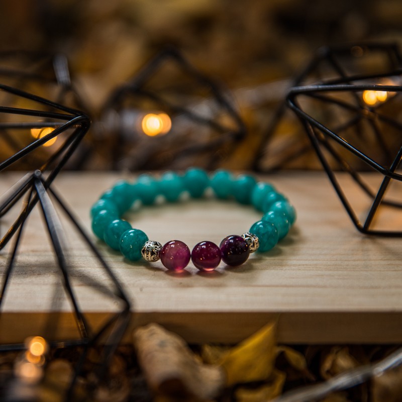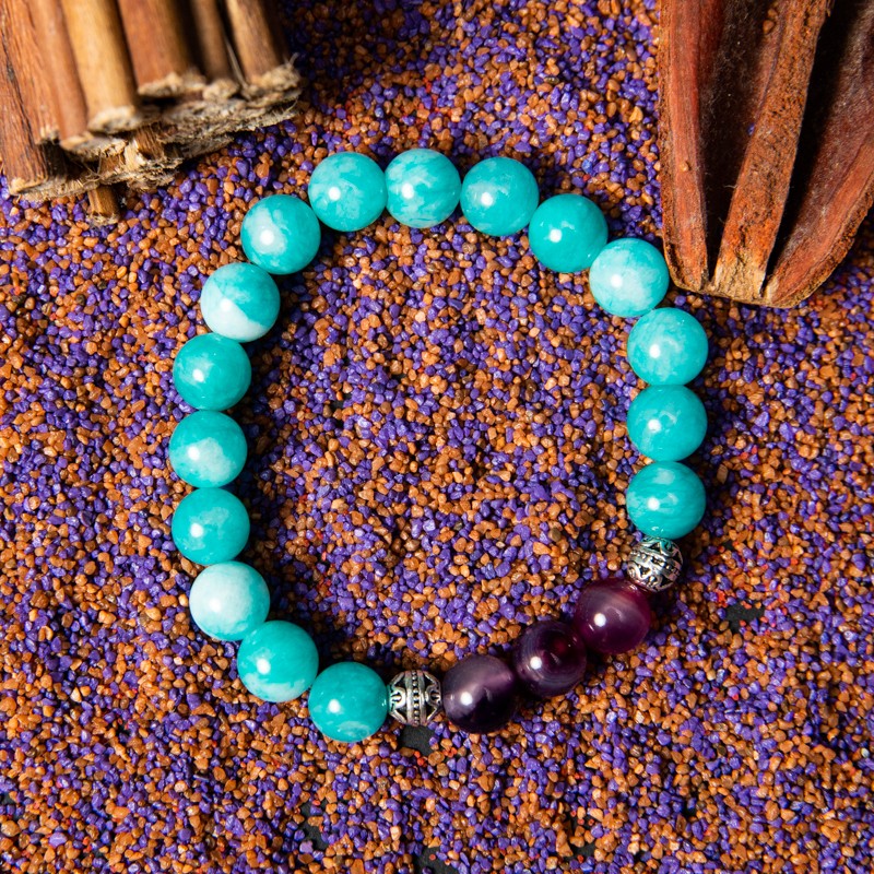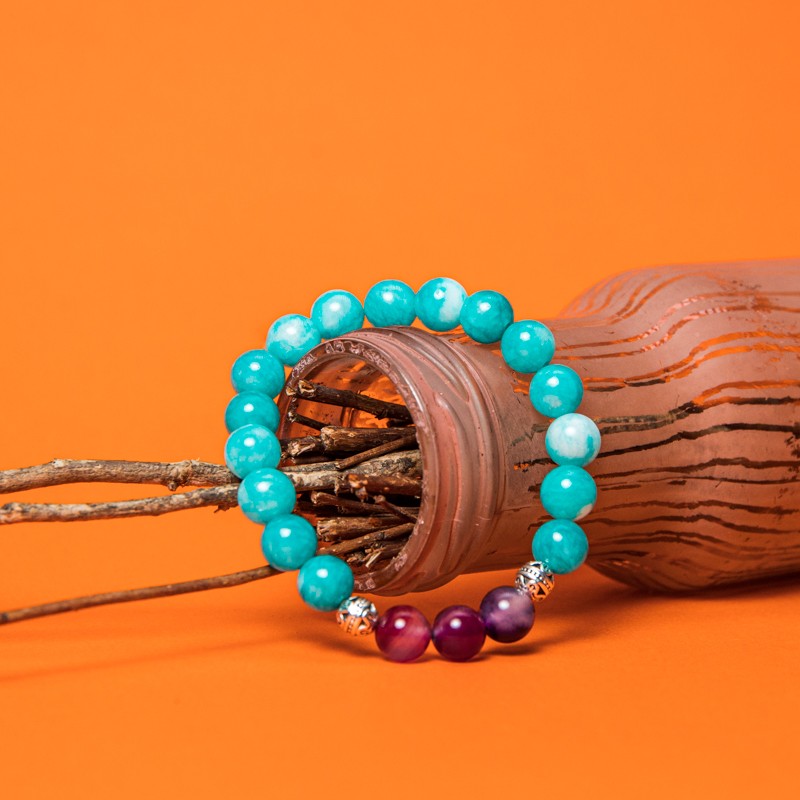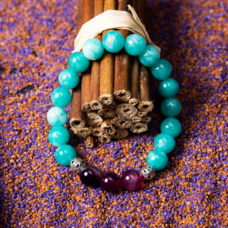 Poate parea o combinatie ciudata, albastru cu mov, Amazonit si Agata Mov in aceeasi bratara. Insa, ambele cristale sunt cunoscute ca avand efecte calmante si linistitoare, care pot risipi frica si confera curaj, energie si forta, trasaturi care sporesc increderea in sine.