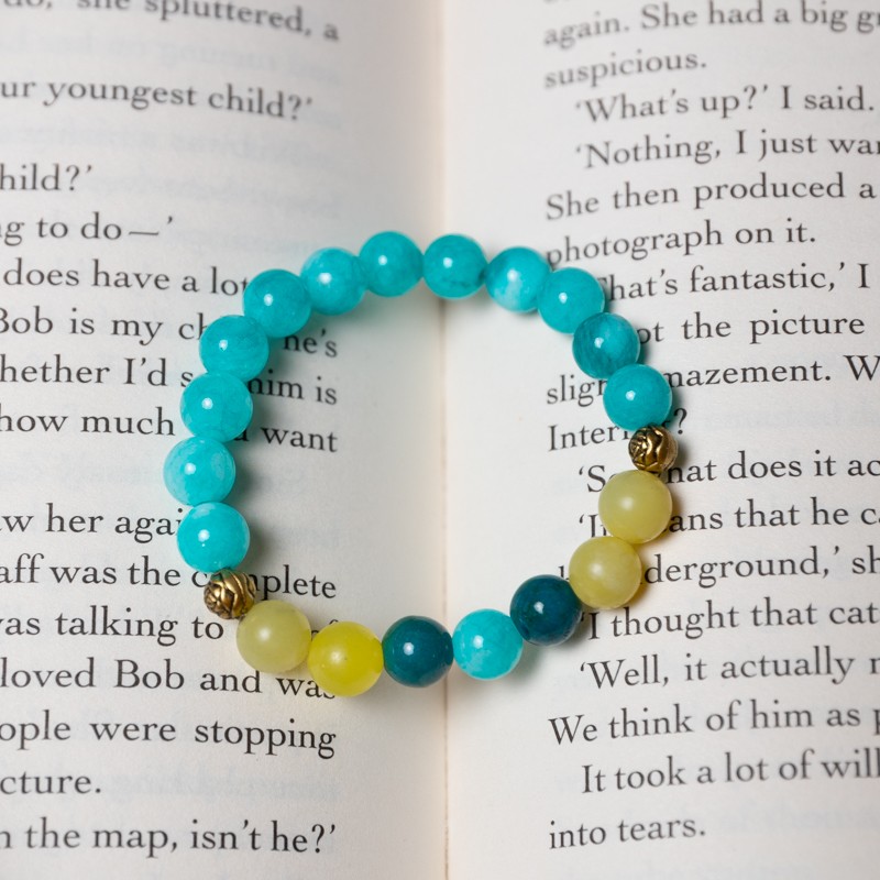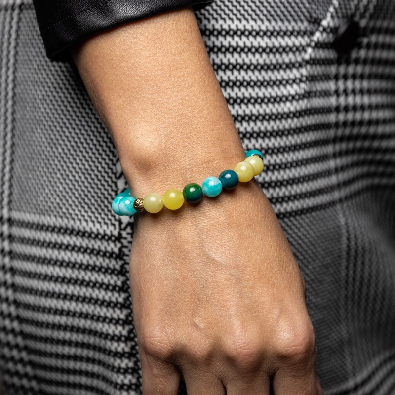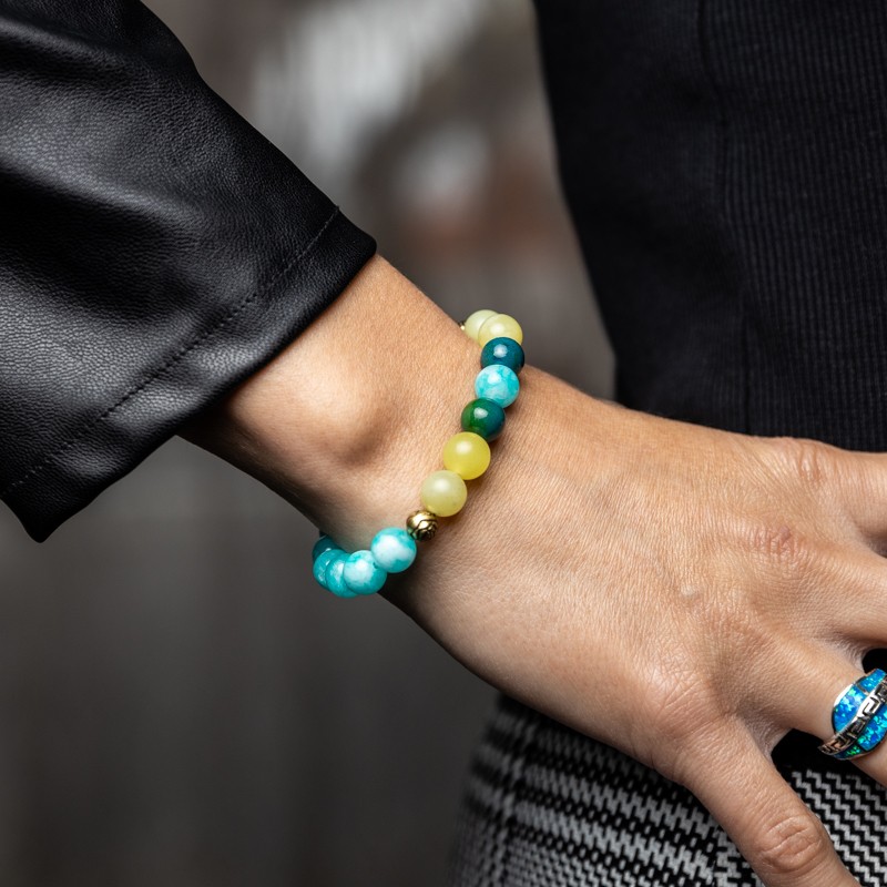 Bratara din pietre semipretioase Geetica iti va reaminti de turcoazul marii si galbenul florilor. Poart-o la mana ori de cate ori simti nevoia sa evadezi cu mintea la mare si la soare!