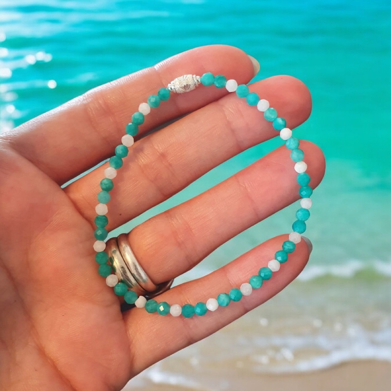 Amazonitul, cu nuantele sale de albastru profund si vibrant, aduce la viata claritatea si linistea apelor oceanului. Este o piatra cunoscuta pentru capacitatea sa de a calma mintea si de a inspira adevarul si armonia. Combinatia cu piatra lunii, cu tonurile sale delicate de alb si reflexiile sale misterioase, adauga un contrast elegant si subtil, evocand lumina lunii reflectata pe valurile marii.