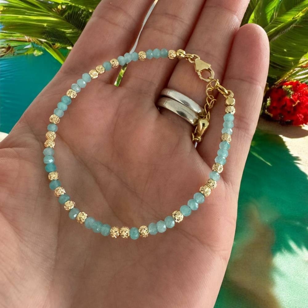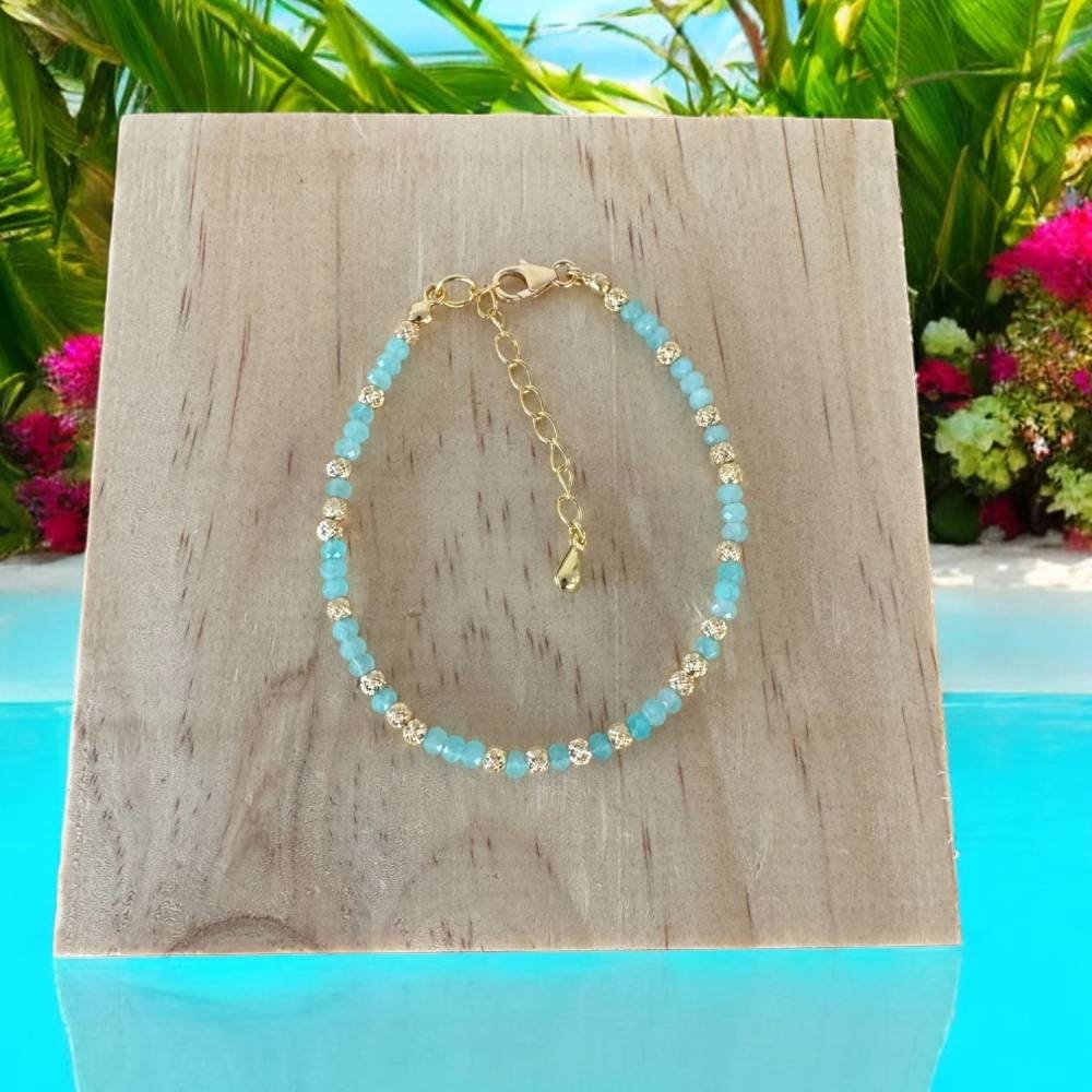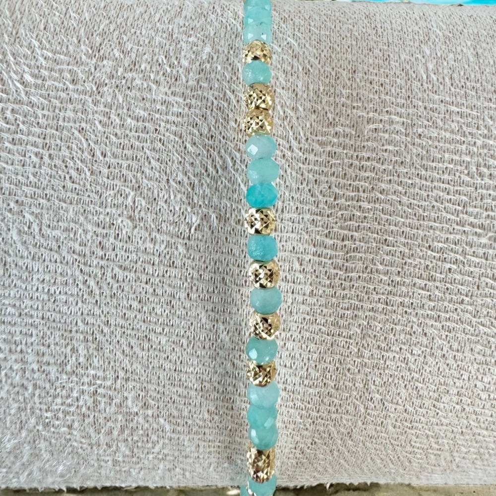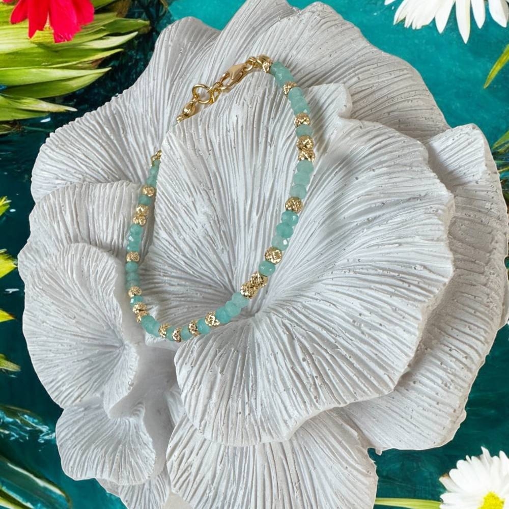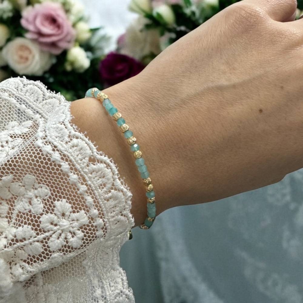 Imbinarea culorii albastre a Amazonitului cu luciul placut al argintului placat cu aur face ca bratara Nabila sa fie un accesoriu versatil si deosebit. Amazonitul nu este doar un cristal frumos, ci si unul cu semnificatii puternice – asociat cu dezvoltarea personala, echilibrul emotional si comunicarea sincera.