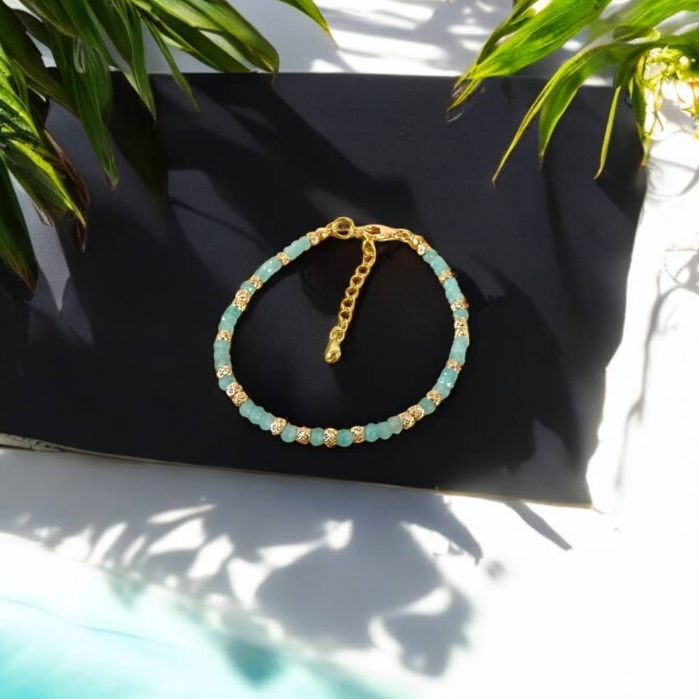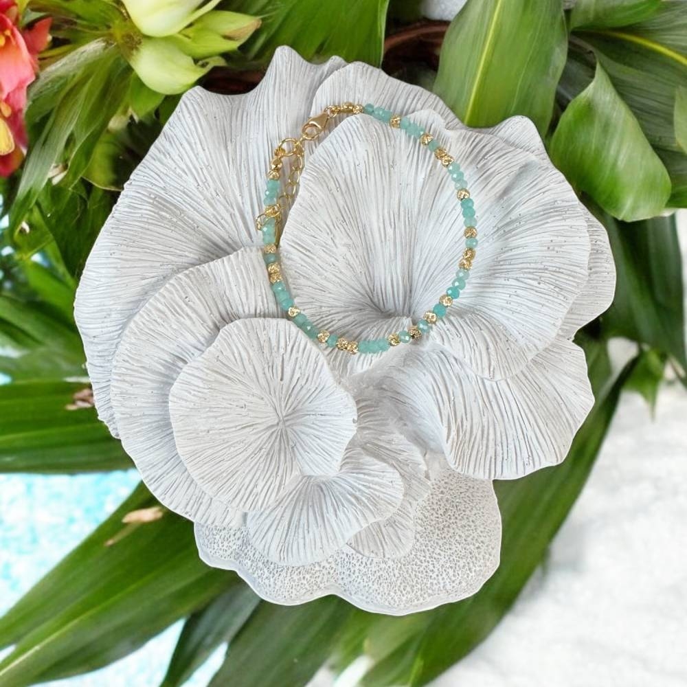 Bratara Nabila este o poveste. Realizata cu cristale de Amazonit si argint placat cu aur 925, fiecare detaliu al acestei bratari este conceput pentru a reflecta feminitatea si delicatetea unei femei moderne. Cristalul de Amazonit, cunoscut pentru energia sa calmanta si echilibrata, adauga un strop de liniste interioara, in timp ce stralucirea subtila a argintului placat cu aur creeaza o armonie perfecta intre natura si eleganta.