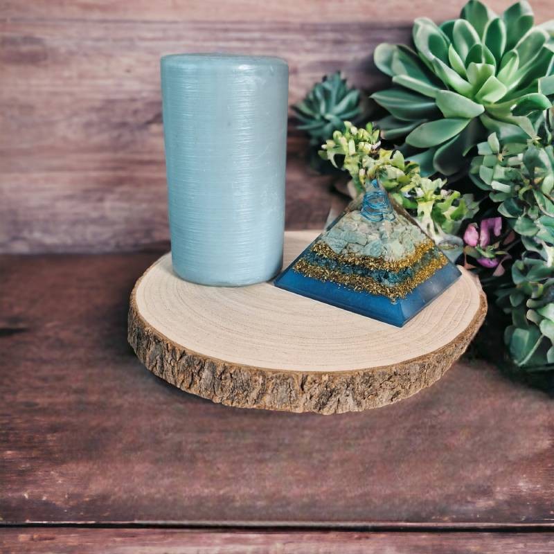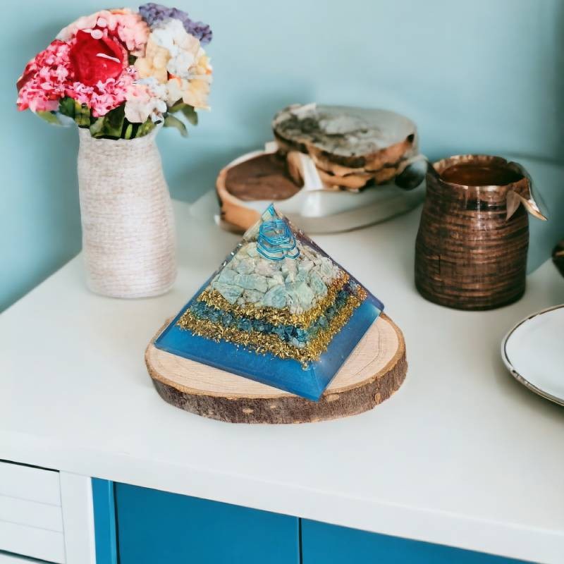 Amazonitul, cunoscut pentru proprietatile sale calmante si linistitoare, este integrat perfect in aceasta piramida de orgonit. Promoveaza echilibrul emotional si risipeste energiile negative, creand o atmosfera de liniste si seninatate.