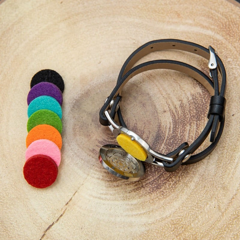 Pachetul contine saculetul de catifea, bratara dubla cu medalion Mandala de 25mm si cele 8 discurile colorate de fetru pe care se pun uleiurile esentiale sau parfumul preferat.