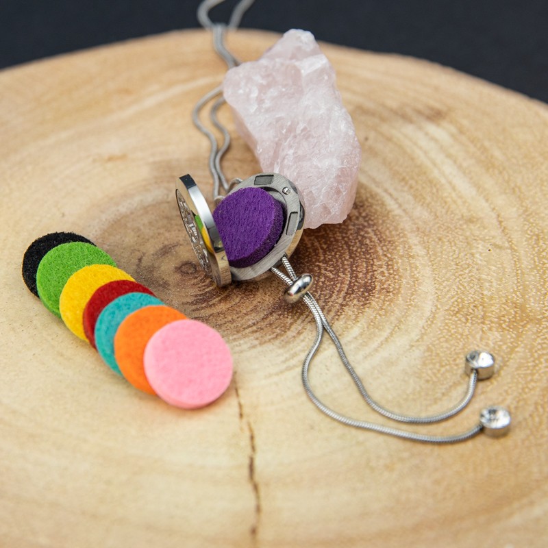 In interiorul medalionului COPACUL VIETII, prevazut cu inchidere magnetica, se introduce unul din cele 8 paduri de fetru pe care se pune uleiul esential. Datorita culorilor variate ale acestor paduri, setul poate fi asortat usor la orice tinuta.