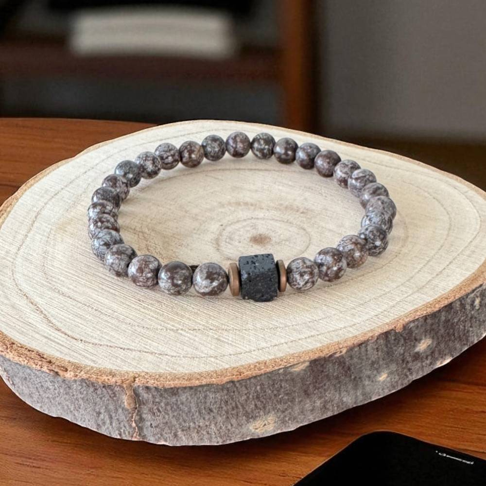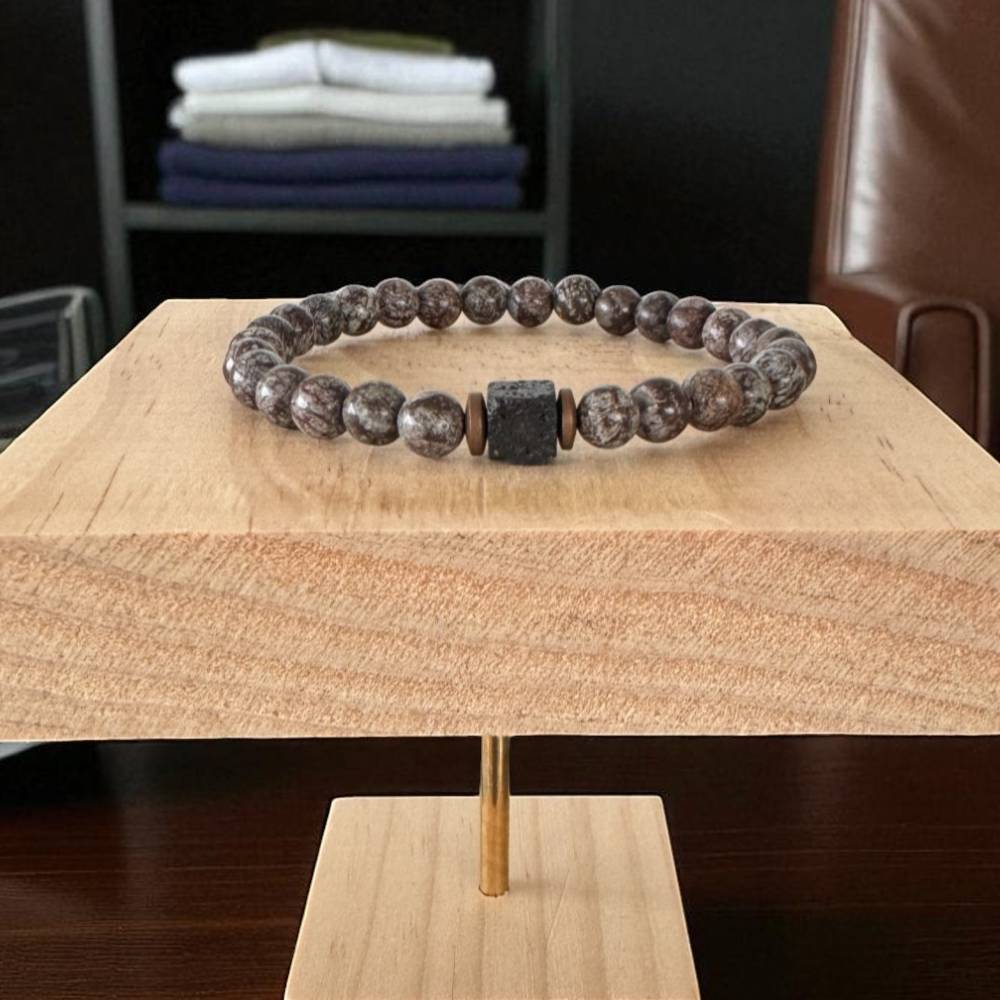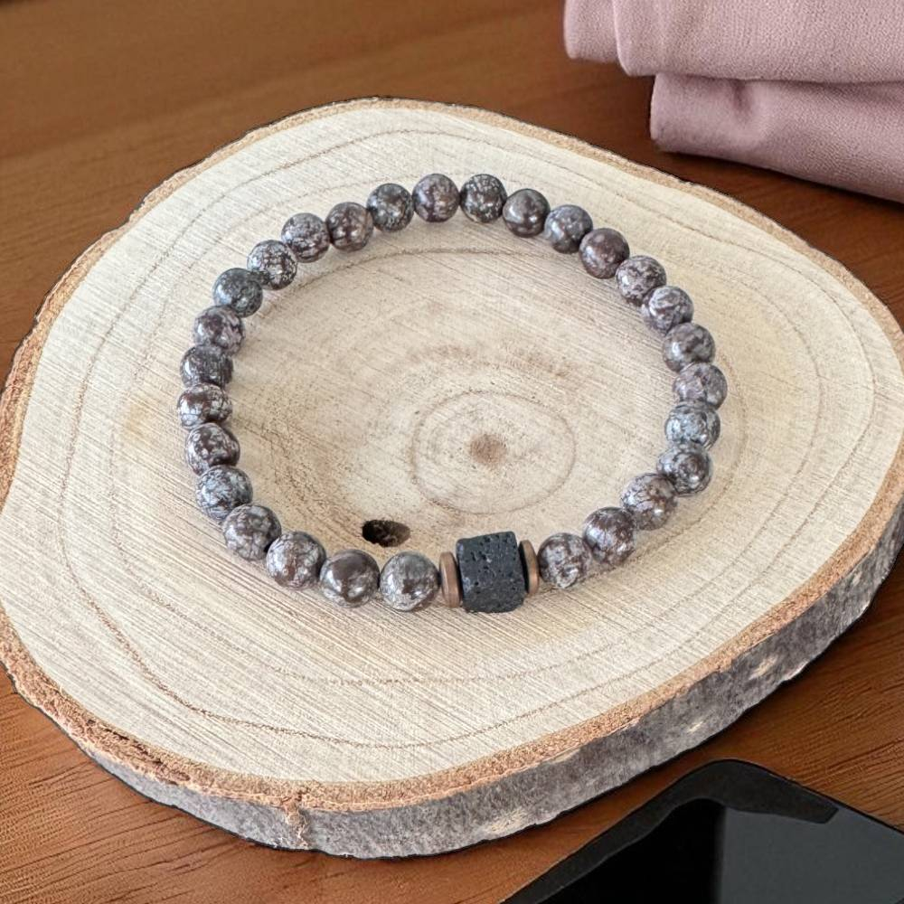 Bratara Alaric, un accesoriu care uneste doua forte primordiale ale naturii. Cristalele de obsidian Snow Flake maro se impletesc cu piatra de lava intr-o simfonie vizuala care captiveaza privirea si intareste spiritul.