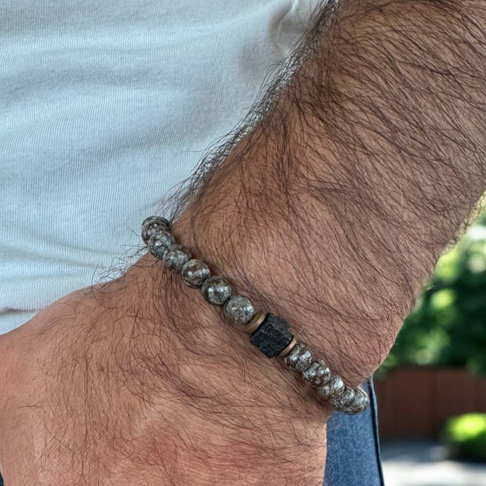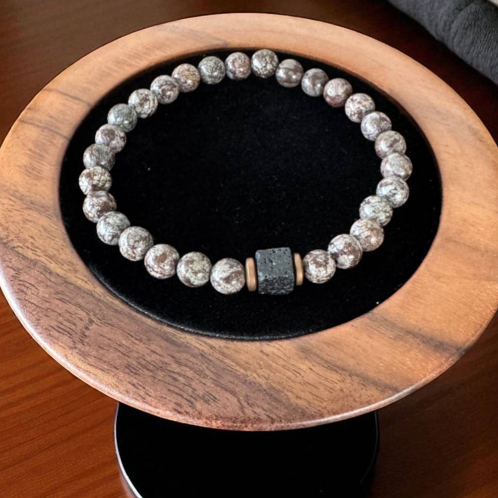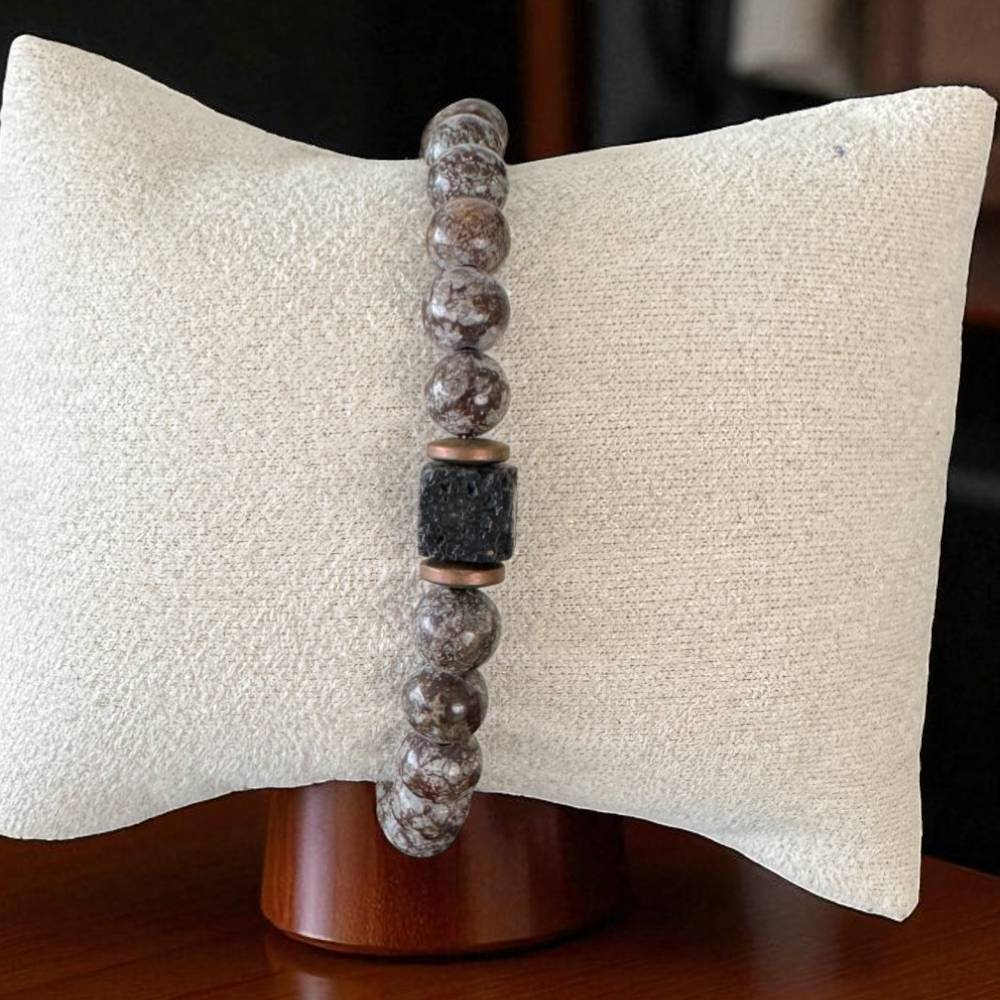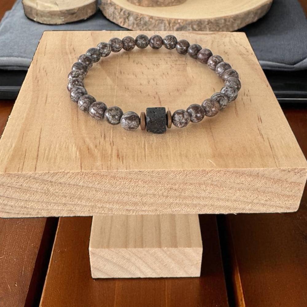 Bratara Alaric, un accesoriu care uneste doua forte primordiale ale naturii. Cristalele de obsidian Snow Flake maro se impletesc cu piatra de lava intr-o simfonie vizuala care captiveaza privirea si intareste spiritul.