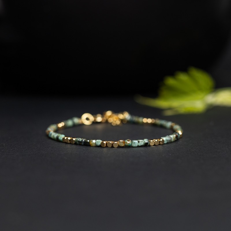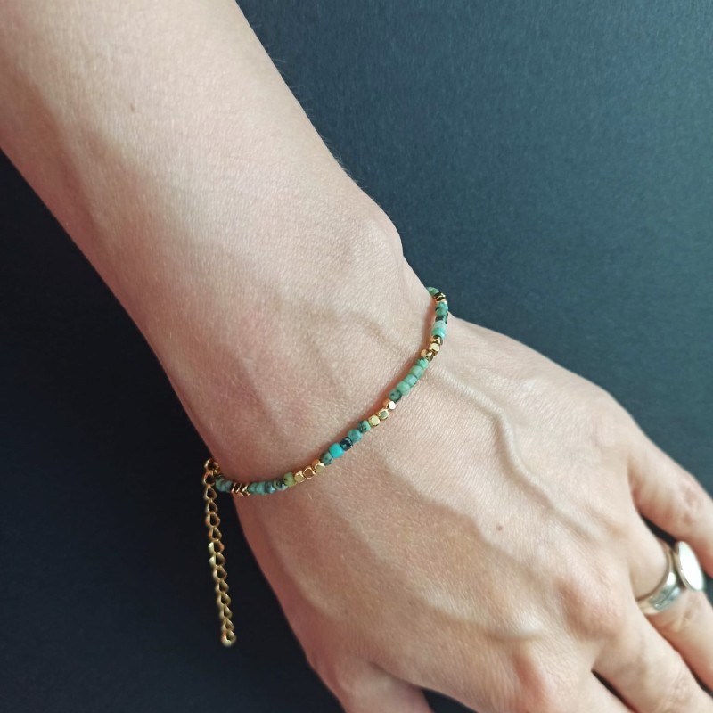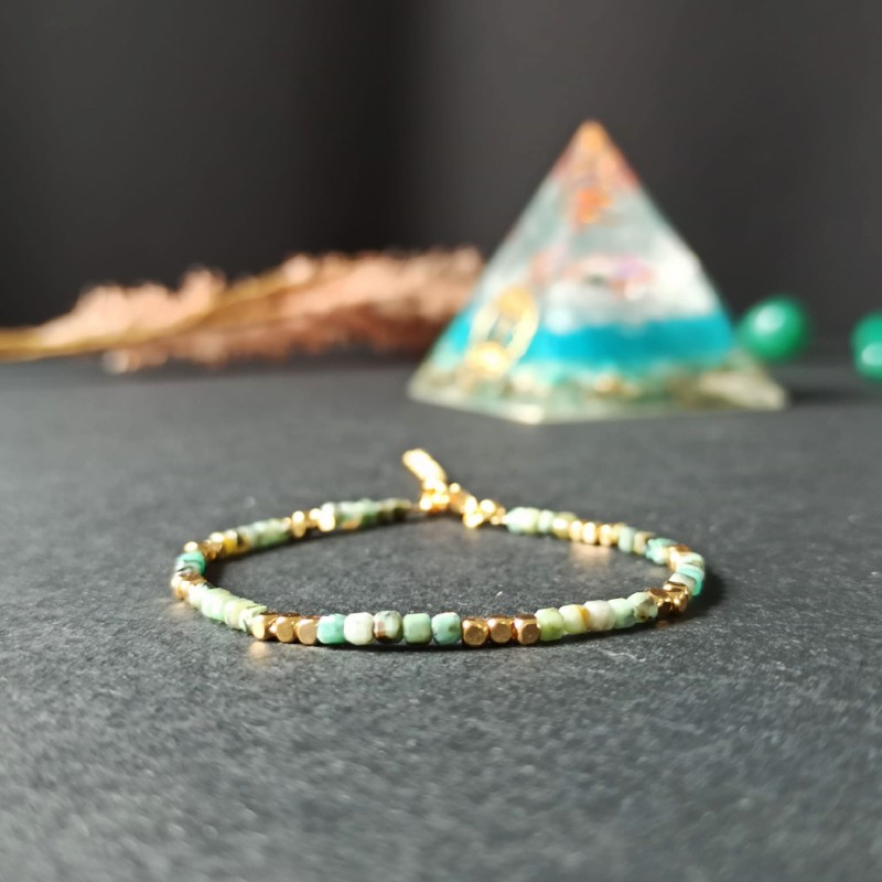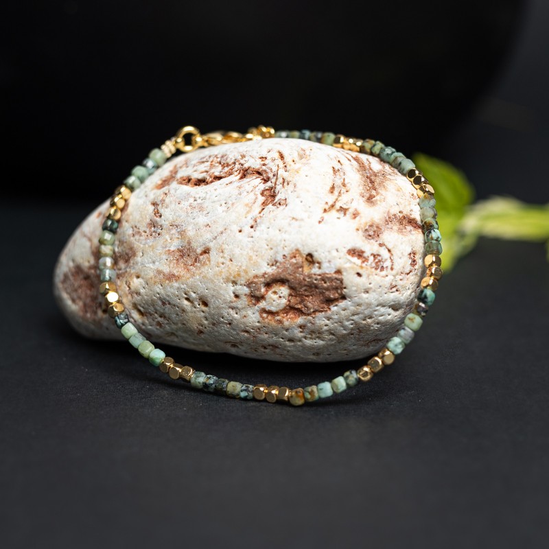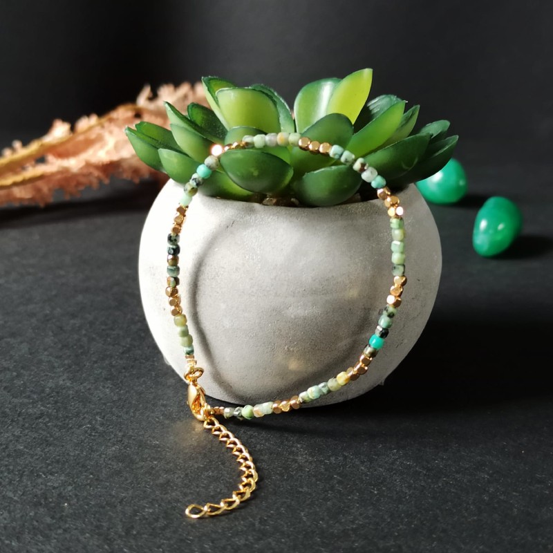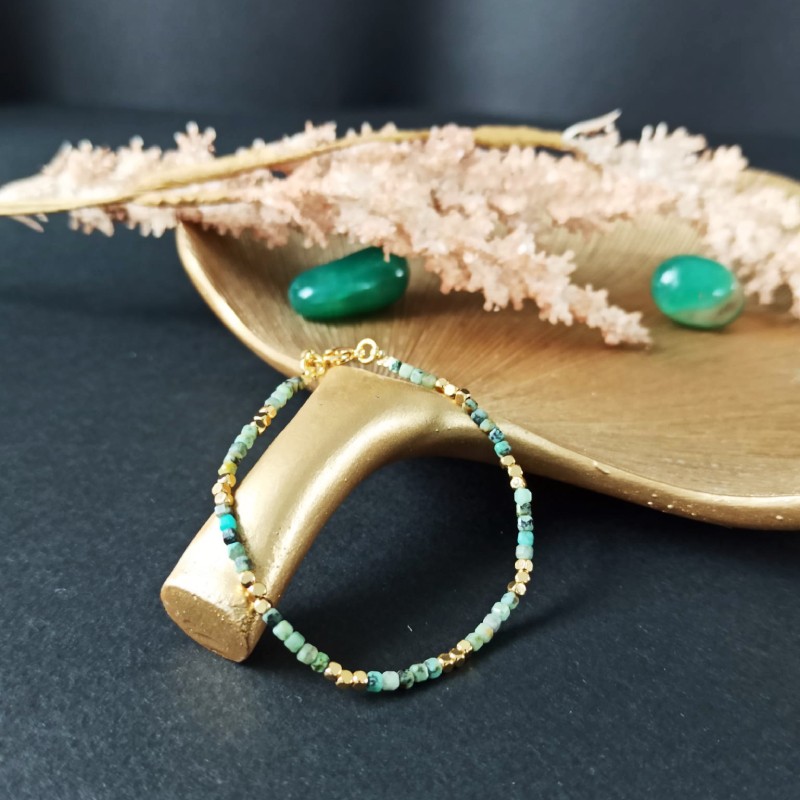 Cauti un cadou pentru o persoana draga sau vrei chiar tu sa-ti accesorizezi tinuta cu o bratara din pietre semipretioase delicata? Daca esti o fana a cristalului Crisocola sau pur si simplu te atrag nuantele de verde ale pietrei, bratara boho placata cu aur poate fi alegerea ta.
