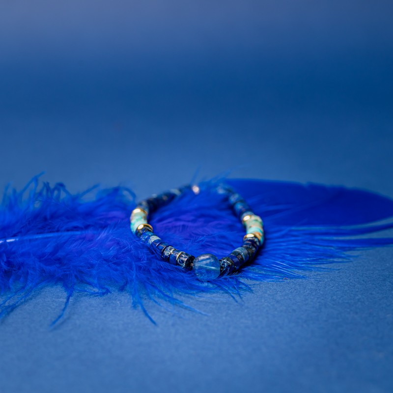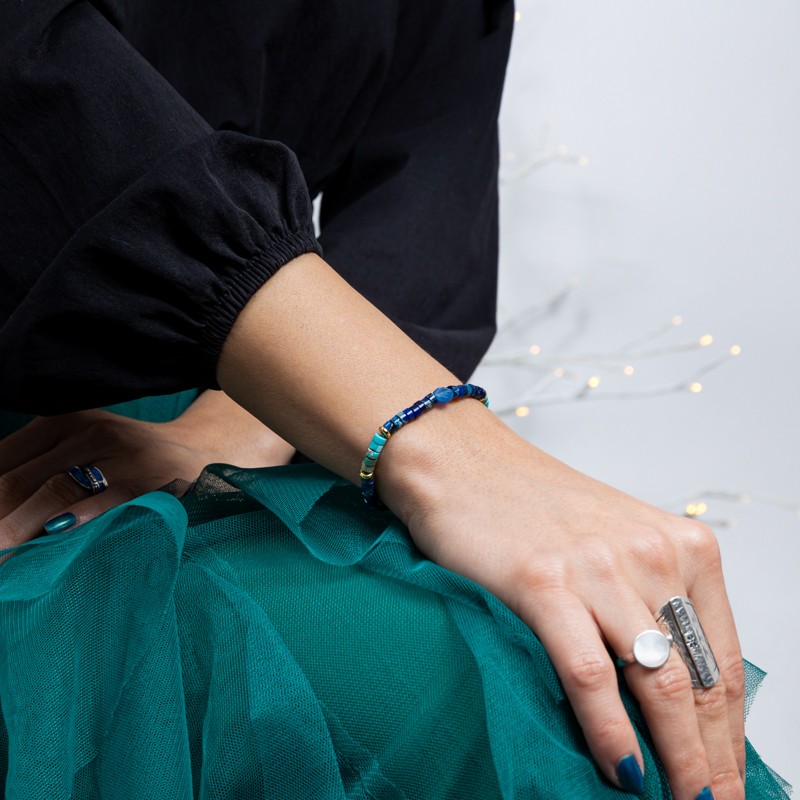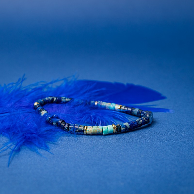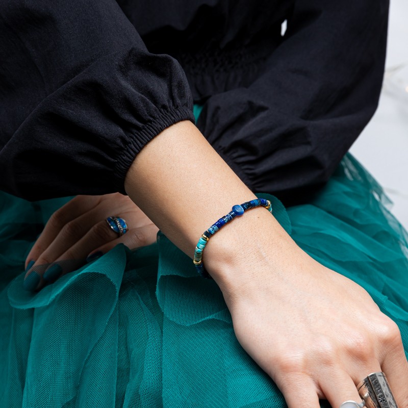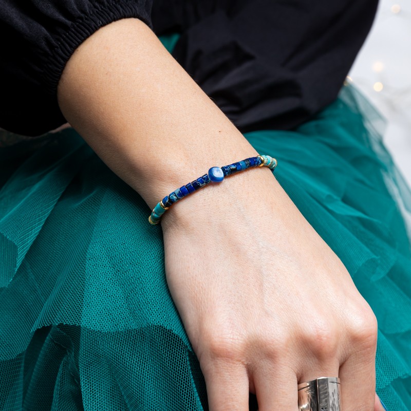 Nirmay este o bratara fabricata manual care va intoarce cu siguranta multe capete :) Bratara este realizata din rondele de Sediment Marin de Jasp bleumarin si turcoaz cu accesorii aurii pentru a-i oferi un aspect unic si atragator. Combinatia acestor culori va evidentia cu siguranta frumusetea incheieturii tale.