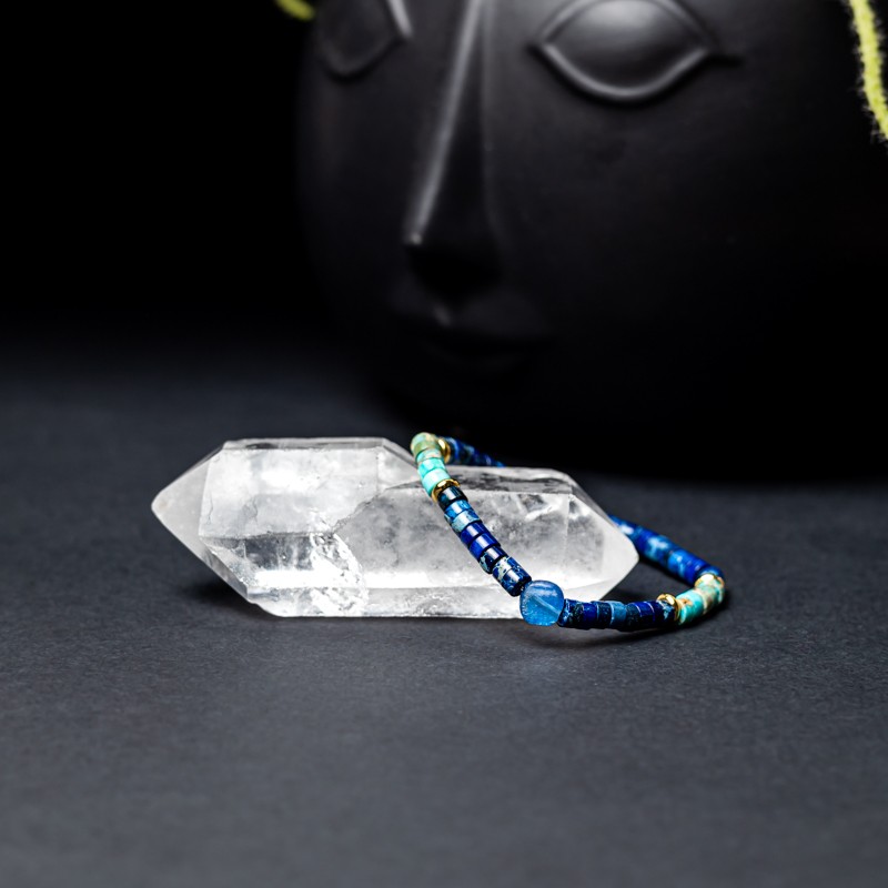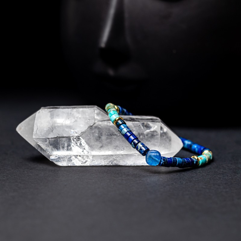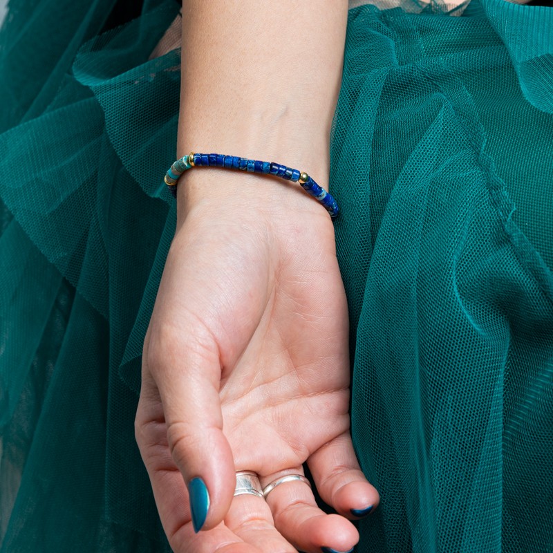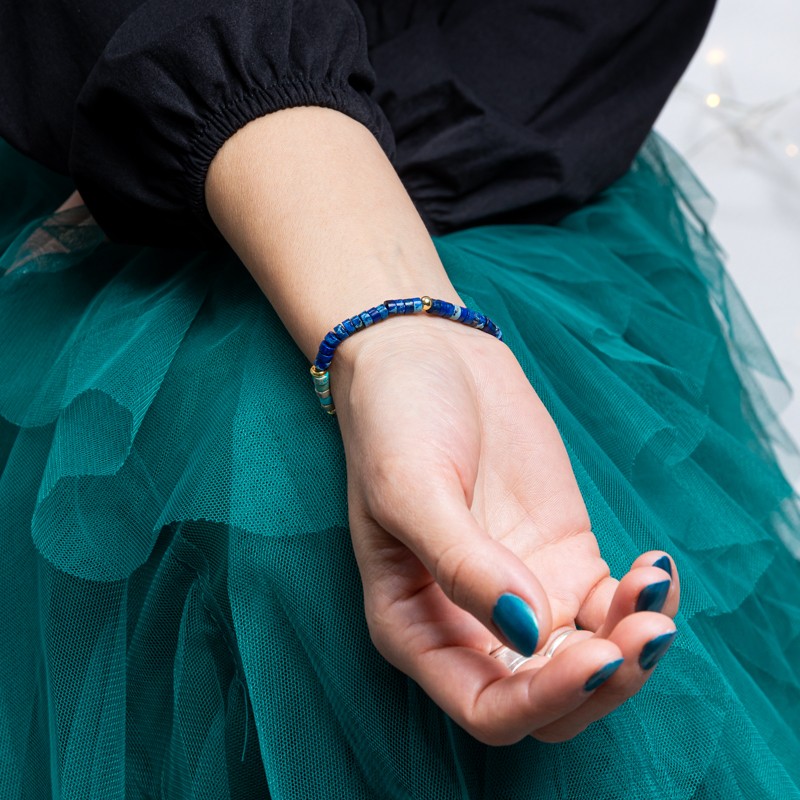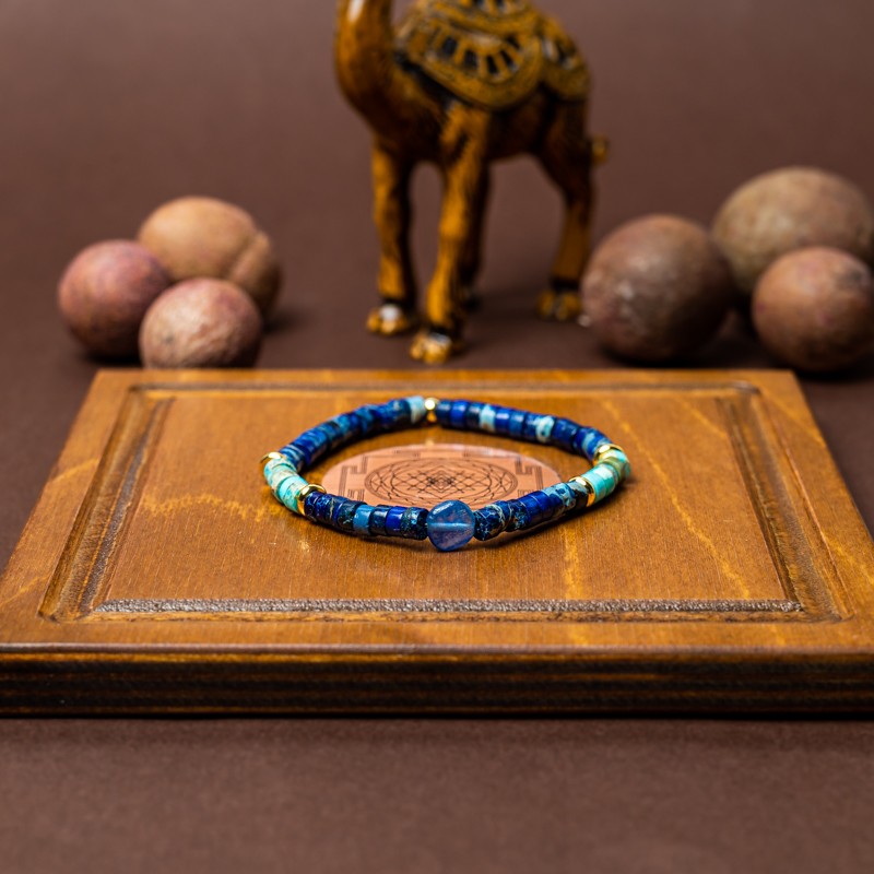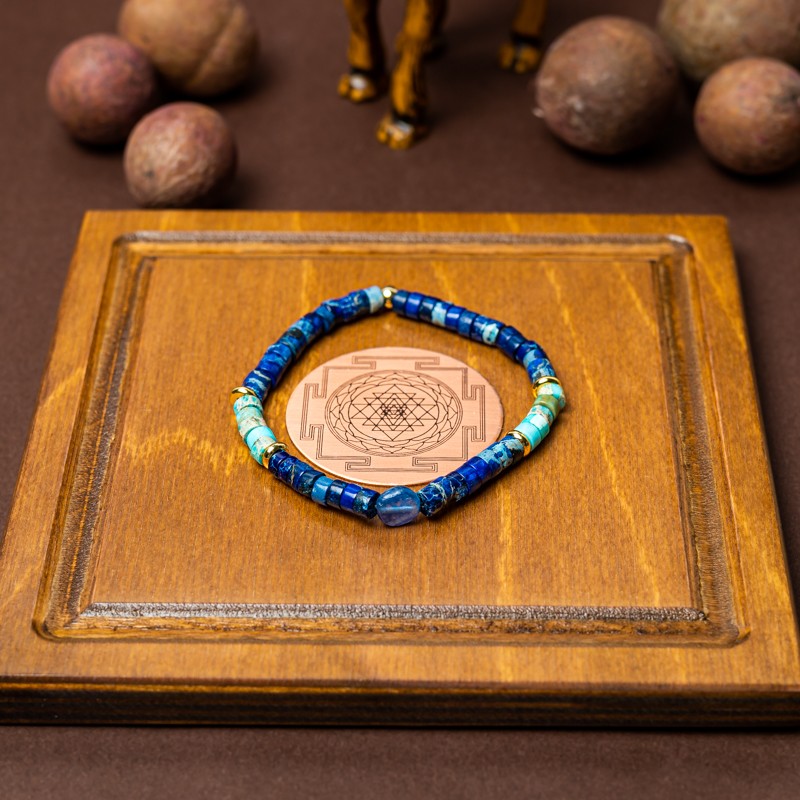 Nirmay este o bratara fabricata manual care va intoarce cu siguranta multe capete :) Bratara este realizata din rondele de Sediment Marin de Jasp bleumarin si turcoaz cu accesorii aurii pentru a-i oferi un aspect unic si atragator. Combinatia acestor culori va evidentia cu siguranta frumusetea incheieturii tale.