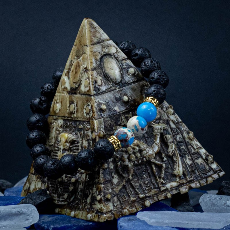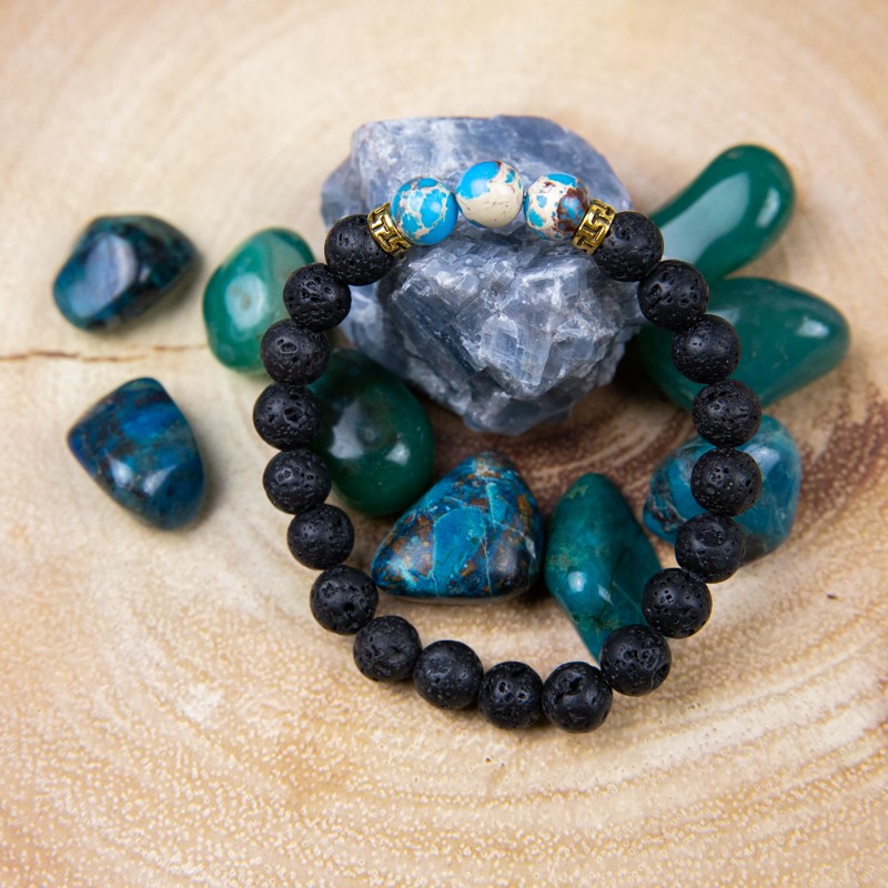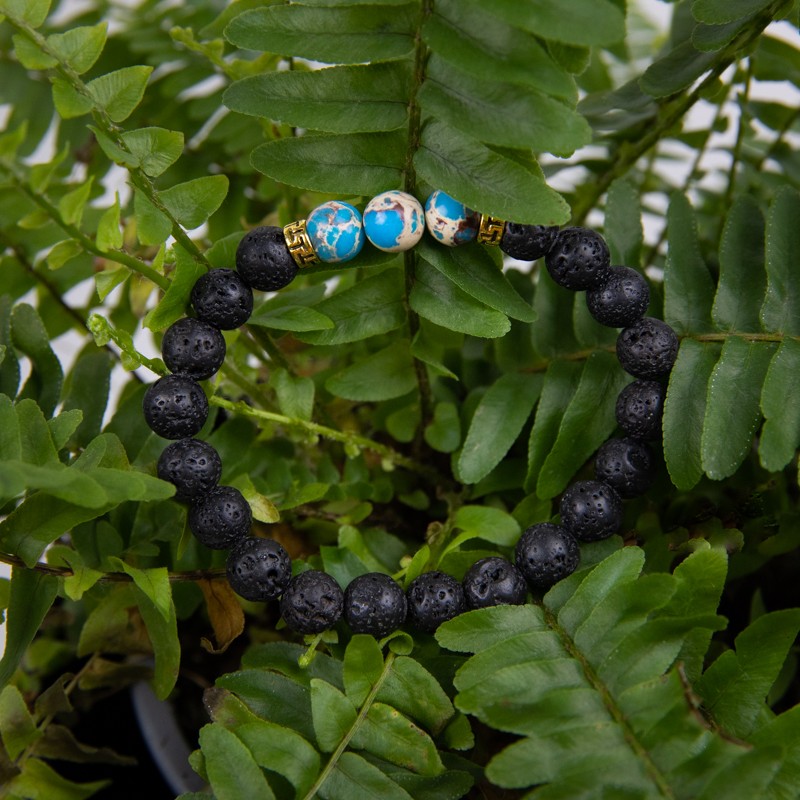 Esti o iubitoare a culorii turcoaz si iti doresti un accesoriu in aceasta culoare? Bratara „Azur” imbina armonios margelele din piatra de lava cu albastrul marin al margelelor de turcoaz.