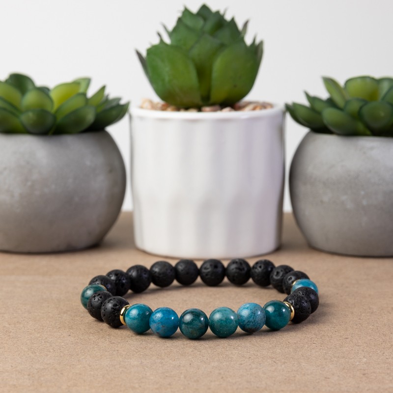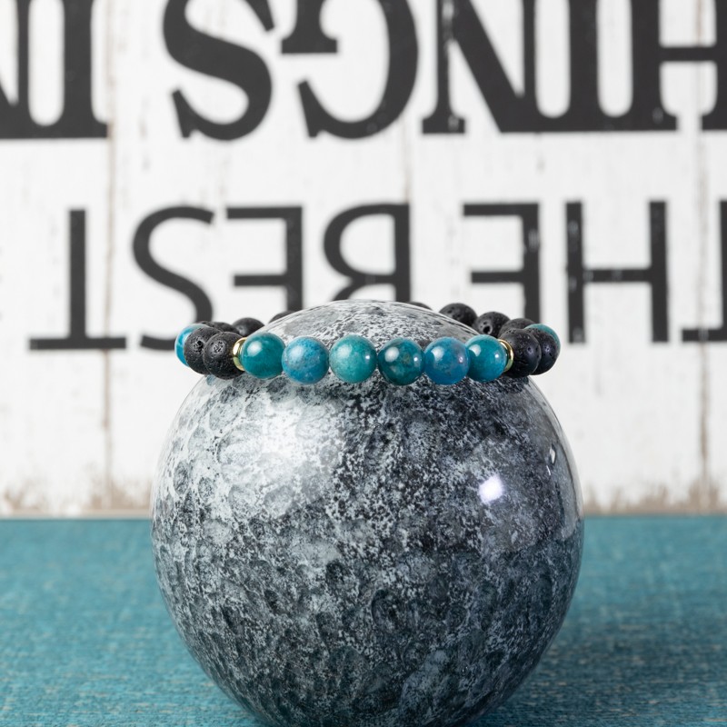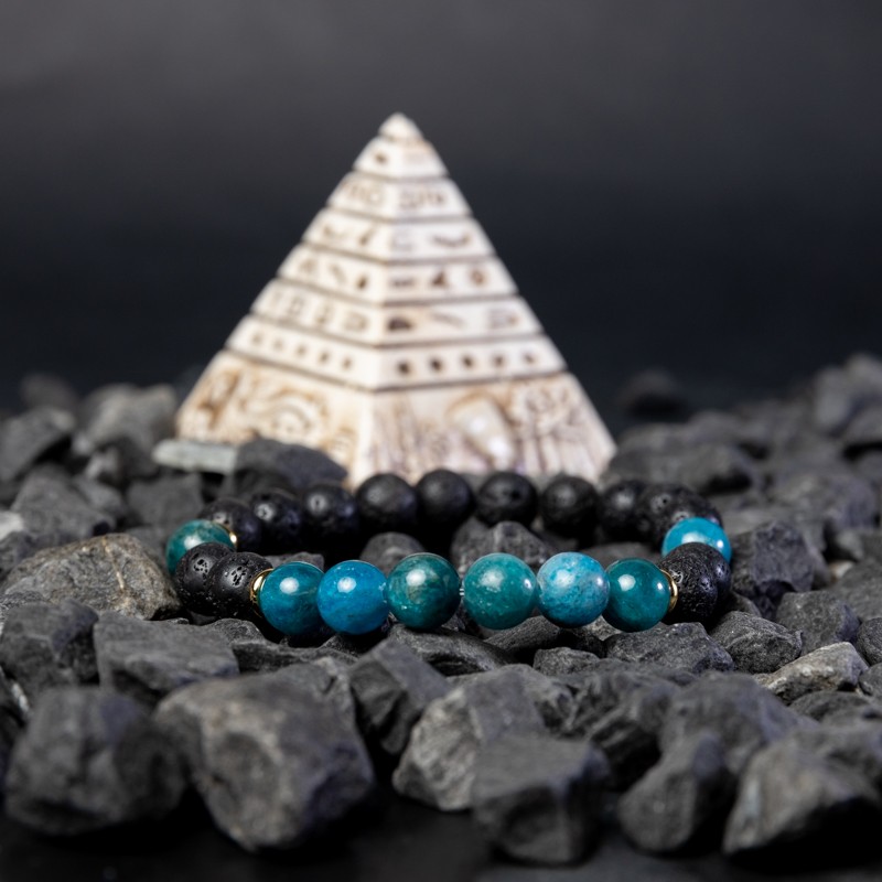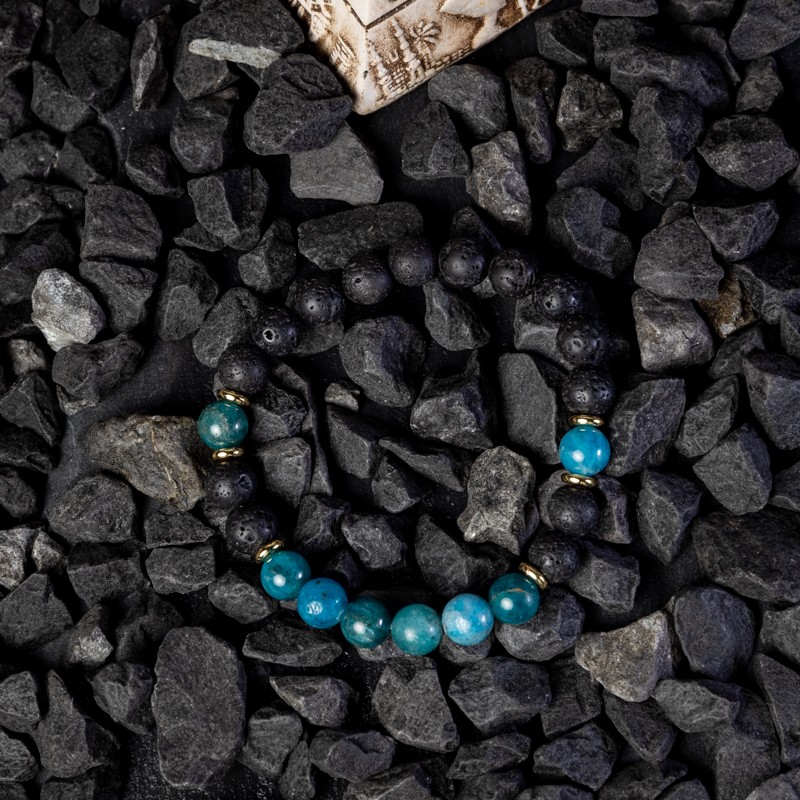 Poarta cu tine bratara Nimit si beneficiaza de energia si puternica semnificatie a cristalelor de Apatit si a Rocilor de Lava.