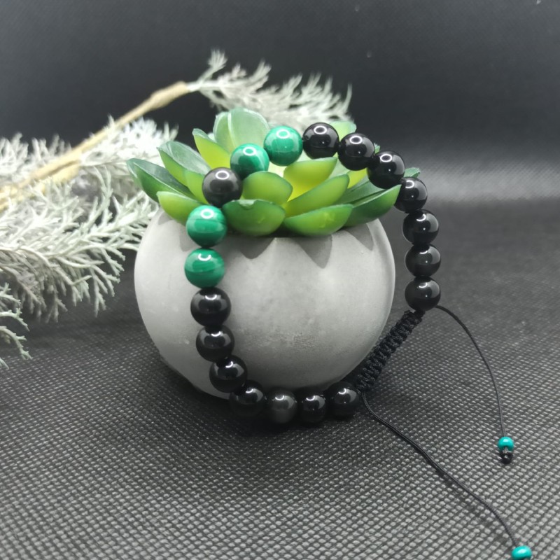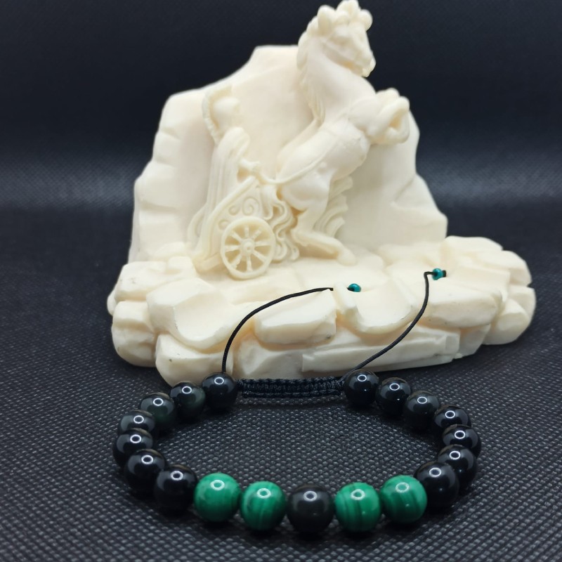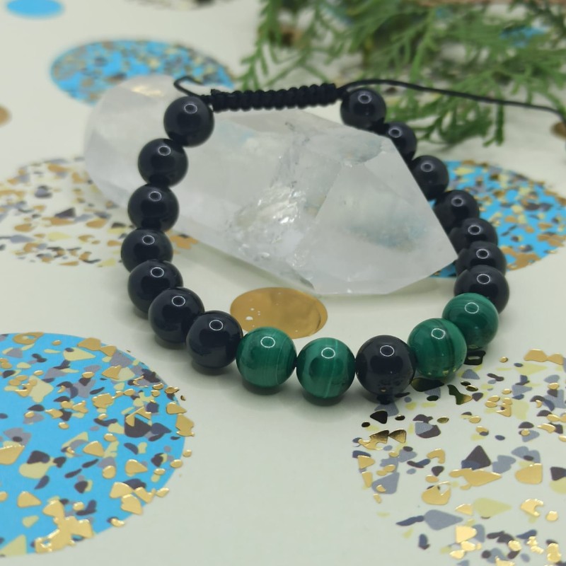 Obsidianul Negru ofera protectie impotriva energiilor negative si a atasamentelor, in timp ce energia verde si vibranta a Malachitului aduce dragoste, pace, bunatate si autocontrol. Se spune ca, cristalul de Malachit topeste modelele de energie constrictiva din aura si corpul fizic, aducand o viata imbunatatita si forta in intregul corp.