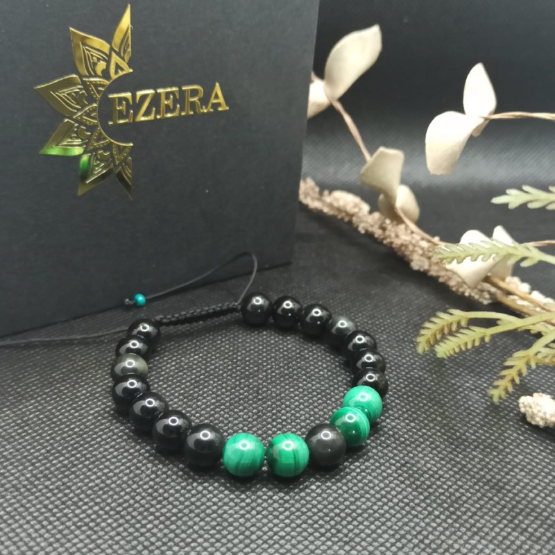 Combinand elementele Pamantului si Focului, aceasta bratara puternica va oferi protectie psihica, impamantare si curatare de negativitate. Bratara cu cristale de Malachit si Obsidian imbunatateste in același timp increderea si creativitatea.