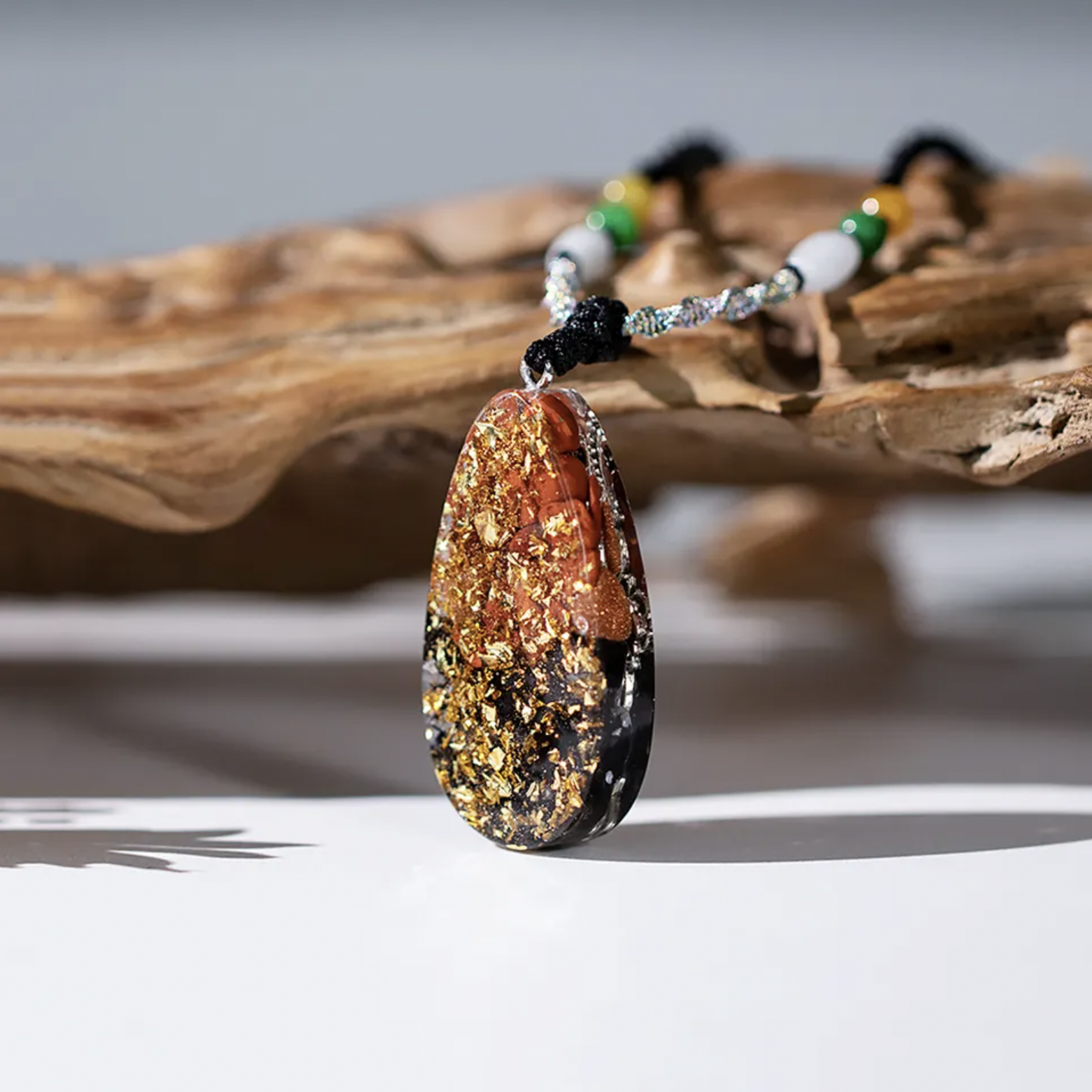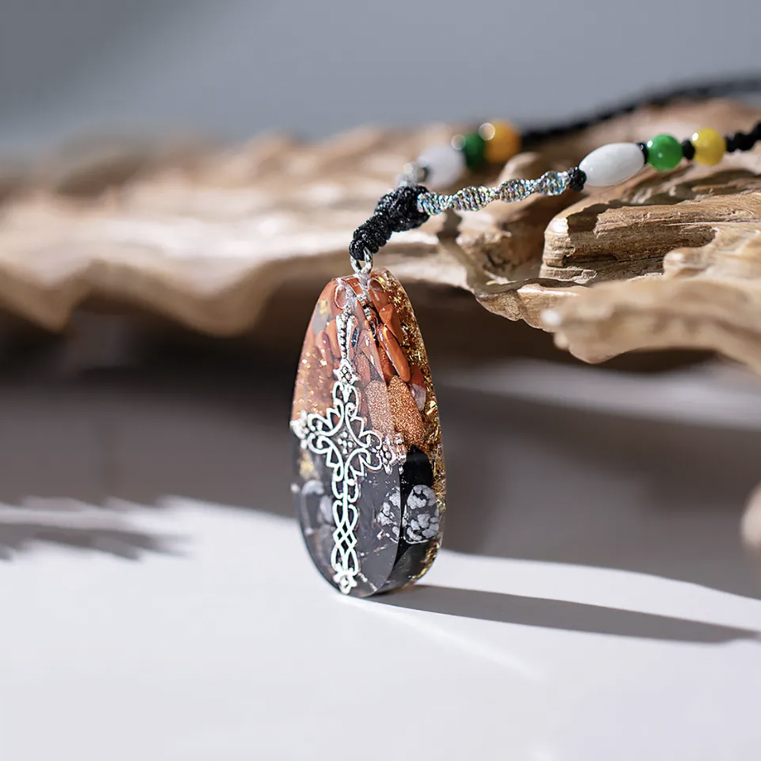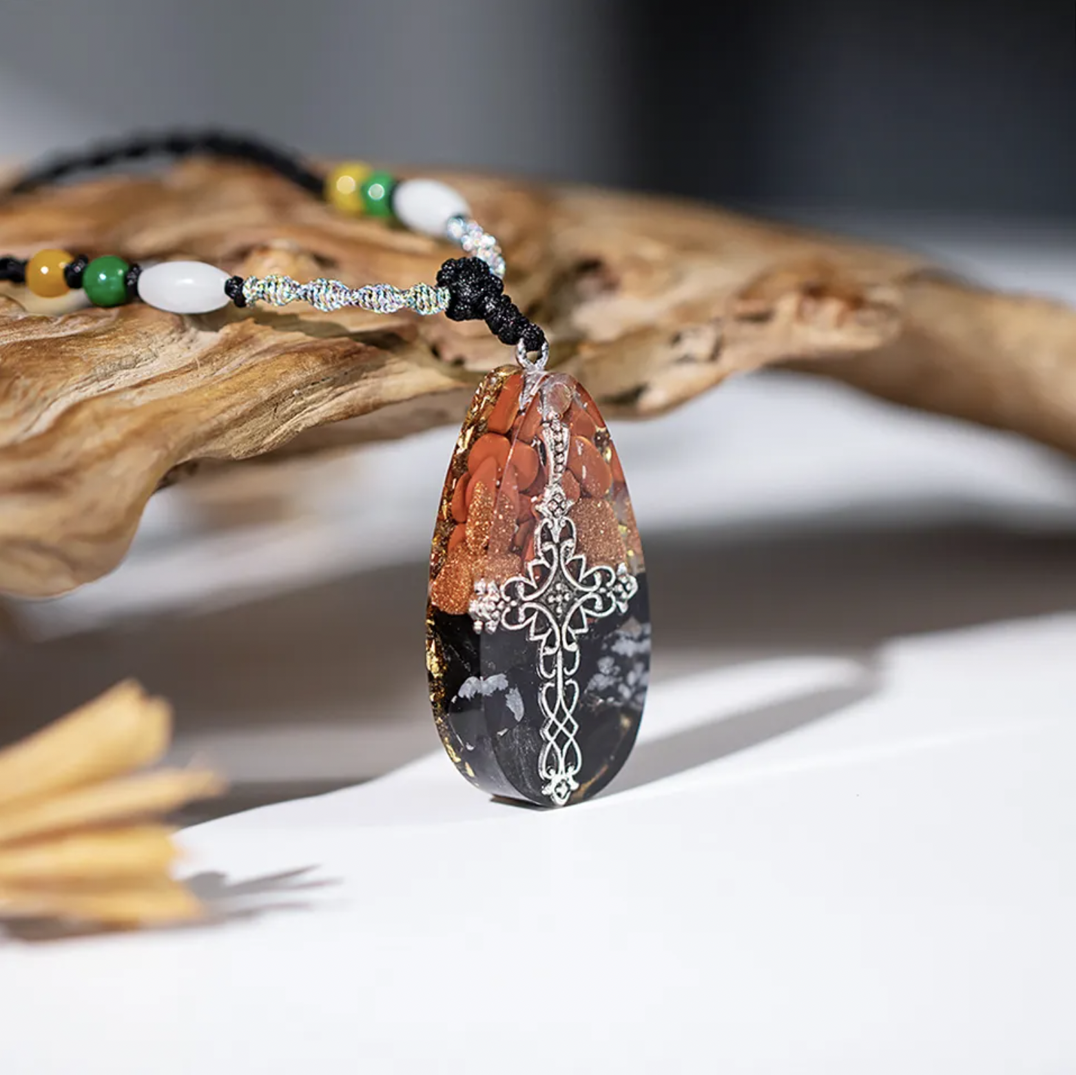 In timp ce privesti pandantivul orgonic, amestecul captivant de cristale de Obsidian, Jasp Rosu si Piatra Soarelui te va transporta in inima Egiptului antic, unde energia faraonilor si a zeilor inca rezoneaza. Obsidianul, cu alura sa profunda, intunecata, oglindeste misterele cosmosului si te invita sa explorezi adancurile sufletului tau.