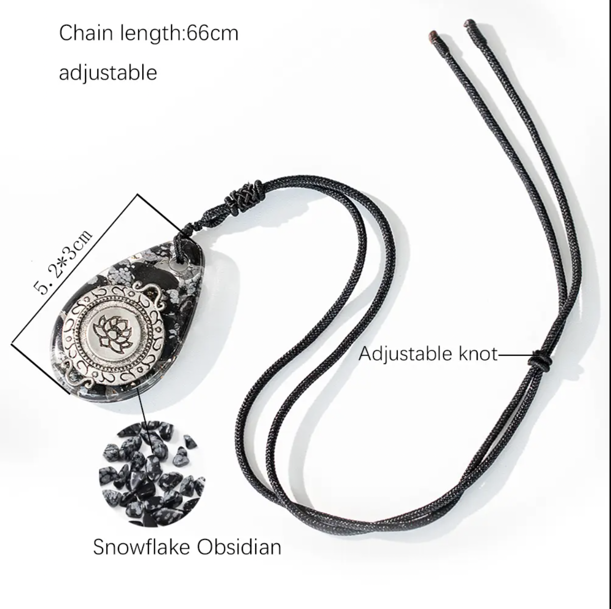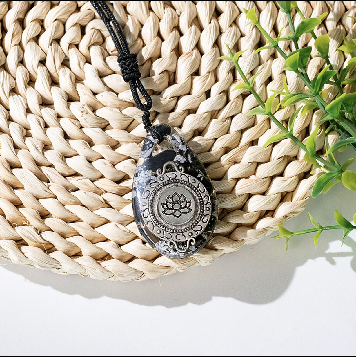 Descopera puterea transformarii interioare si echilibrul spiritual cu Pandantivul Orgonic din cristale de Obsidian Fulg de Nea, o bijuterie energetica inovatoare incrustata cu simbolul florii de Lotus, perfecta pentru practicile de meditatie si introspectie.