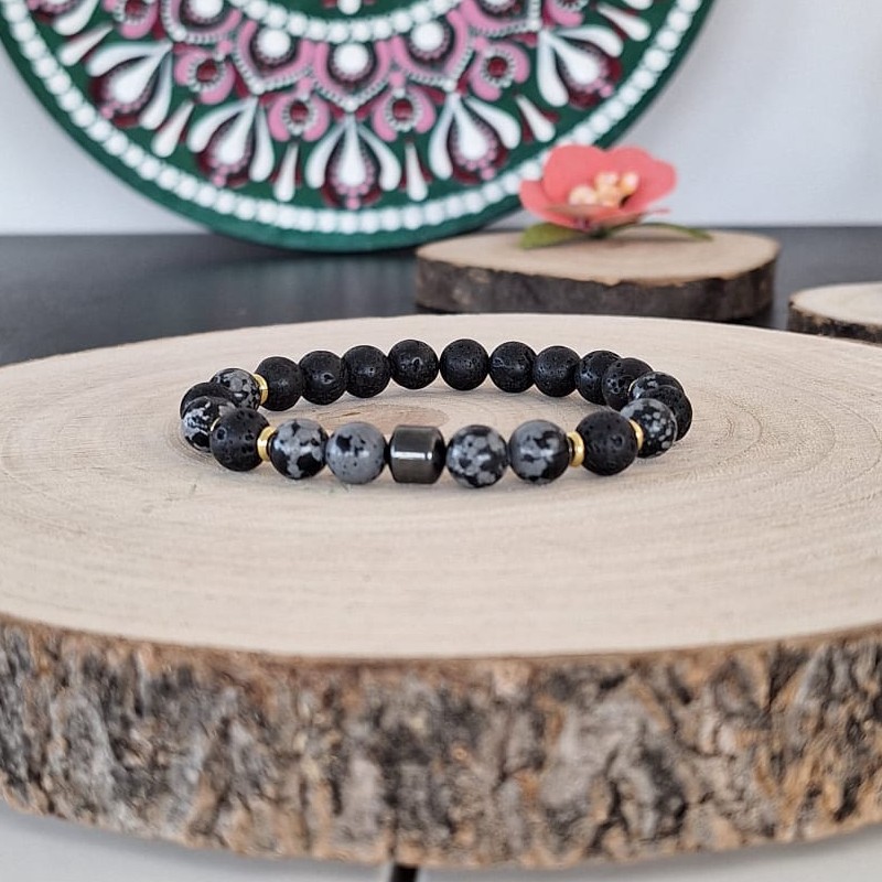 4. **Conexiune cu natura:** Elementele naturale ale bratarii – Hematitul, Obsidianul Snow Flake si Pietrele de Lava – servesc ca o conducta catre energia bruta a Pamantului. Oferind cadou aceasta bratara, il ajuti sa creeze o legatura mai profunda cu natura si cu intelepciunea ei atemporala.