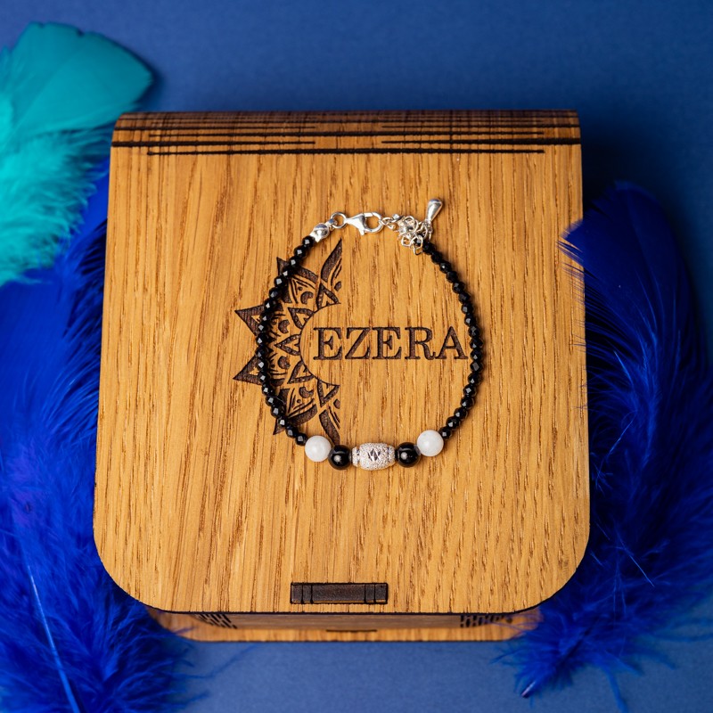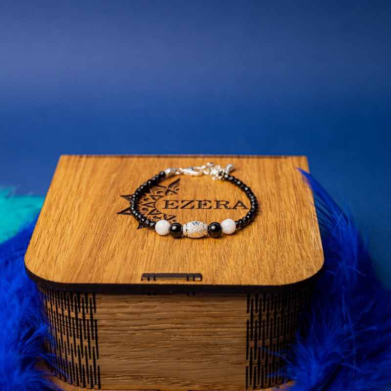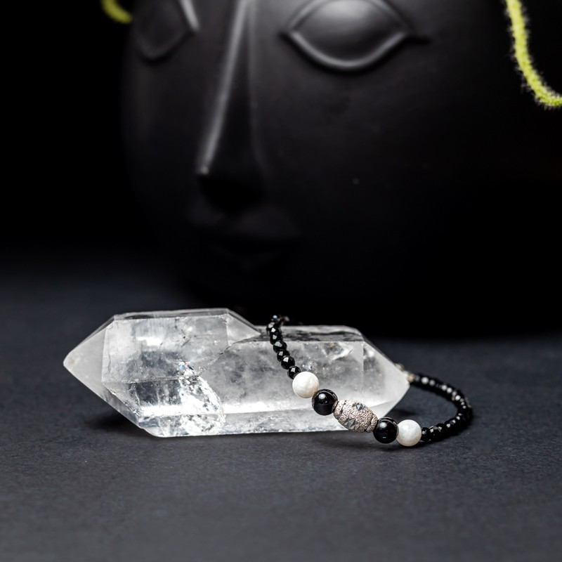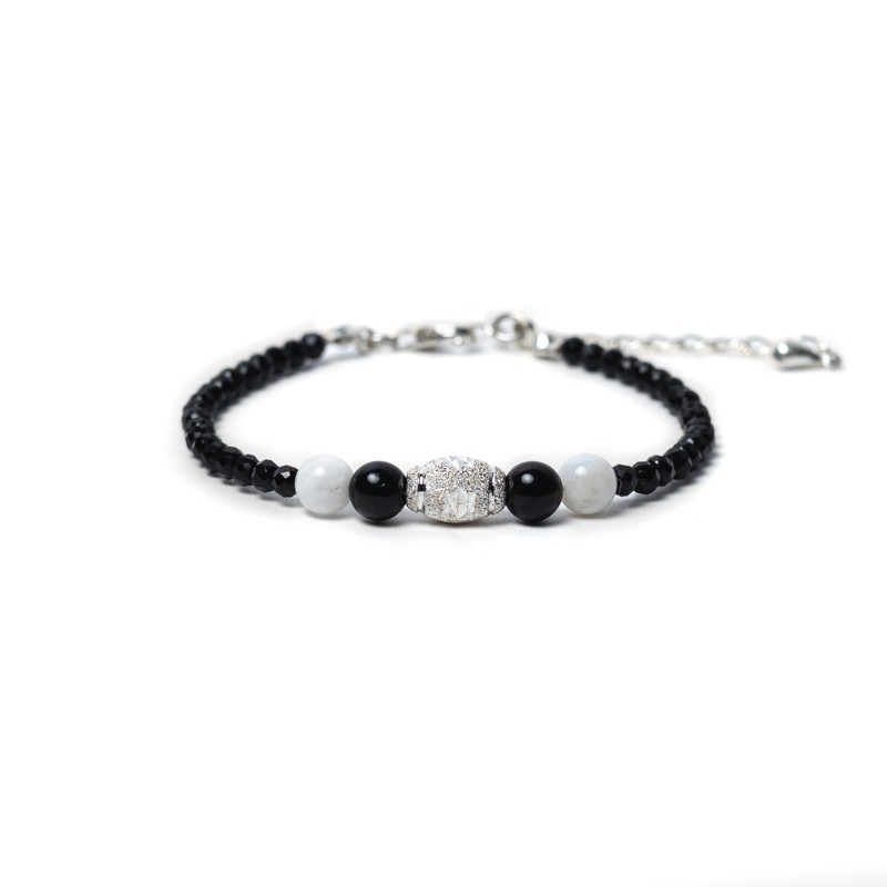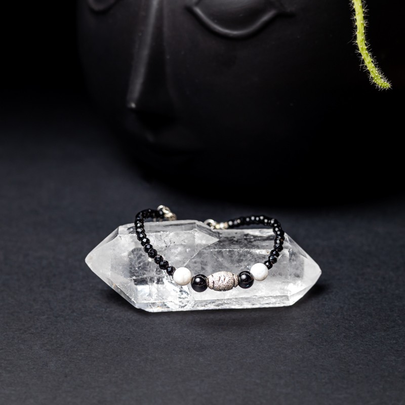 Bratara mai contine cristale de piatra lunii si turmalina neagra, margele de 6mm. Dimensiunea pietrelor de spinel fatetate este de 3 mm.