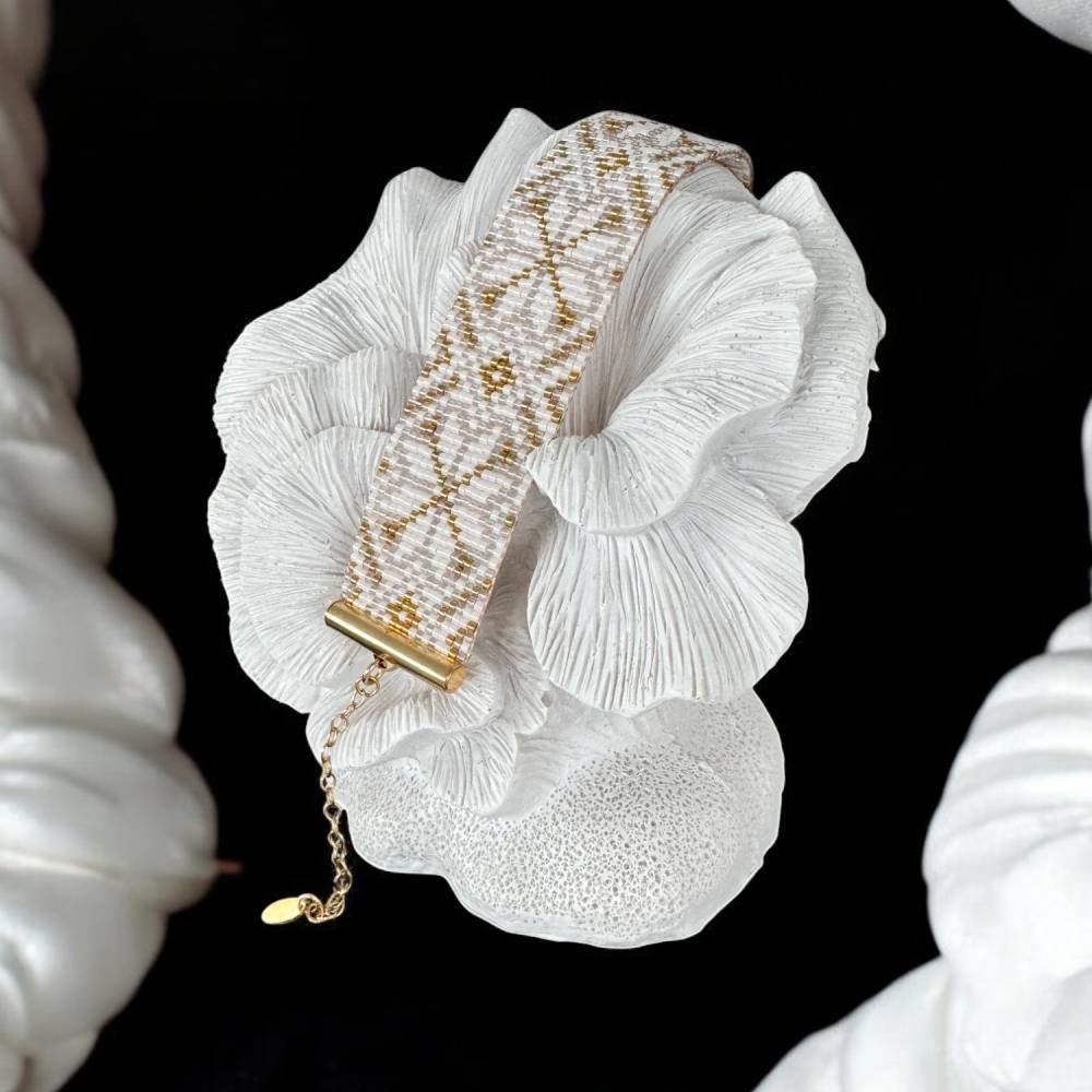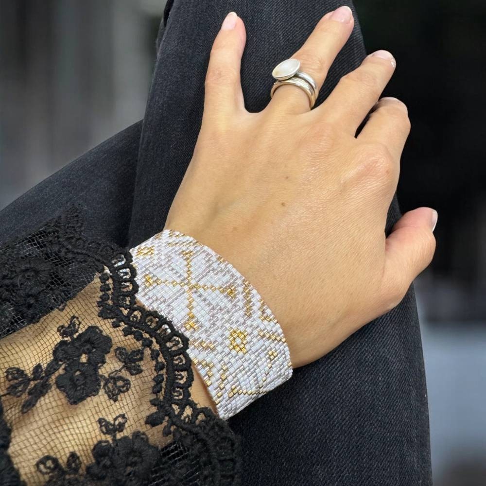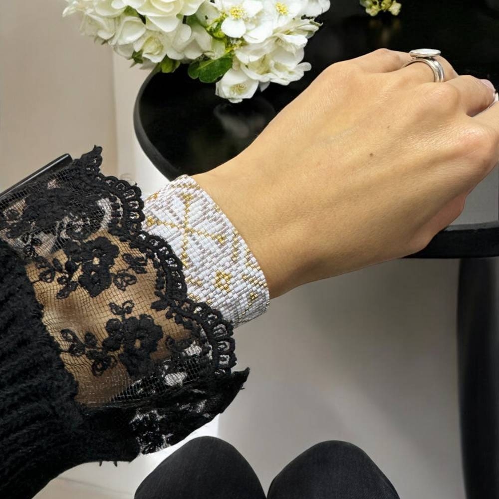 Simplitatea are un farmec aparte. Aceasta bratara handmade din margele Miyuki combina nuante neutre de alb si gri sidefat cu accente aurii care atrag subtil privirile. Este creata pentru femeile care iubesc eleganta fara efort, un accesoriu fin ce te poate insoti cu delicatete.