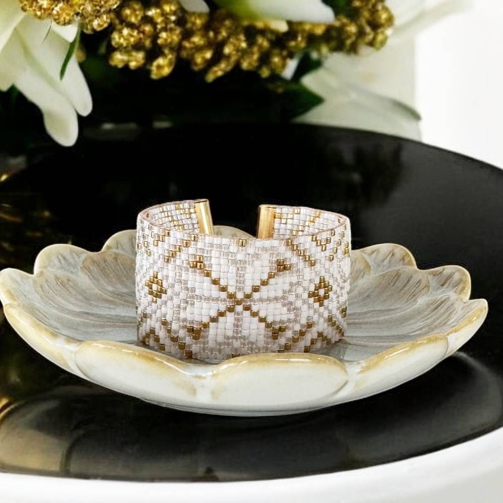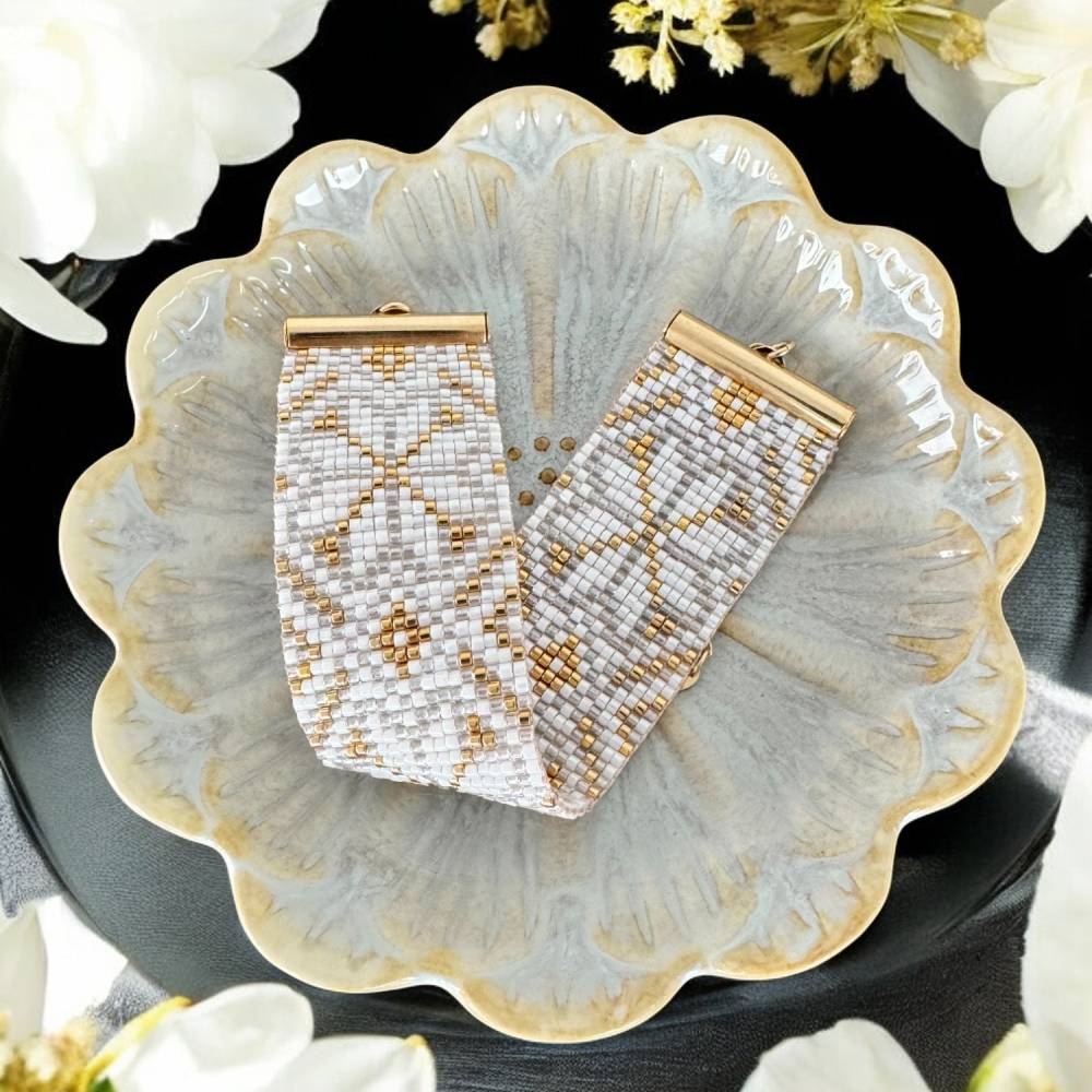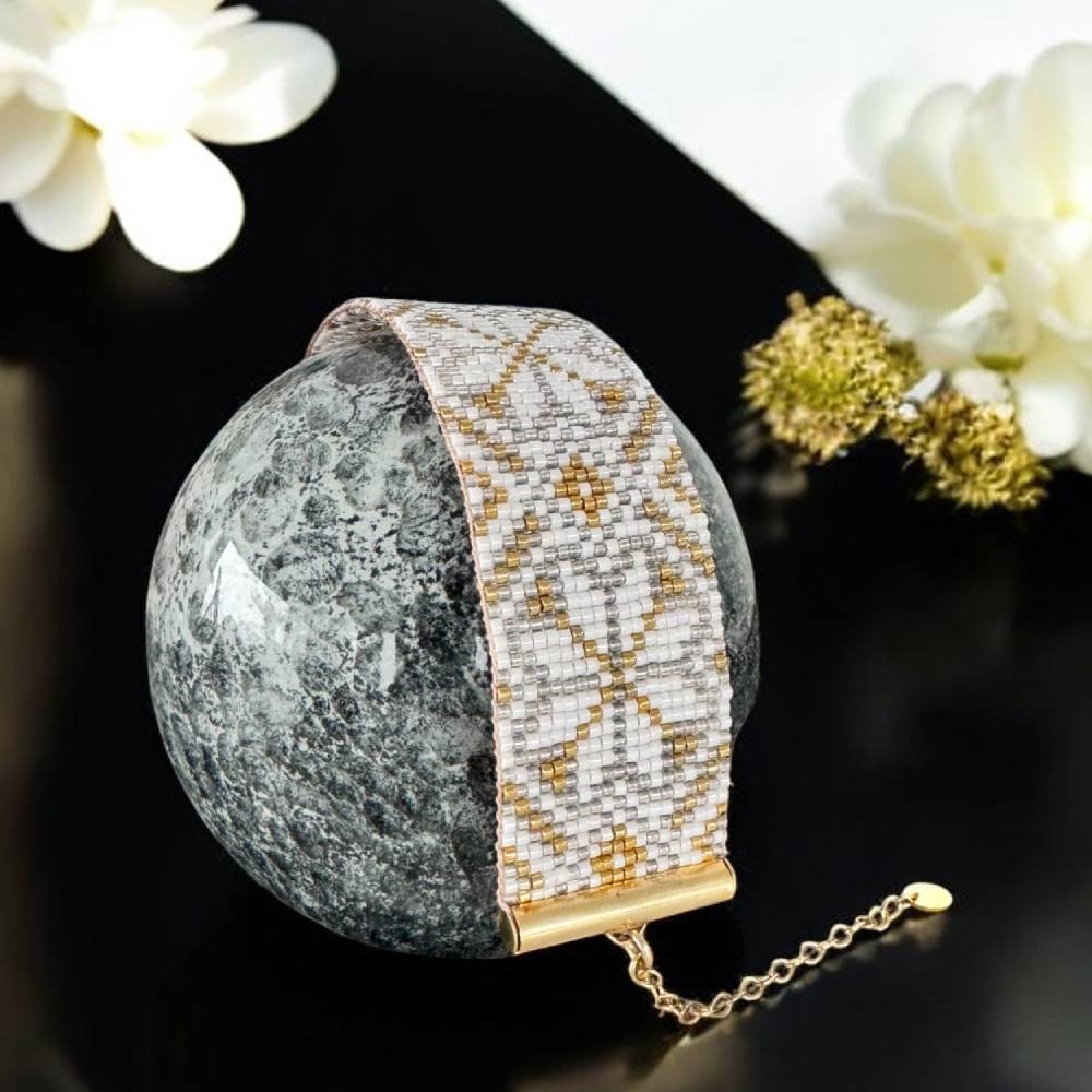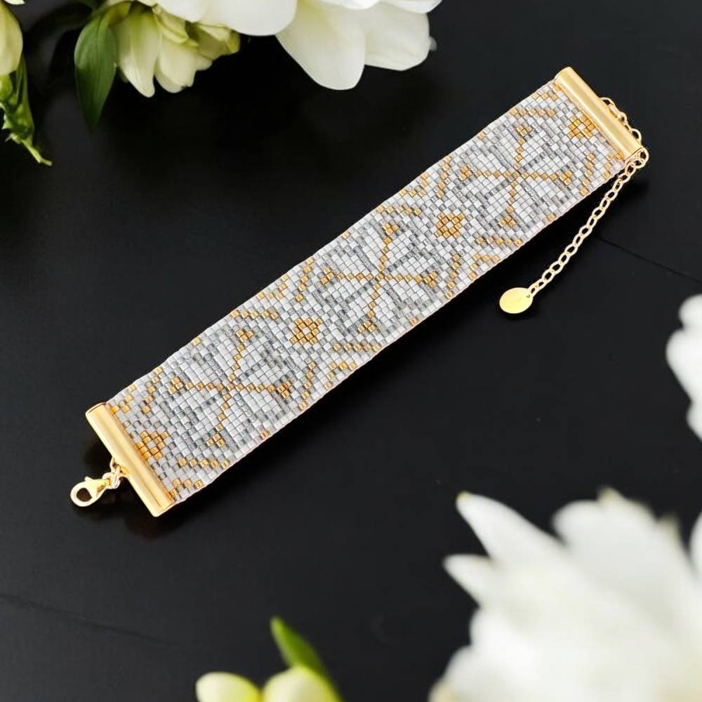 Simplitatea are un farmec aparte. Aceasta bratara handmade din margele Miyuki combina nuante neutre de alb si gri sidefat cu accente aurii care atrag subtil privirile. Este creata pentru femeile care iubesc eleganta fara efort, un accesoriu fin ce te poate insoti cu delicatete.