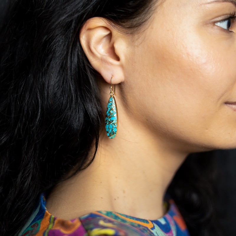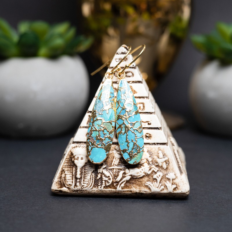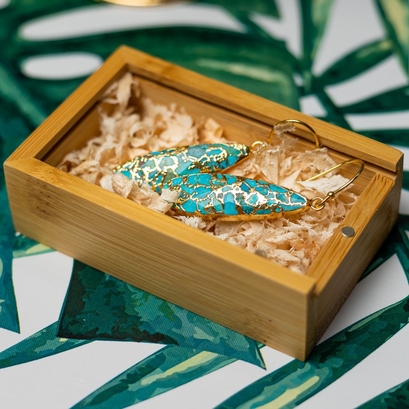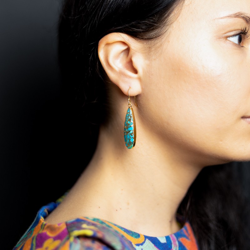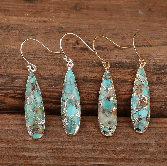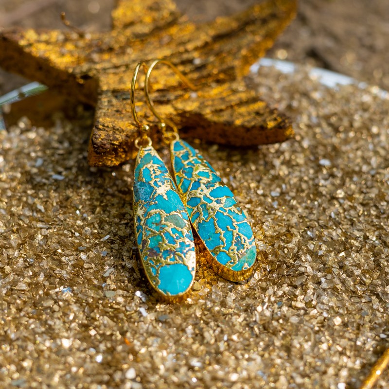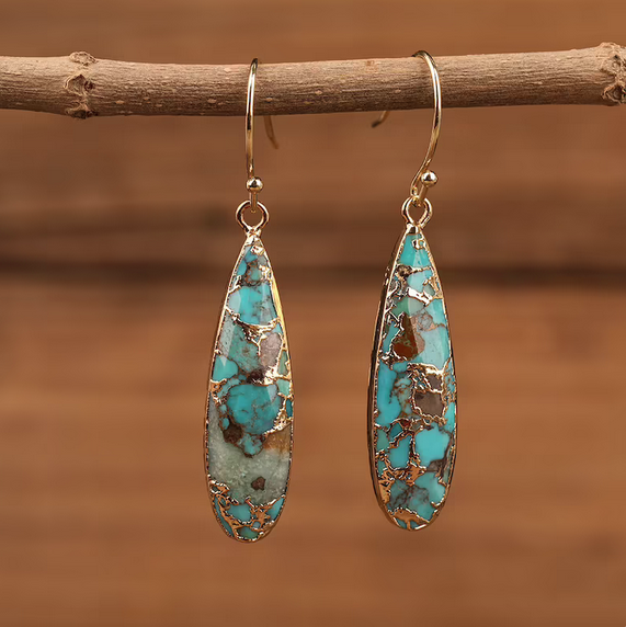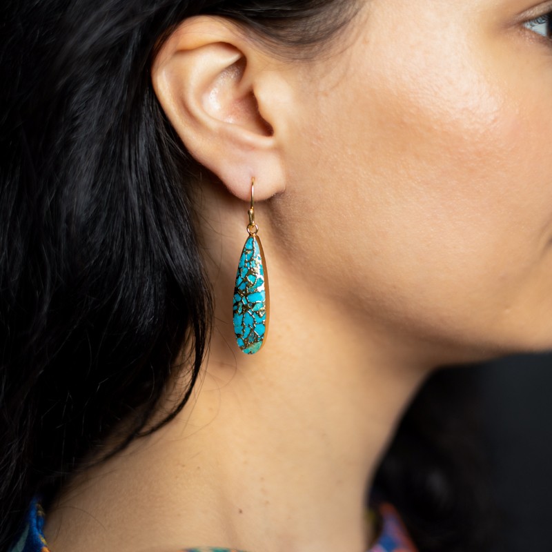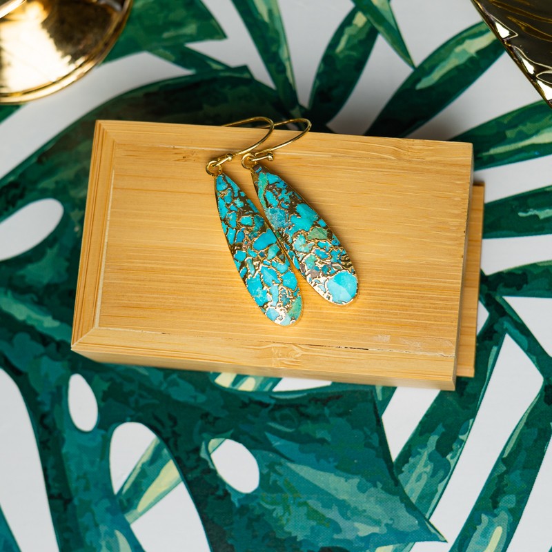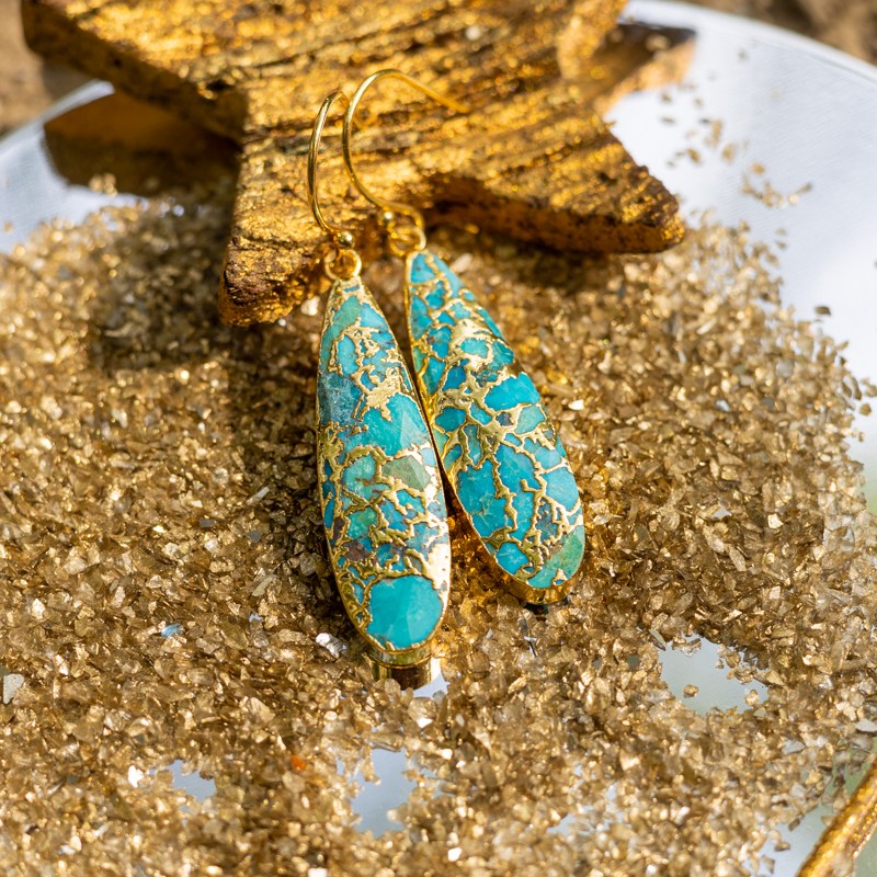 Cauti cercei Dangle Turcoaz? Noi iti propunem aceasta frumoasa pereche de cercei din pietre naturale de turcoaz in forma de lacrima placati cu aur de 18K.