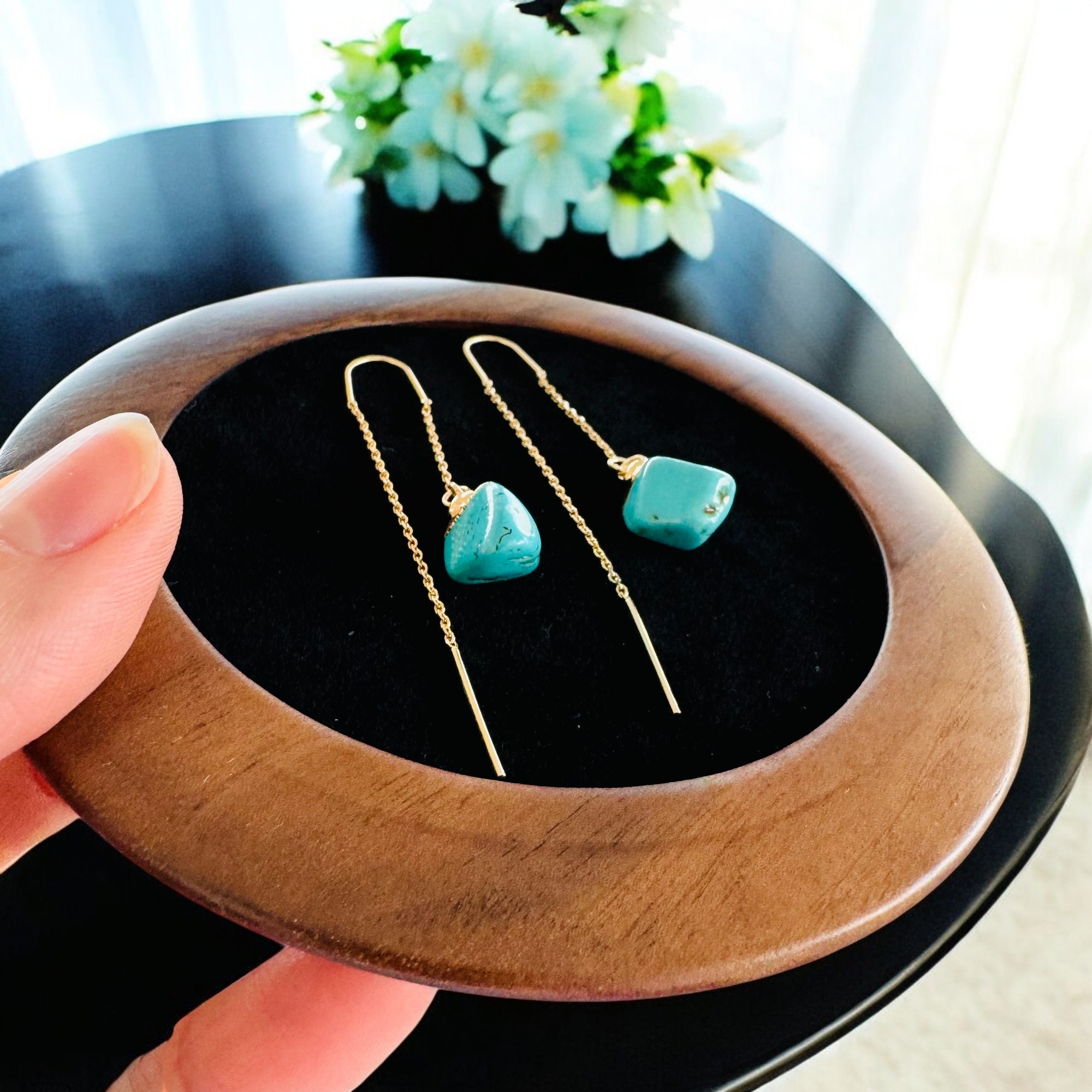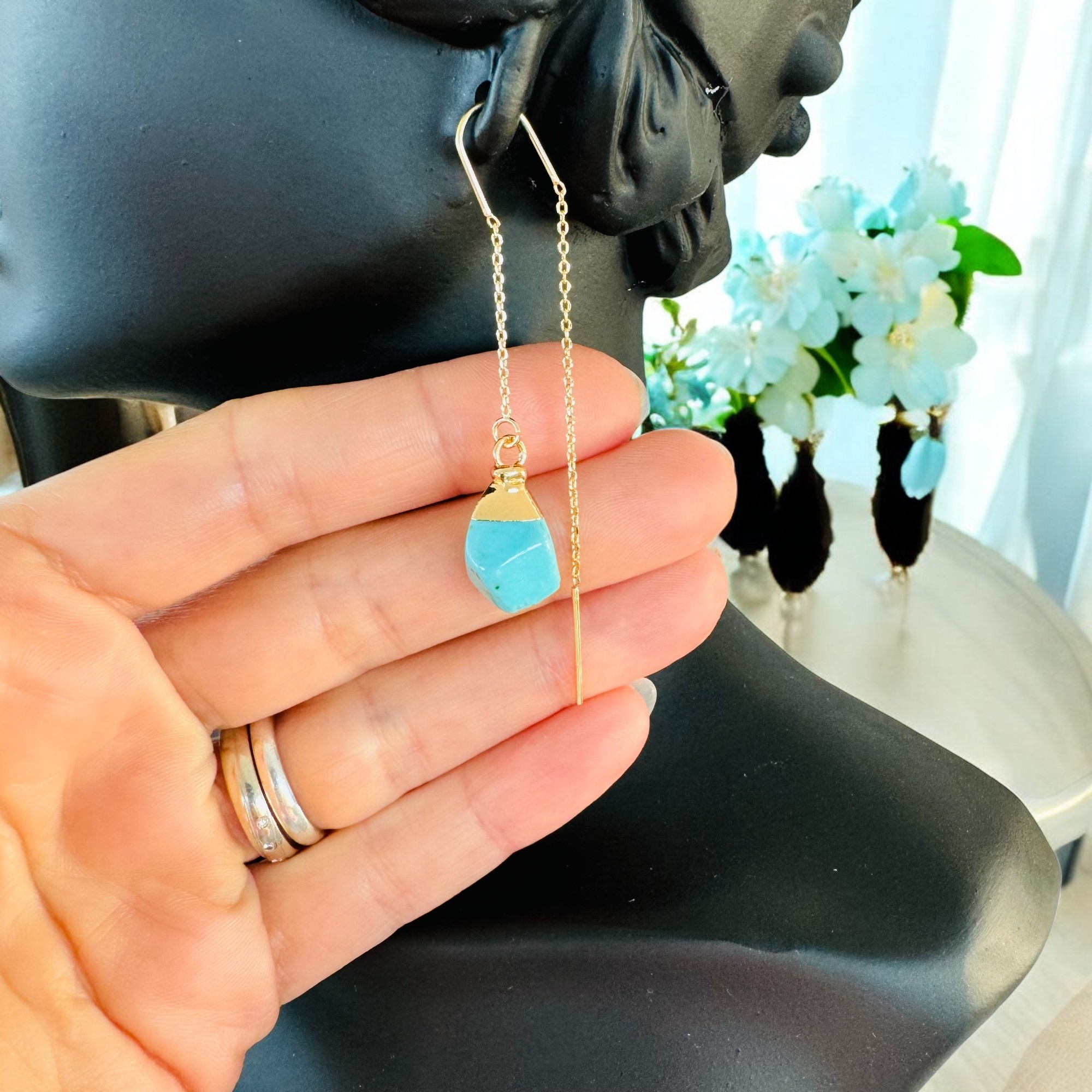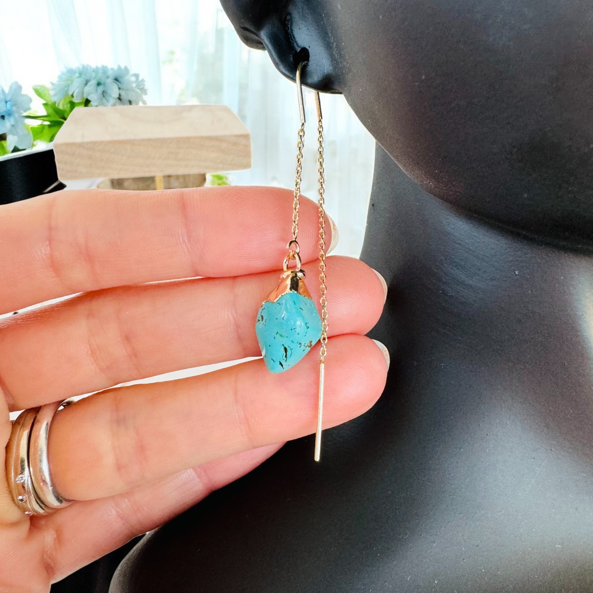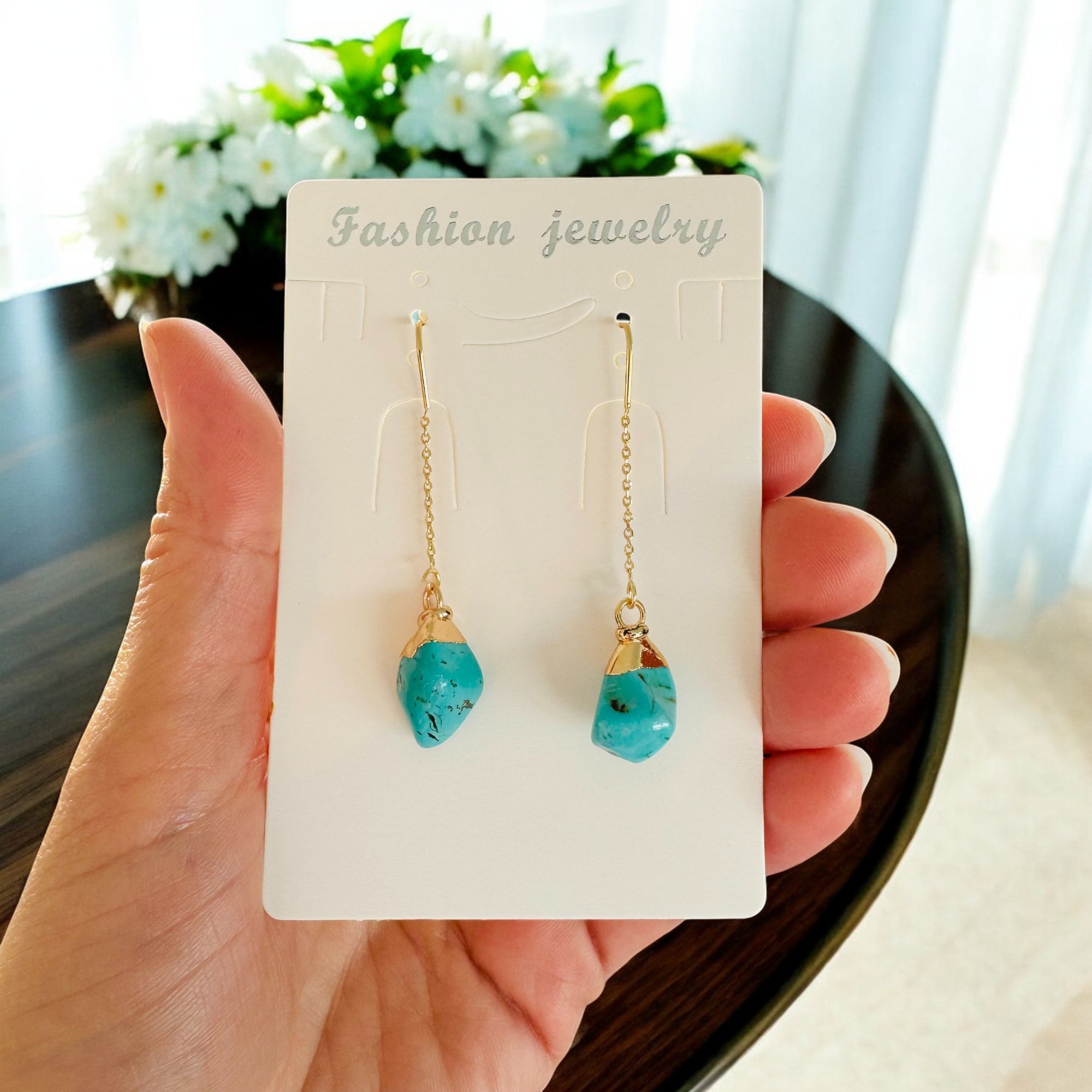 Cerceii lungi cu cristal de Turcoaz placati cu aur sunt o alegere ideala pentru cei care doresc o bijuterie eleganta si plina de culoare. Cristalul de Turcoaz, cu nuantele sale de albastru si verde, aduce un aer fresh si relaxant oricarei tinute. Designul drop al cerceilor pune in evidenta frumusetea cristalului natural, creand un accesoriu care atrage privirea in mod placut.