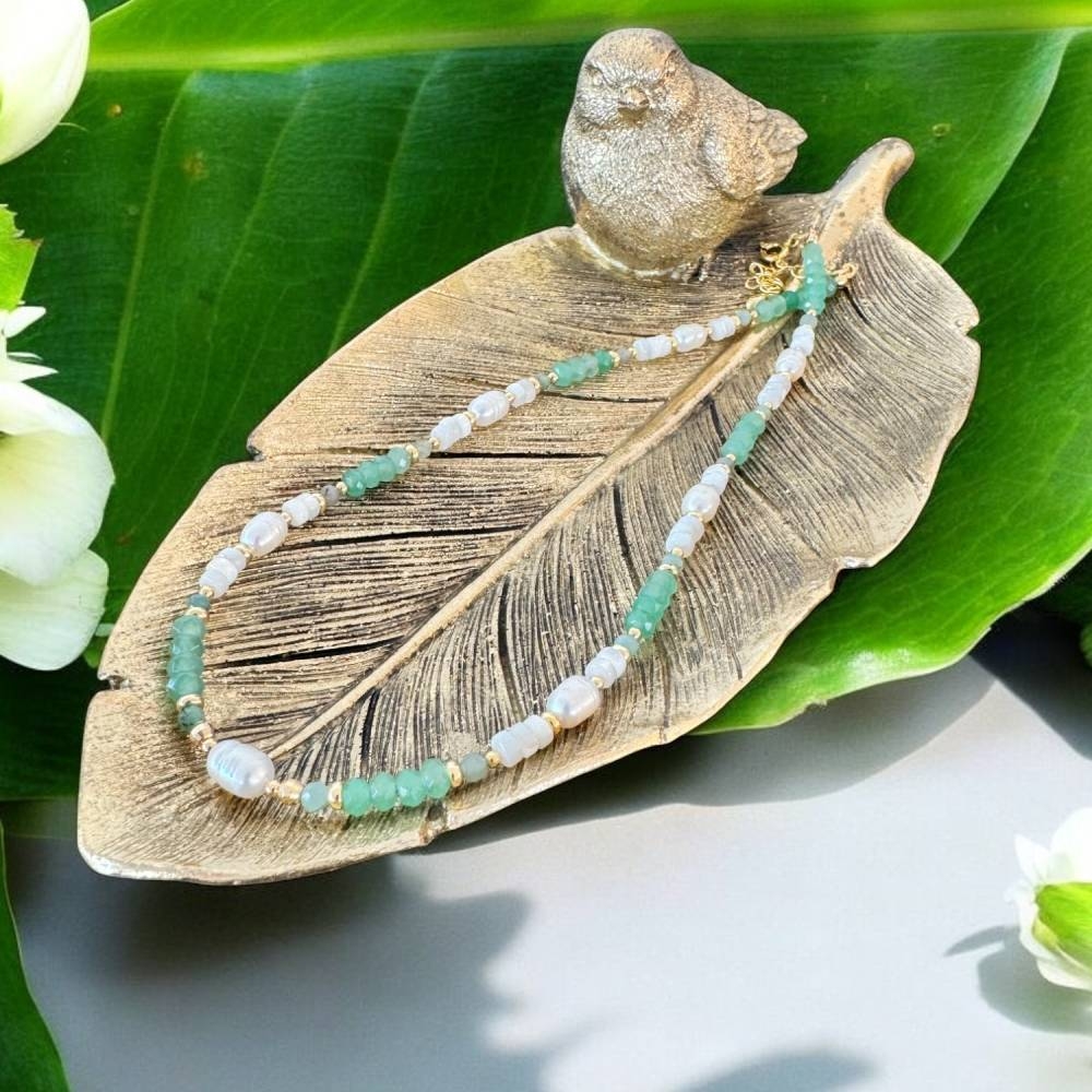 Straluceste cu Colierul Choker Lana, o piesa sofisticata ce combina perfect frumusetea naturala a jadului verde si perlelor delicate. Cu un design modern si un montaj din argint placat cu aur, acest colier iti va adauga o nota de rafinament, devenind accesoriul ideal pentru orice ocazie.