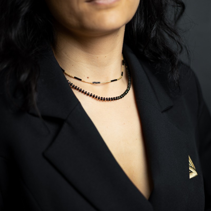 Daca te indrepti spre look-ul modern glam, atunci poti evidentia acest look purtand unele dintre choker-ele noastre din pietre naturale si Miyuki Seed aurii, asociate cu o tinuta viu colorata.