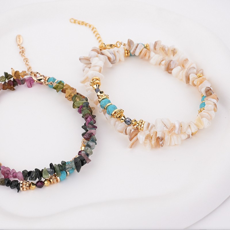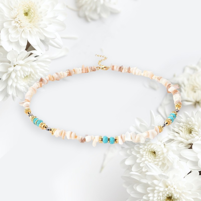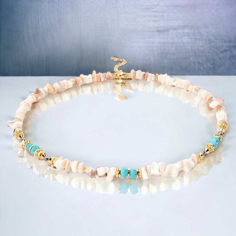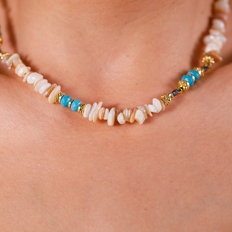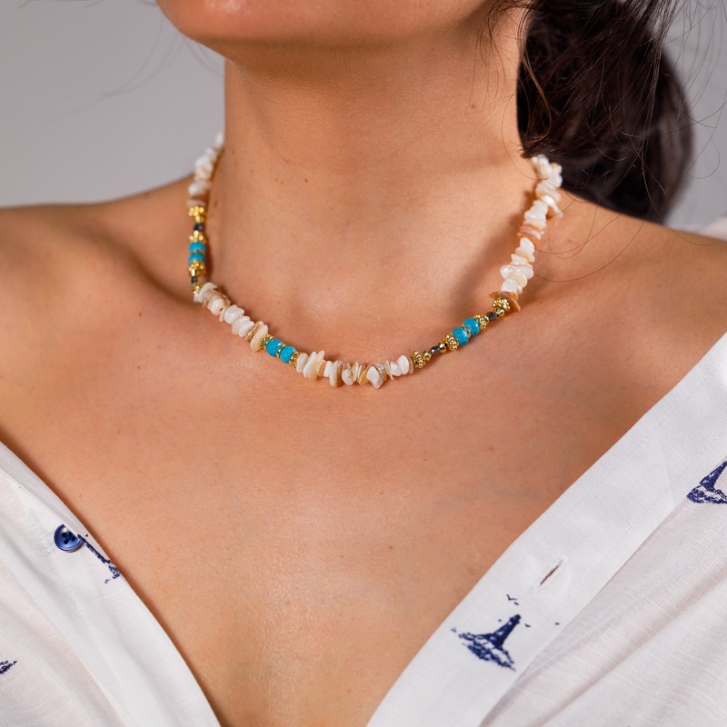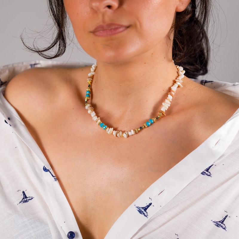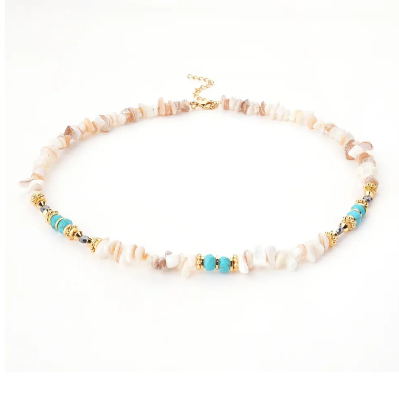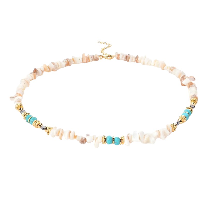 Cipsurile de scoici sunt insirate impreuna pe un lant durabil, dar flexibil, permitand colierului sa se intinda cu gratie de-a lungul decolteului tau.