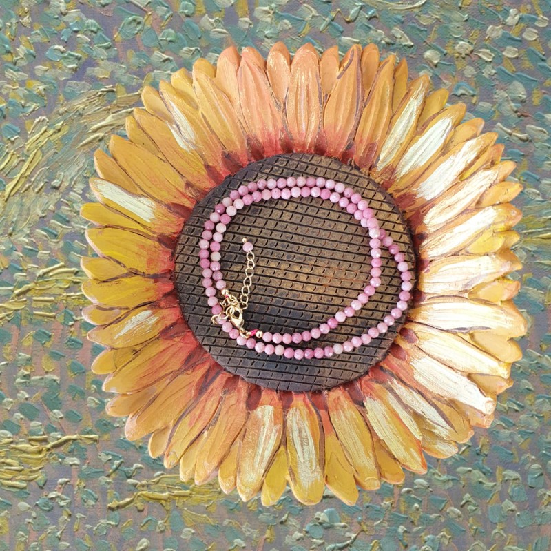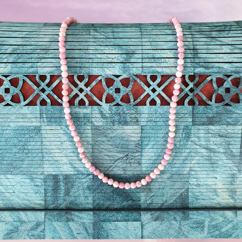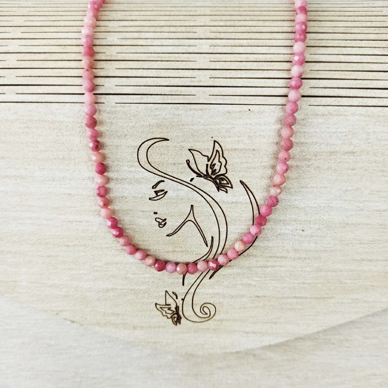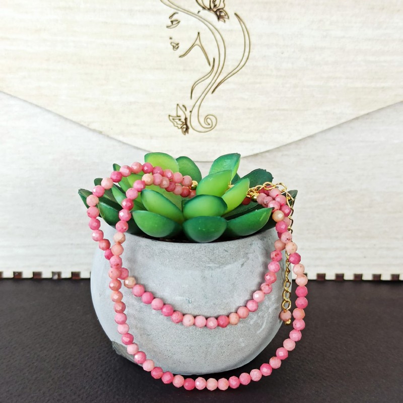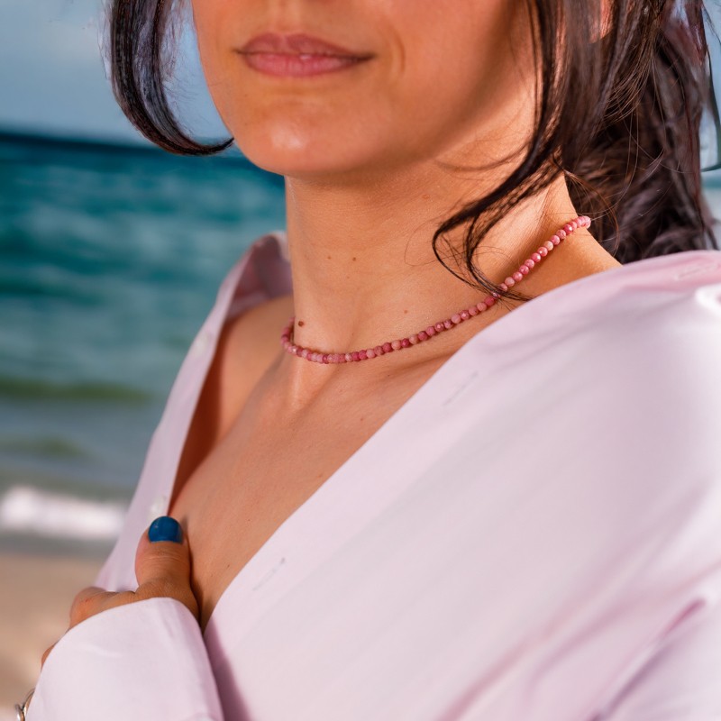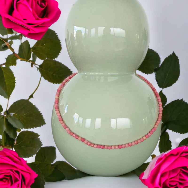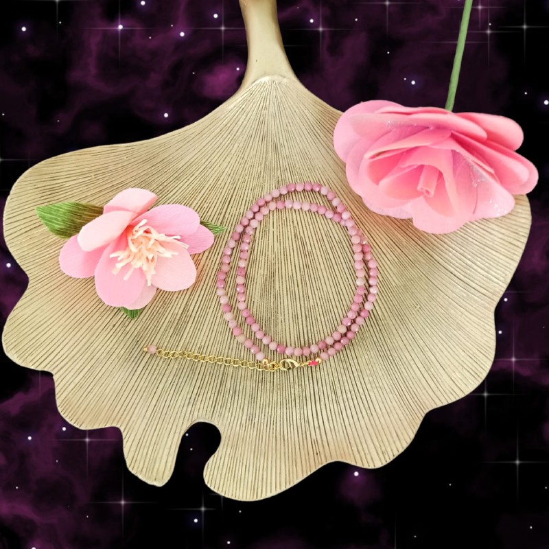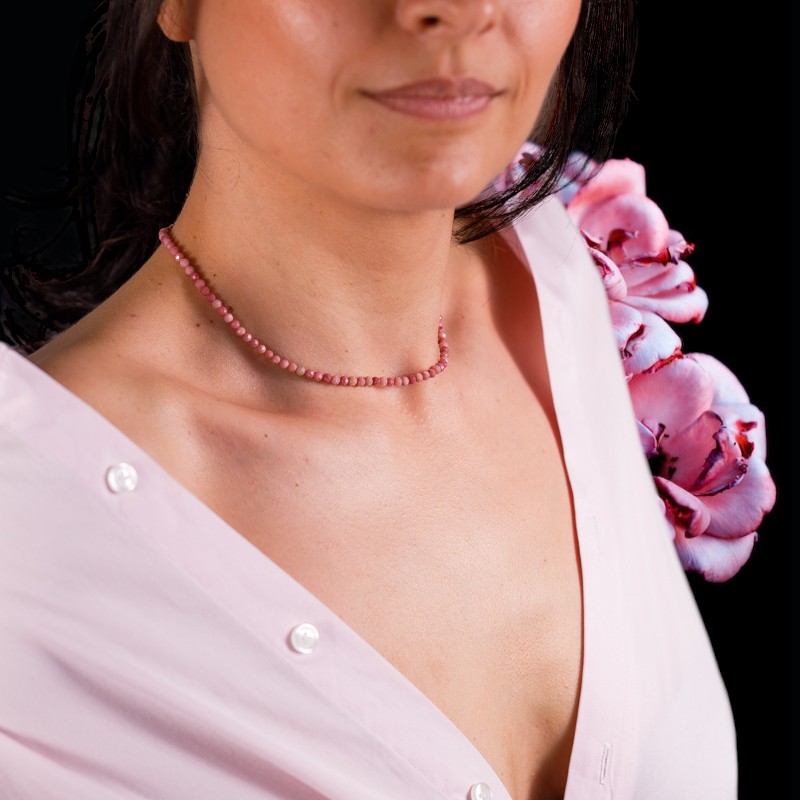 1. Eleganta de neegalat: Colierul Choker din cristale de Rodonit este un simbol al elegantei atemporale. Fabricat cu margele fatetate din pietre semipretioase de Rodonit autentice, emana o frumusete rafinata care completeaza fara efort orice tinuta. Nuantele moi si trandafirii ale rodonitului adauga o nota de rafinament si feminitate, facandu-l un accesoriu perfect atat pentru evenimente formale, cat si pentru purtarea de zi cu zi.