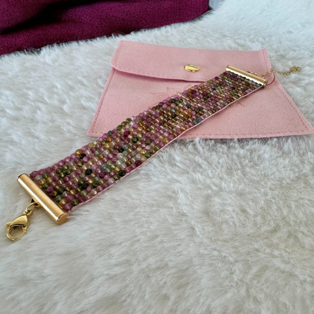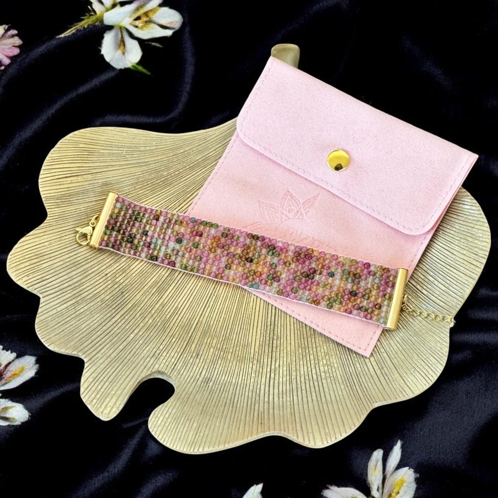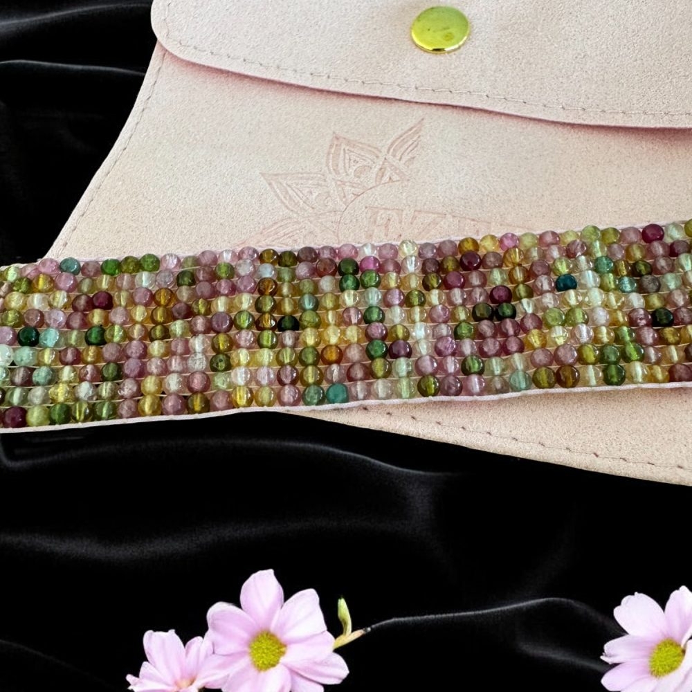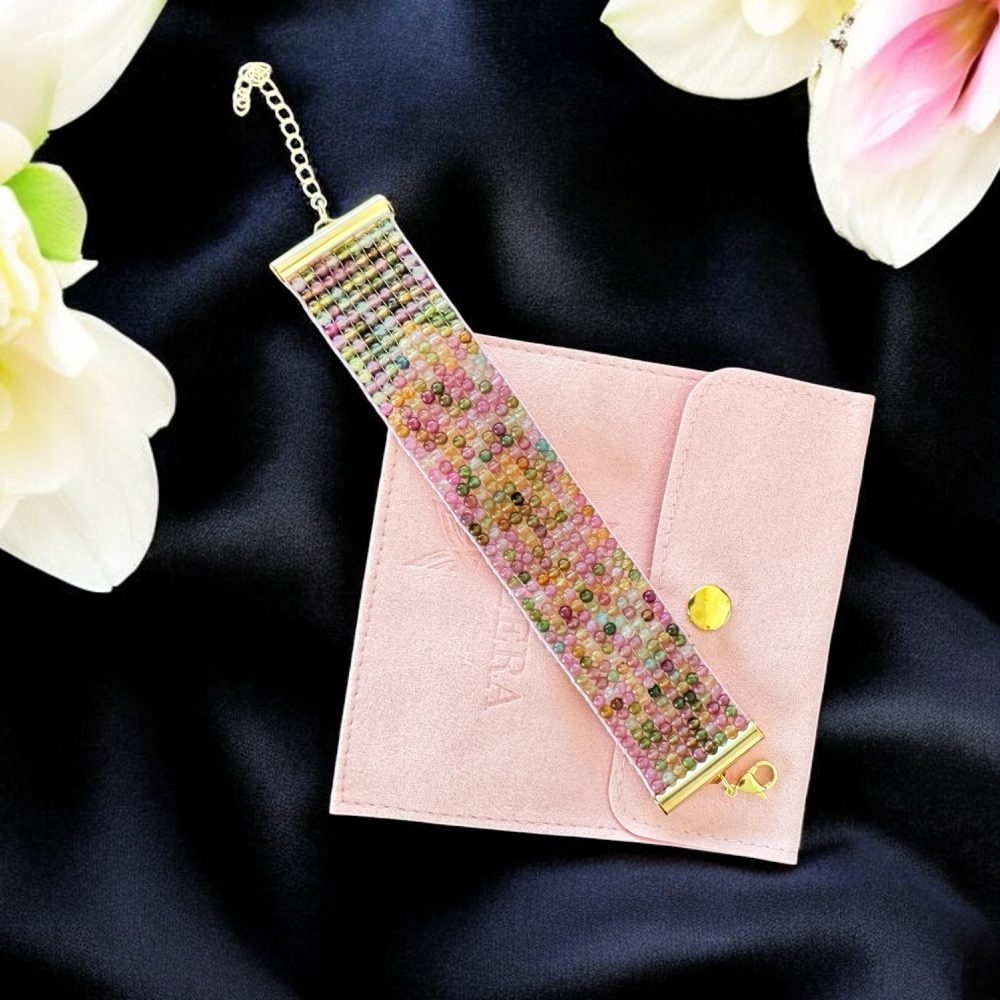 Fiecare strat al acestei bratari exceptionale este o explozie de culoare si stralucire, reflectand nuantele vibrante ale Turmalinei Candy. Cunoscuta pentru spectrul sau fascinant de culori, aceasta piatra semipretioasa nu doar incanta privirea, dar si imbratiseaza purtatoarea cu o aura de pozitivitate si armonie.