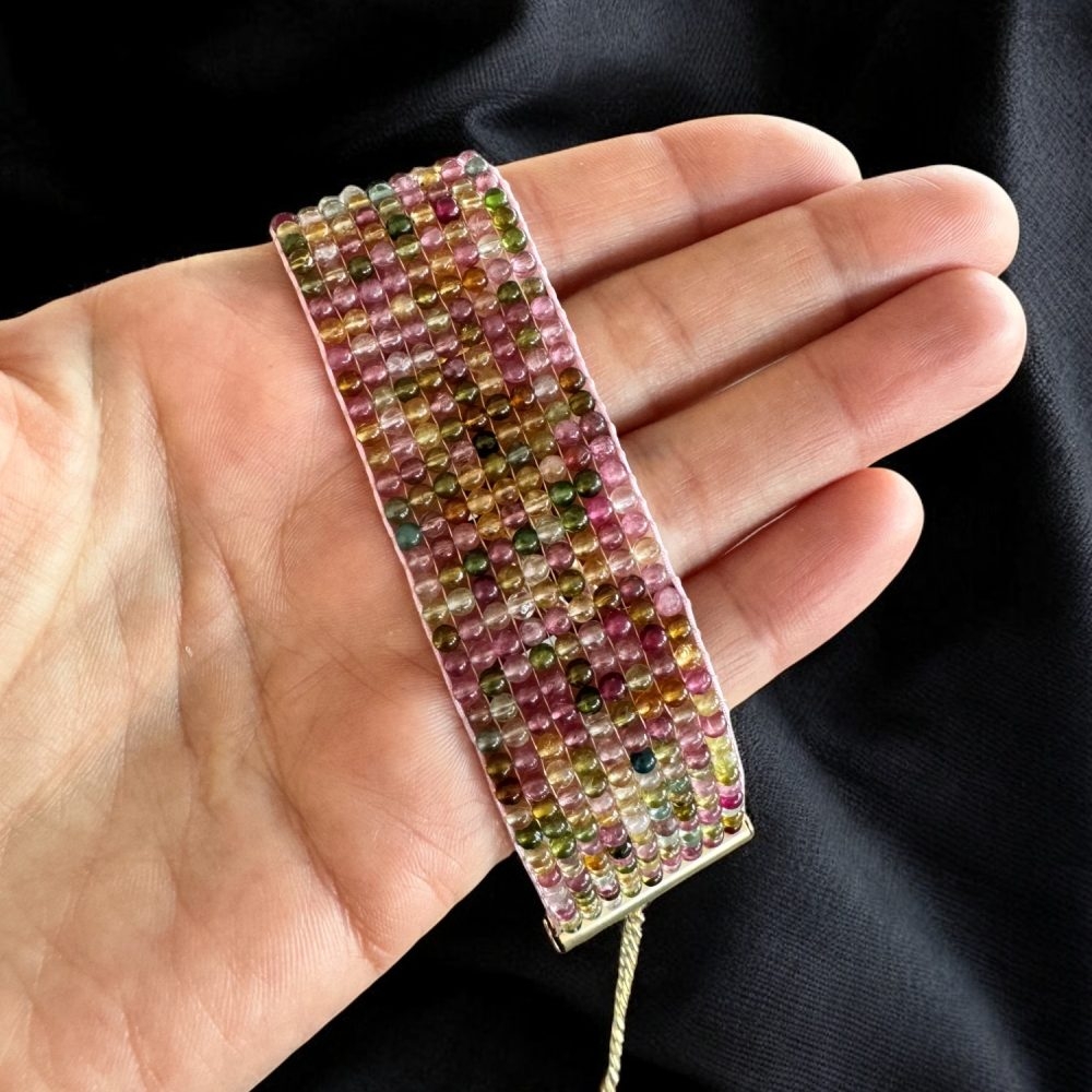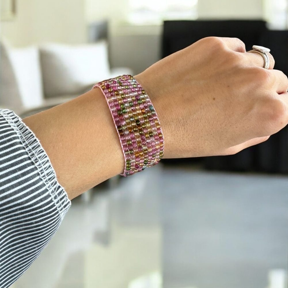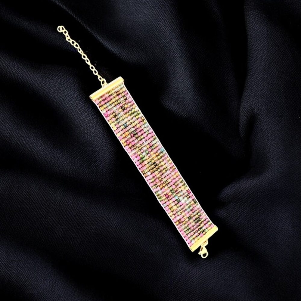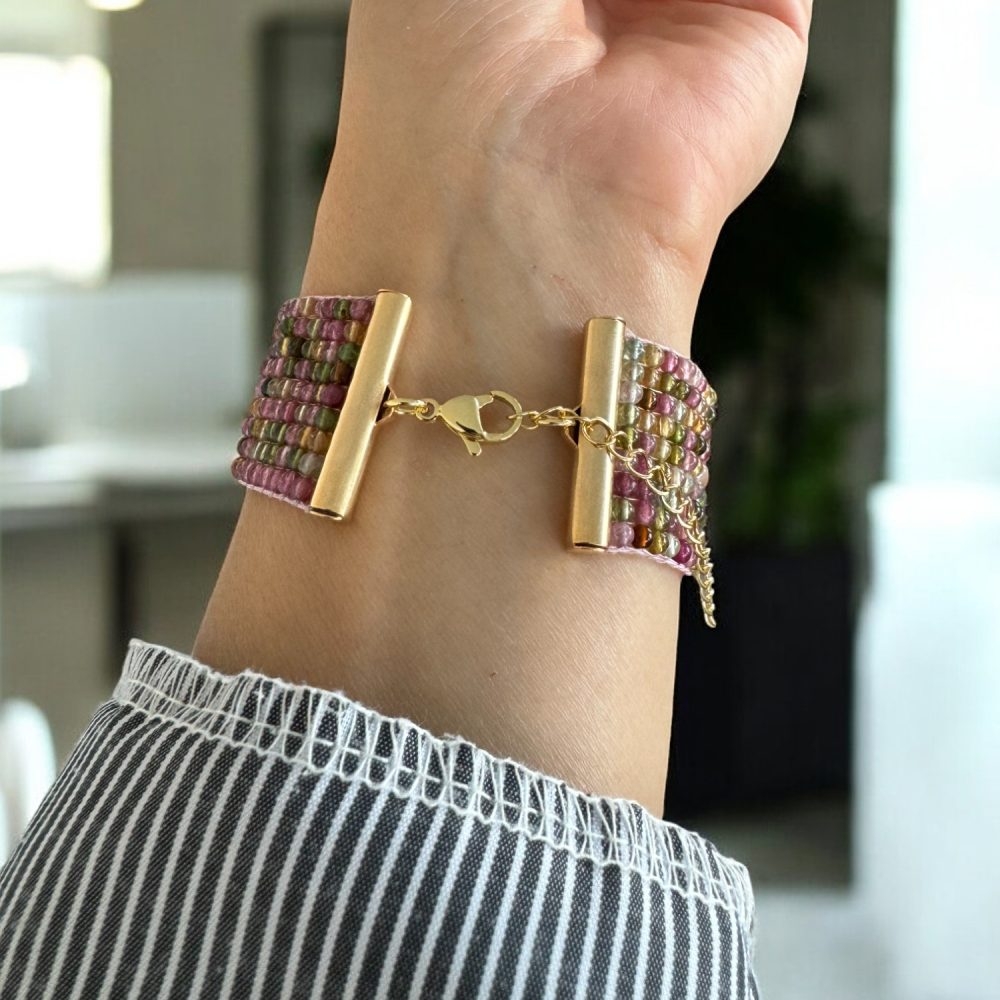 Fiecare strat al acestei bratari exceptionale este o explozie de culoare si stralucire, reflectand nuantele vibrante ale Turmalinei Candy. Cunoscuta pentru spectrul sau fascinant de culori, aceasta piatra semipretioasa nu doar incanta privirea, dar si imbratiseaza purtatoarea cu o aura de pozitivitate si armonie.