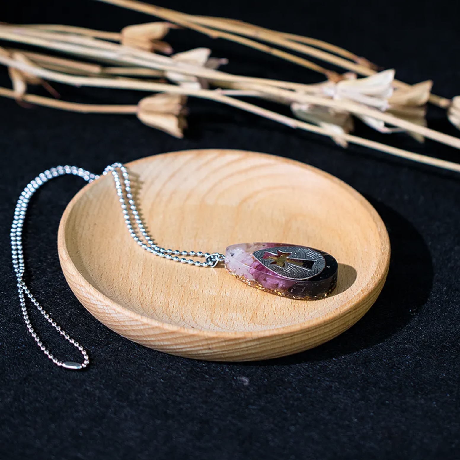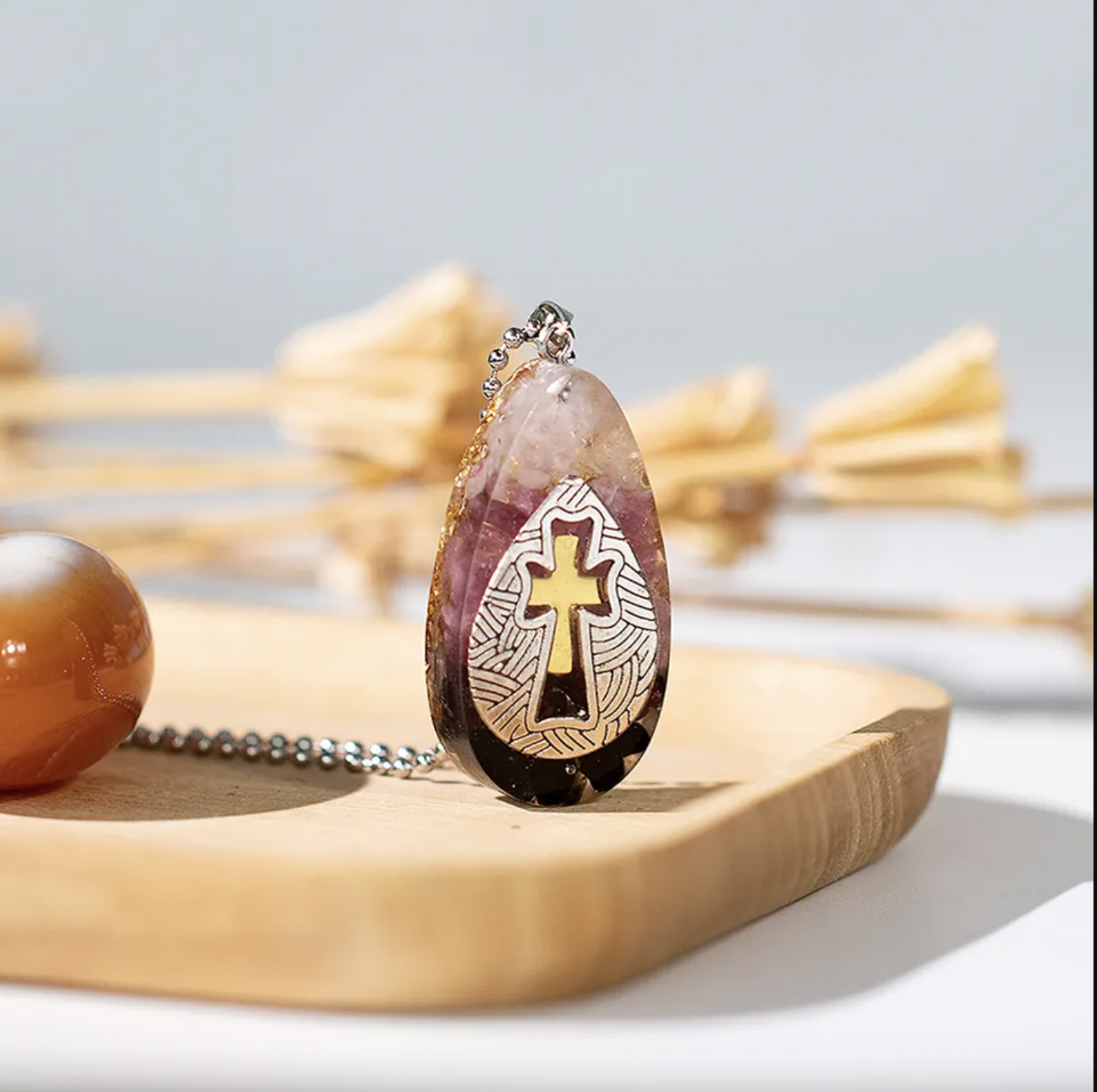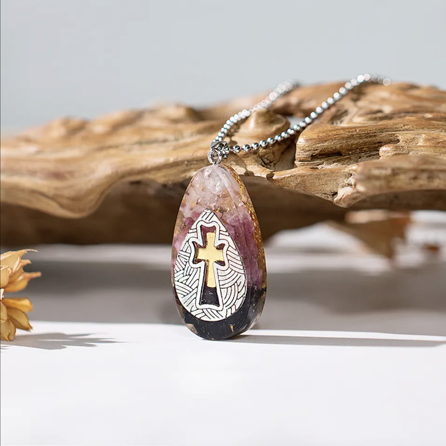 Dar acest colier este mai mult decat o expresie a credintei si stilului tau. Este un pandantiv orgonit, un amestec armonios de cristale si rasina care iti armonizeaza campul energetic, eliminand vibratiile negative si infuzand viata ta cu pozitivitate. Cu fiecare miscare gratioasa a acestui colier, vei simti schimbarile subtile ale energiei tale, stimuland un sentiment de seninatate si echilibru.