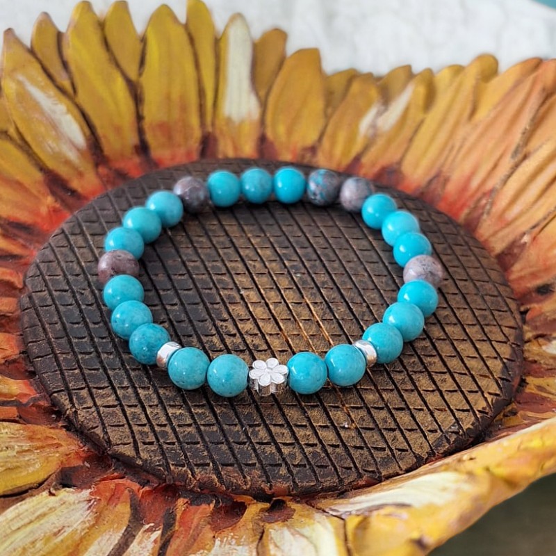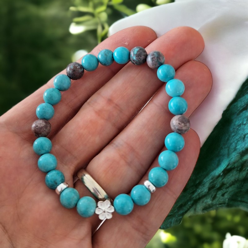 Turcoazul este cunoscut pentru culoarea sa frumoasa albastru-verde, care este adesea asociata cu linistea si conexiunea cu natura. Atunci cand acest cristal este combinat cu argint bratara rezultata este deosebit de eleganta.
