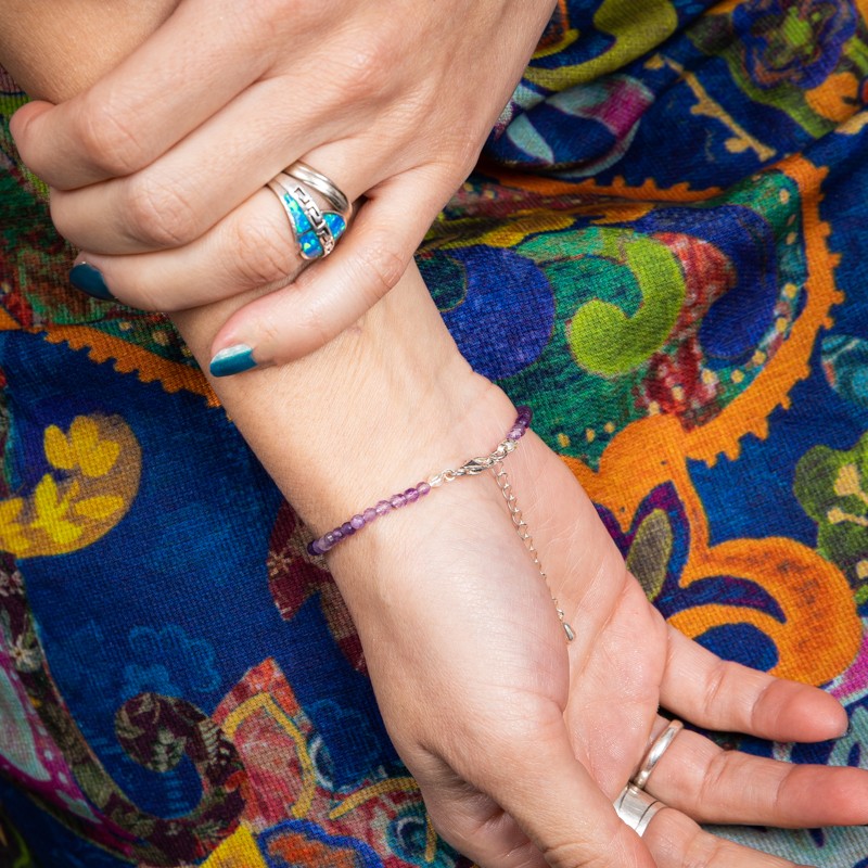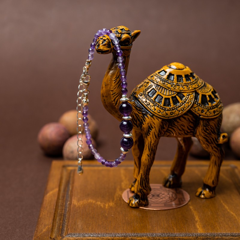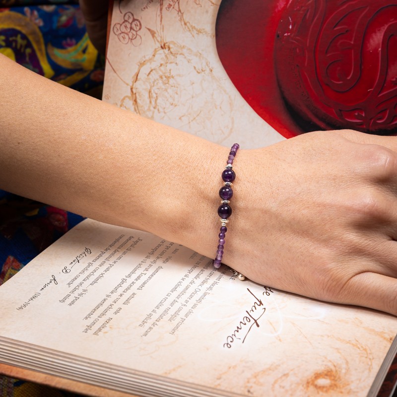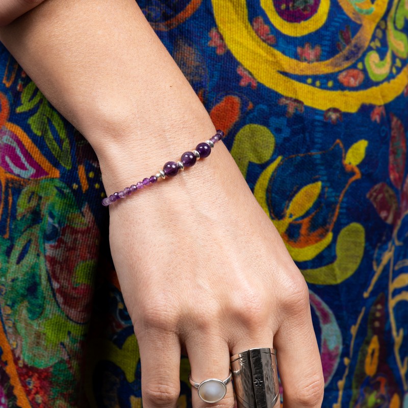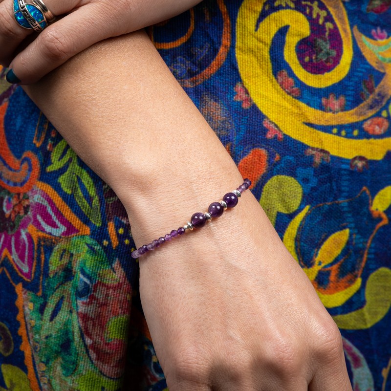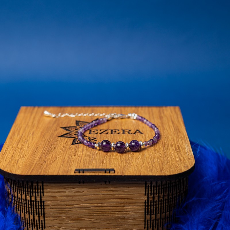 Bratara din cristale de Ametist scanteie in lumina, ca un milion de stele pe cerul noptii. Simte senzatia de calm atunci cand o strangi in jurul incheieturii mainii tale, ca si cum nuanta violet profunda a frumoasei pietre te cuprinde intr-o imbratisare reconfortanta. Pe masura ce ii vei simti greutatea delicata pe pielea ta, aminteste-ti de proprietatile sale speciale, care promoveaza puterea interioara si pacea. Simte un sentiment de protectie si bunastare pe care nu le-ai mai cunoscut pana acum, ca si cum ai purta un talisman de putere si frumusete.