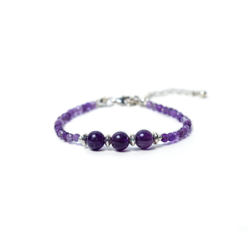 Bratara masoara aproximativ 16.5 cm plus 3.5 cm de lant prelungitor. Inchiderea si accesoriile sunt din argint 925. Dimensiunea pietrelor de ametist este de 3mm respectiv de 6 mm.