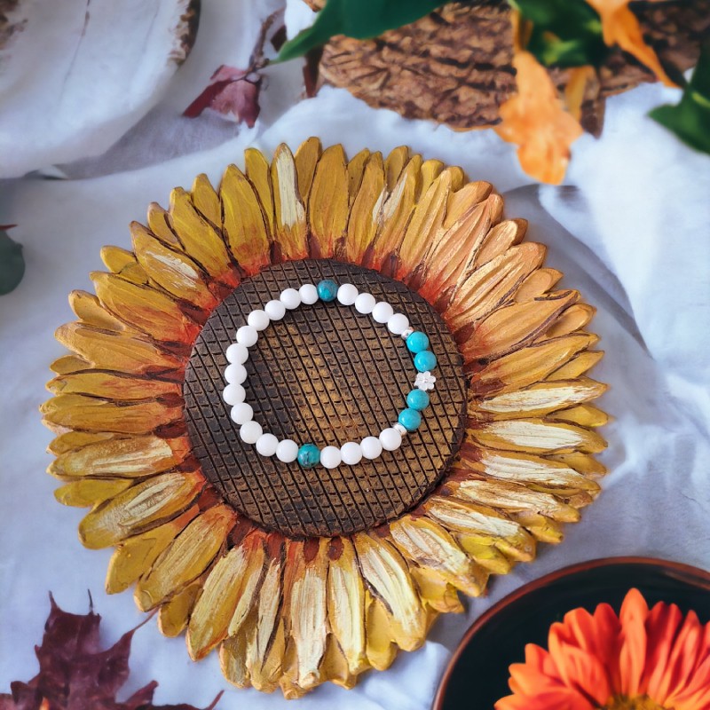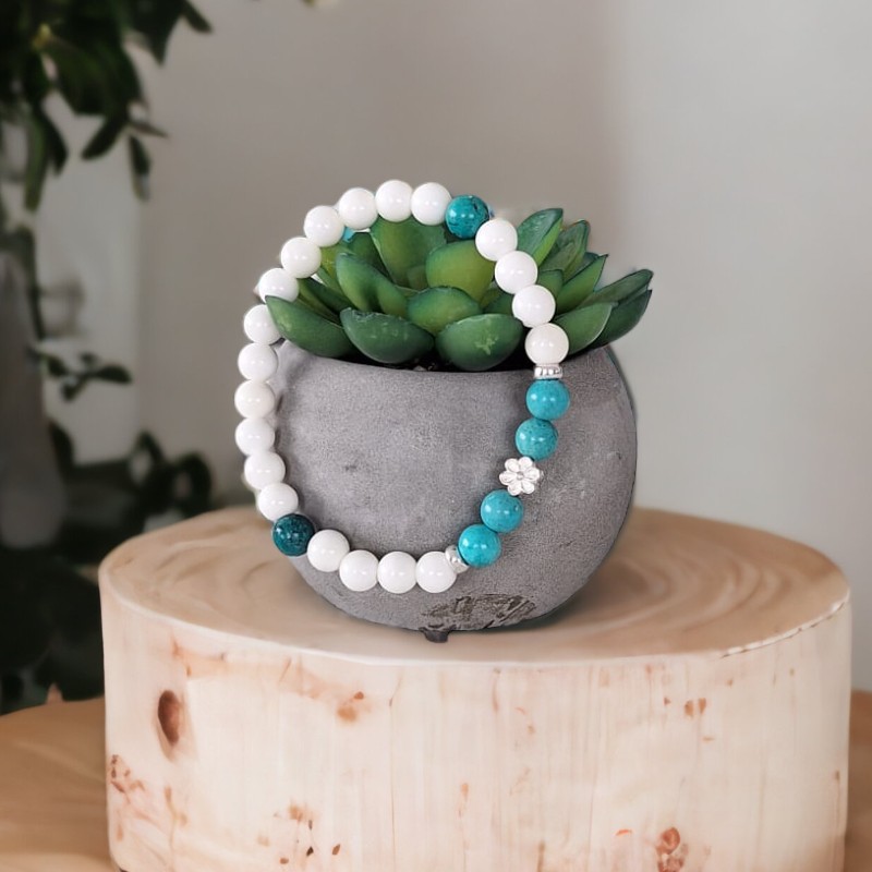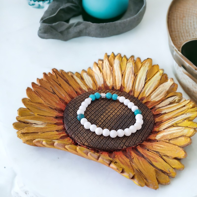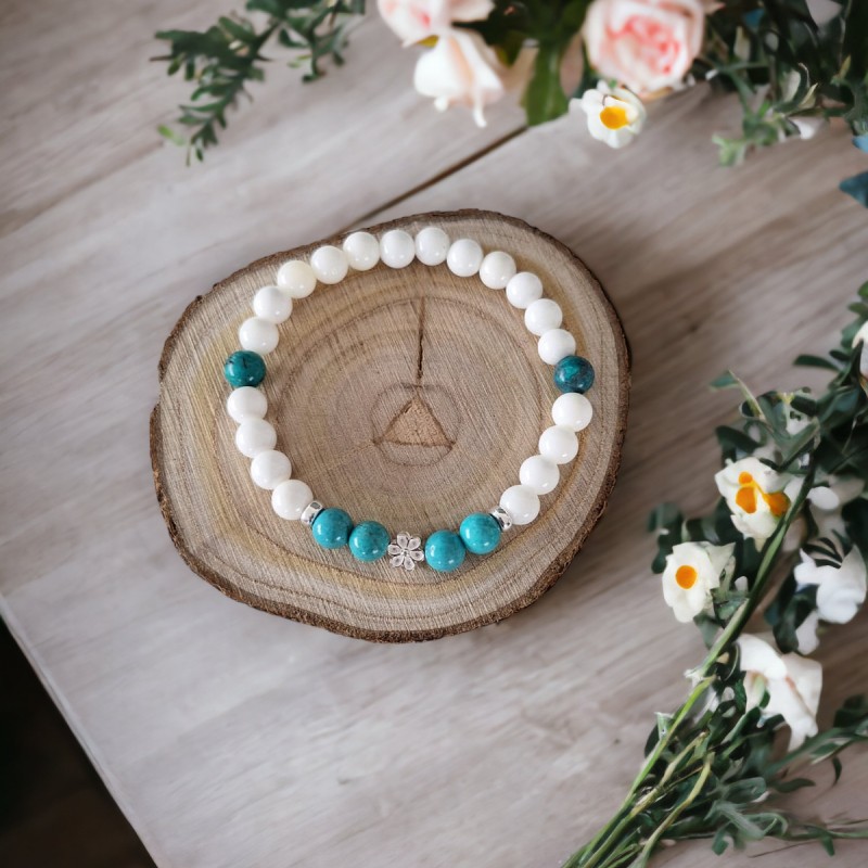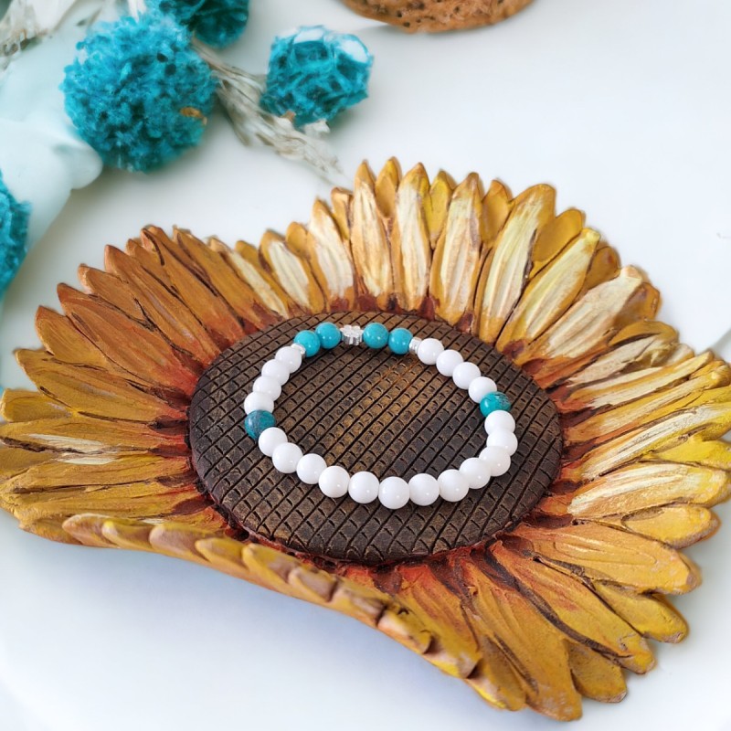 2. **Echilibru si calm:** Se crede ca turcoazul are un efect calmant asupra emotiilor, reducand stresul si promovand echilibrul emotional. Margele albe de Tridacna pot spori sentimentele de liniste si calm.