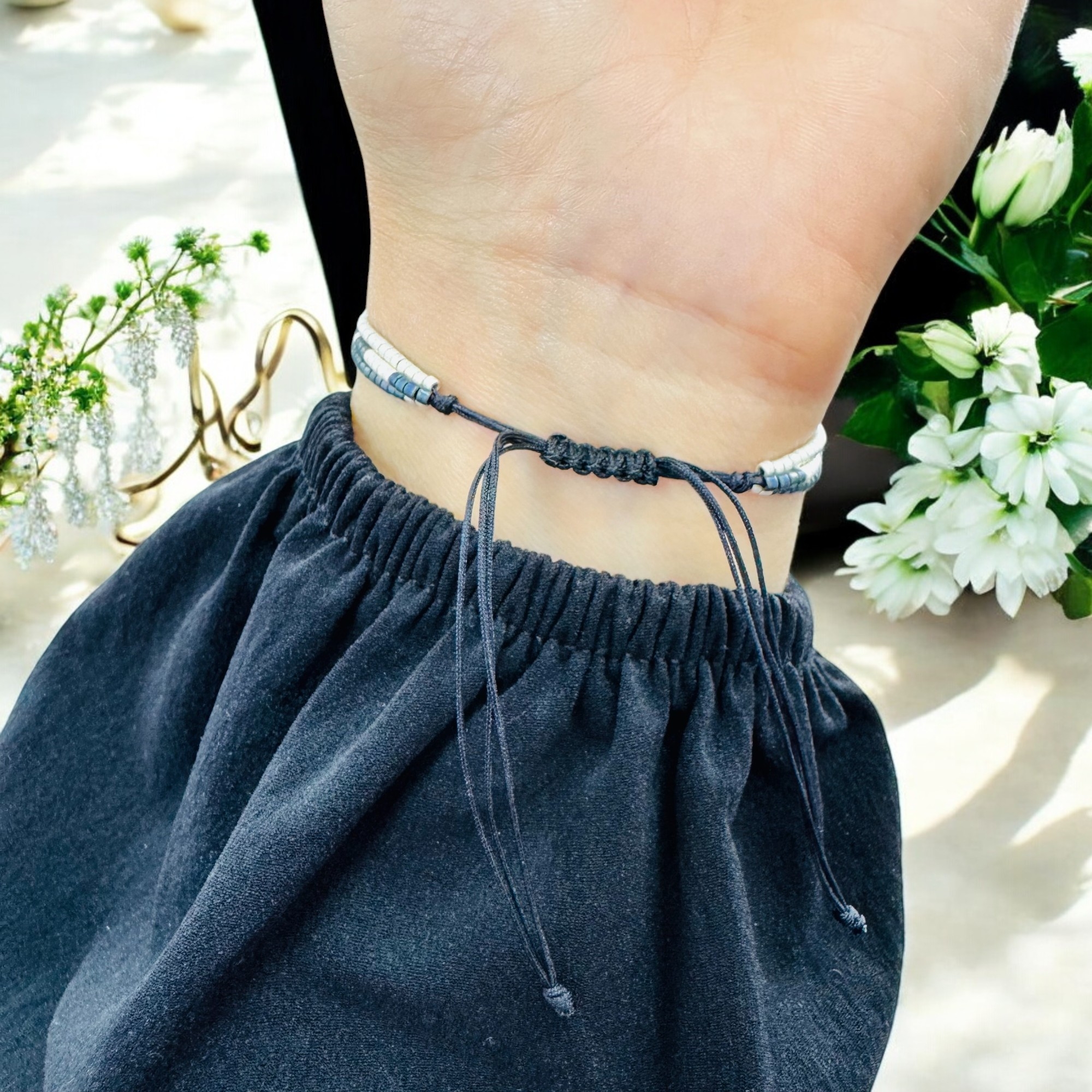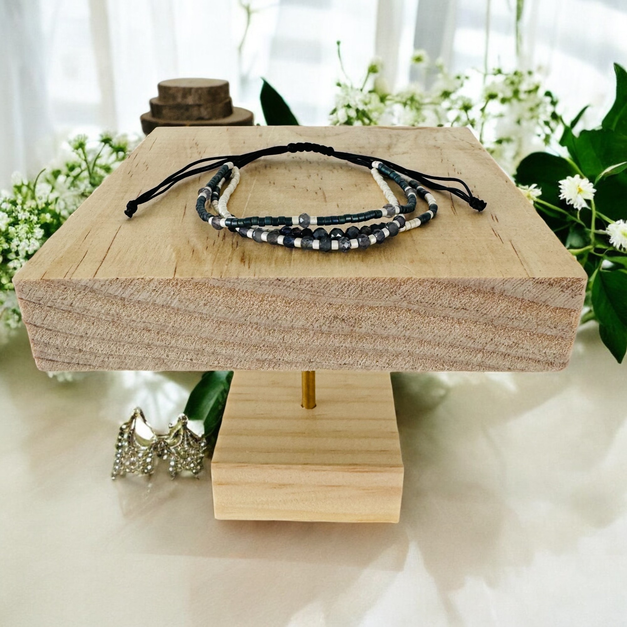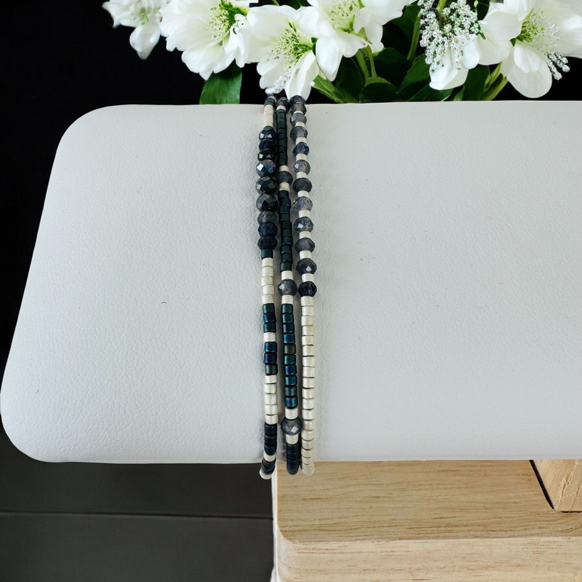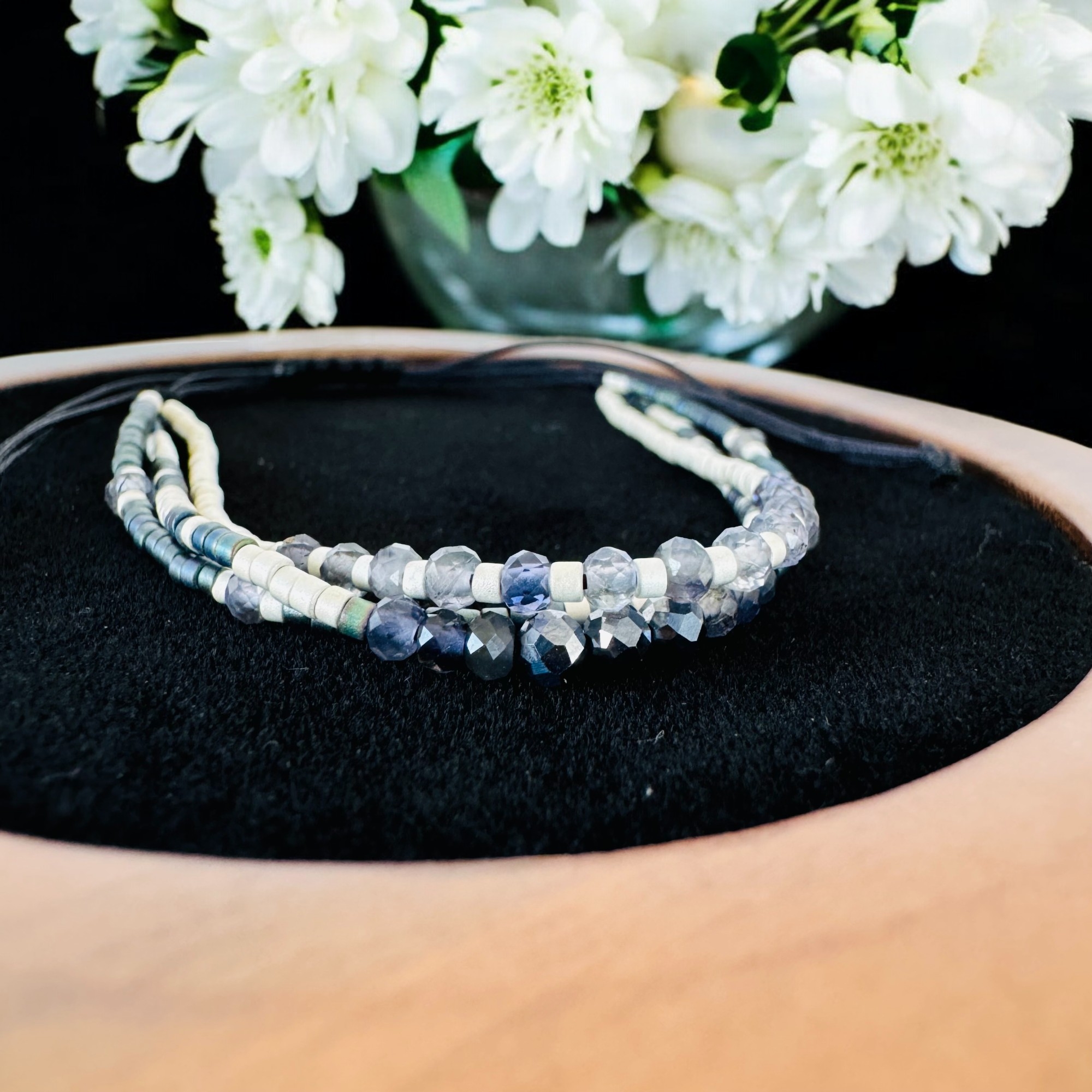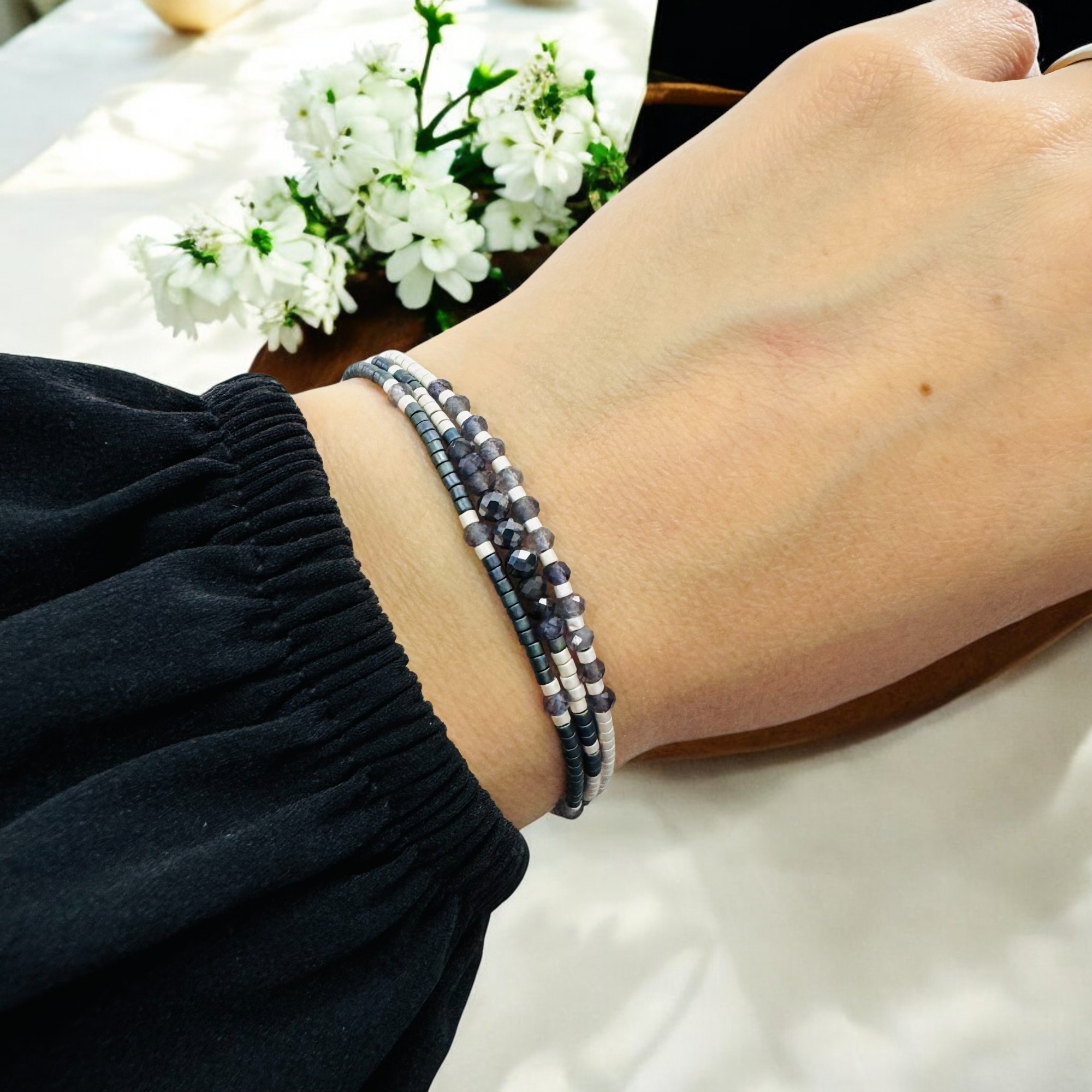 Margelele Miyuki argintii adauga un aer luminos bratarii, iar combinatia cu Iolitul si Hematitul aduce un echilibru de culori reci si calde. Iolitul este apreciat pentru nuantele sale adanci de albastru si violet, iar Hematitul pentru reflexiile sale metalice, ambele pietre avand semnificatii de protectie si echilibru.