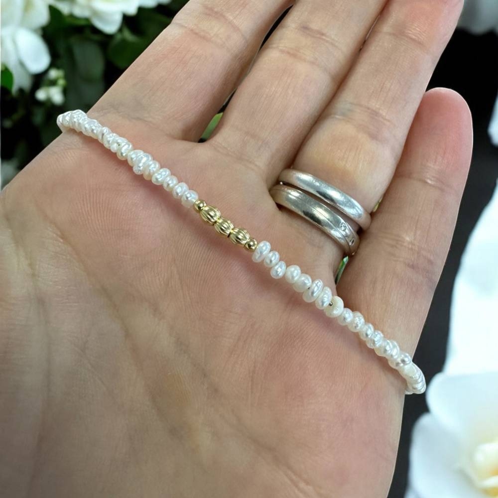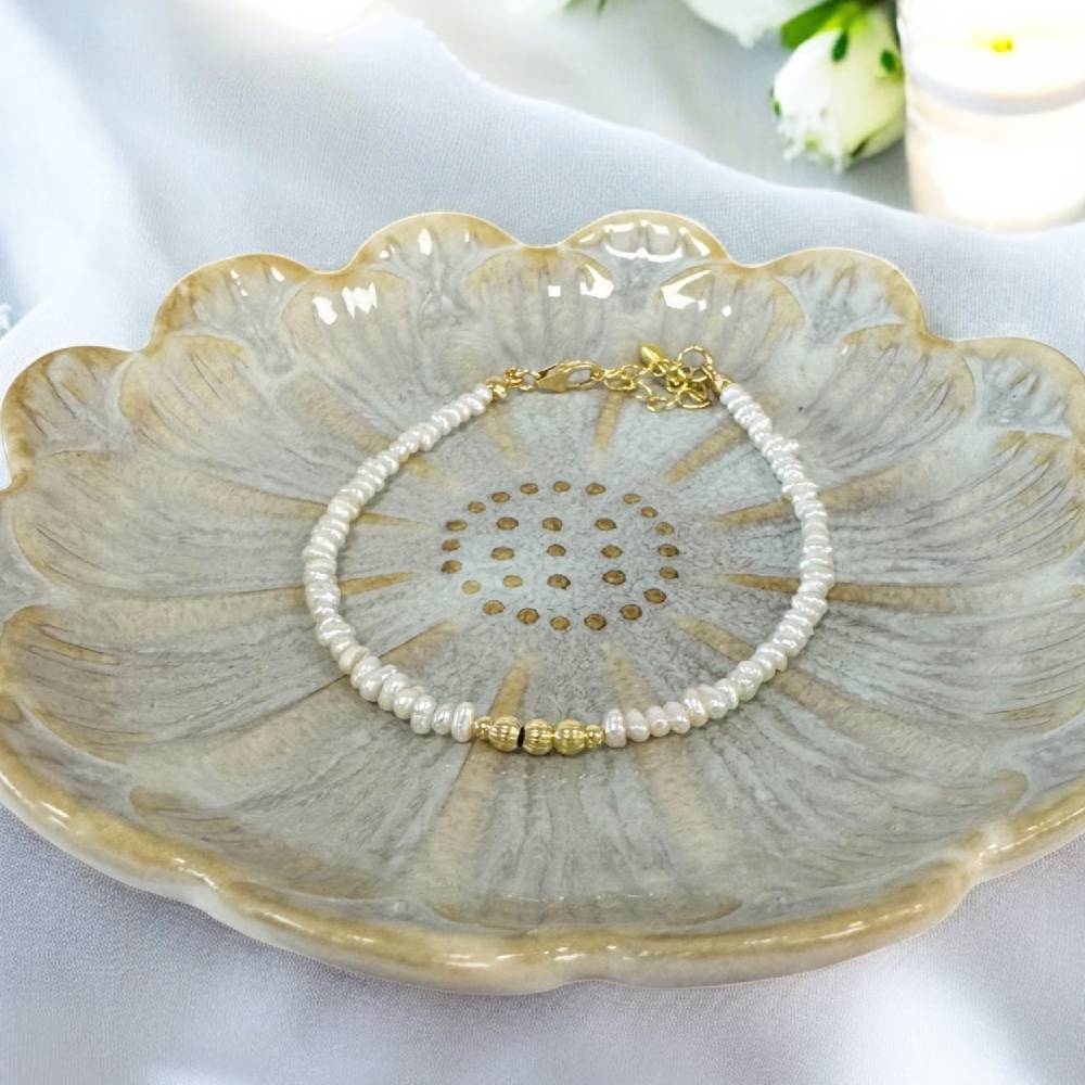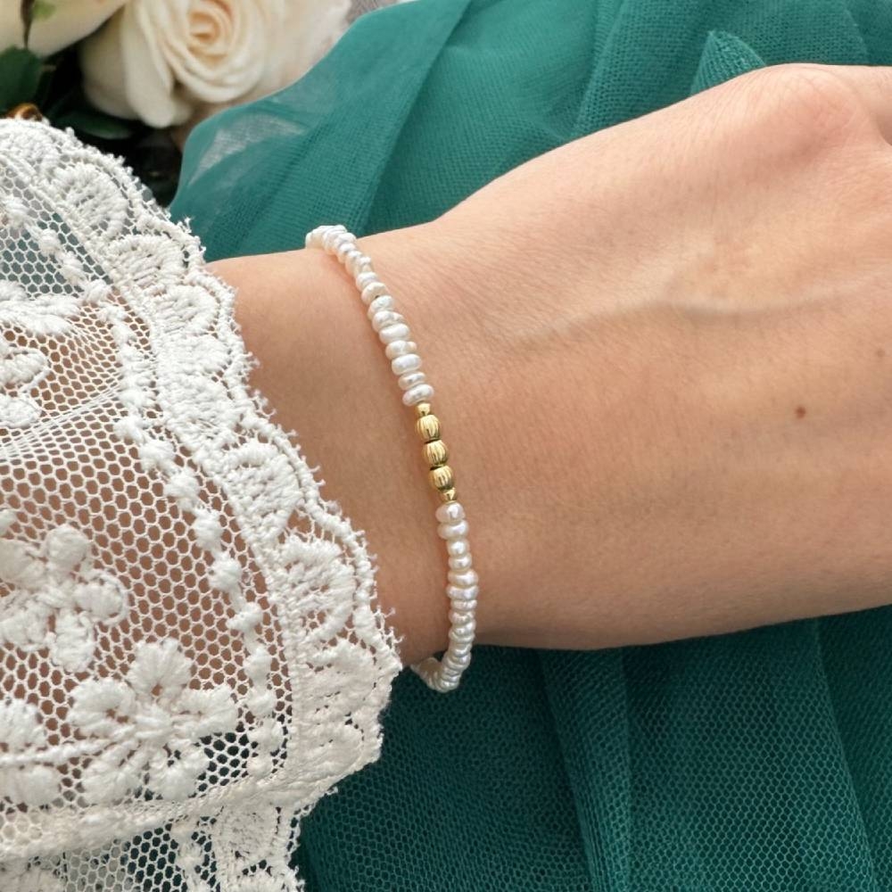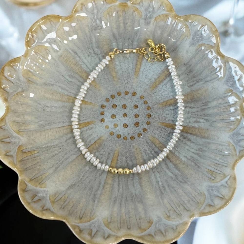 Accesoriile din argint placat cu aur 925 sunt atent pozitionate pentru a completa perfect perlele de cultura, conferind bratarii un aspect stralucitor si elegant. Designul simplu, dar deosebit, subliniaza frumusetea naturala a perlelor, fara a fi incarcat, permitand ca aceasta bijuterie sa devina un element de stil esential in orice colectie.