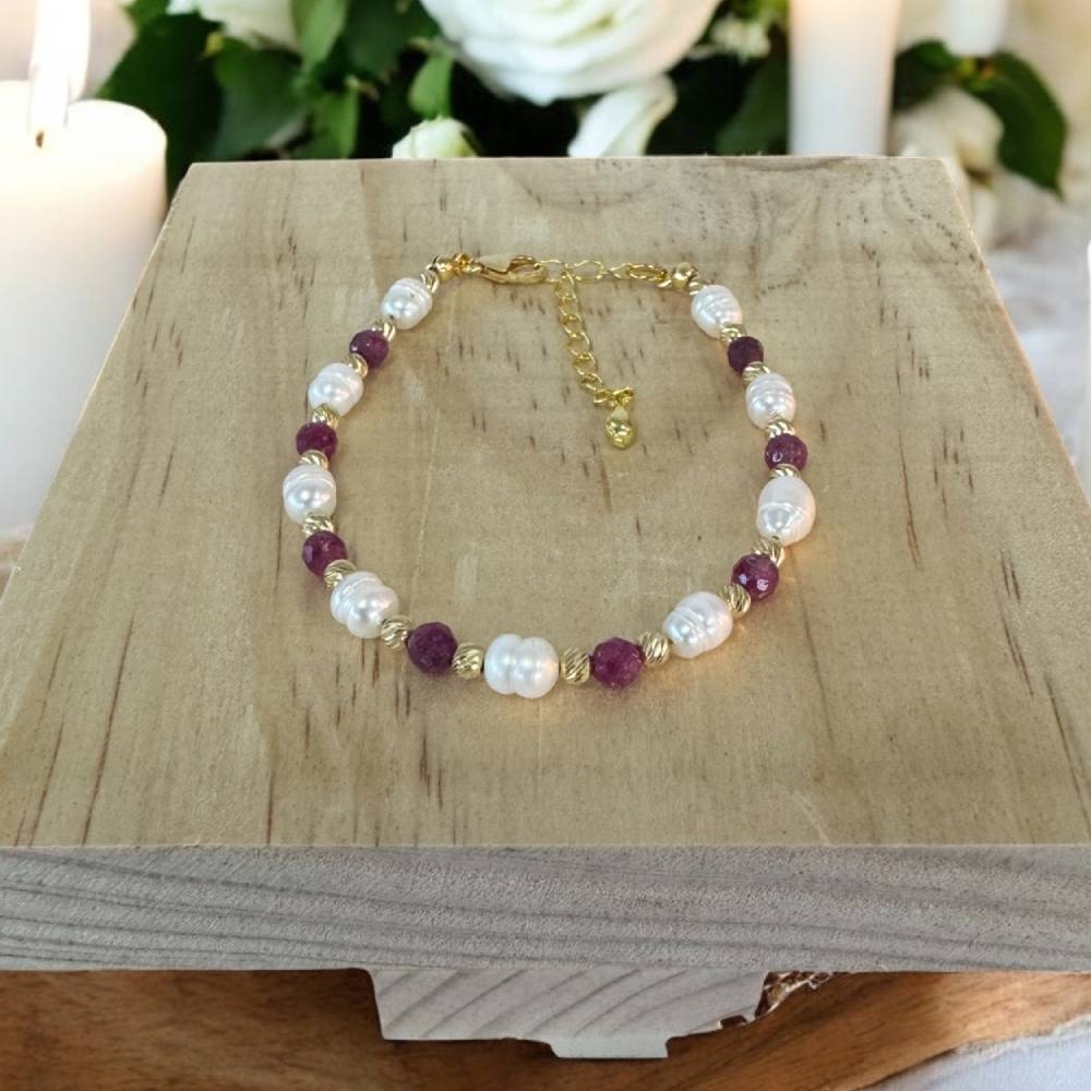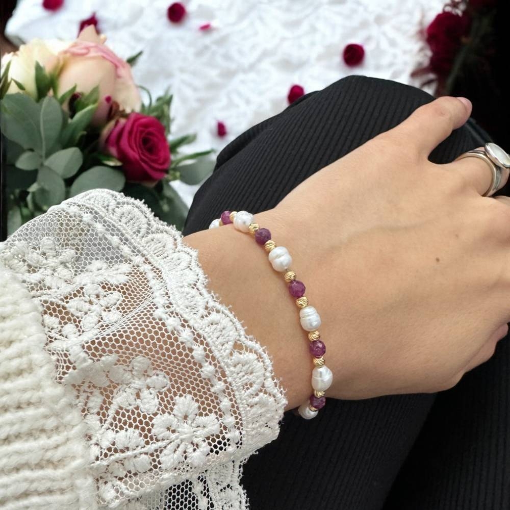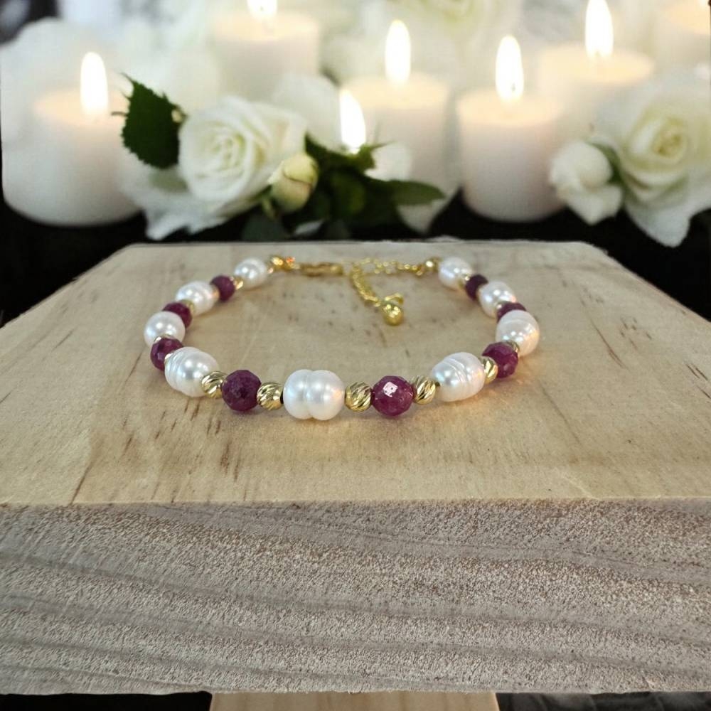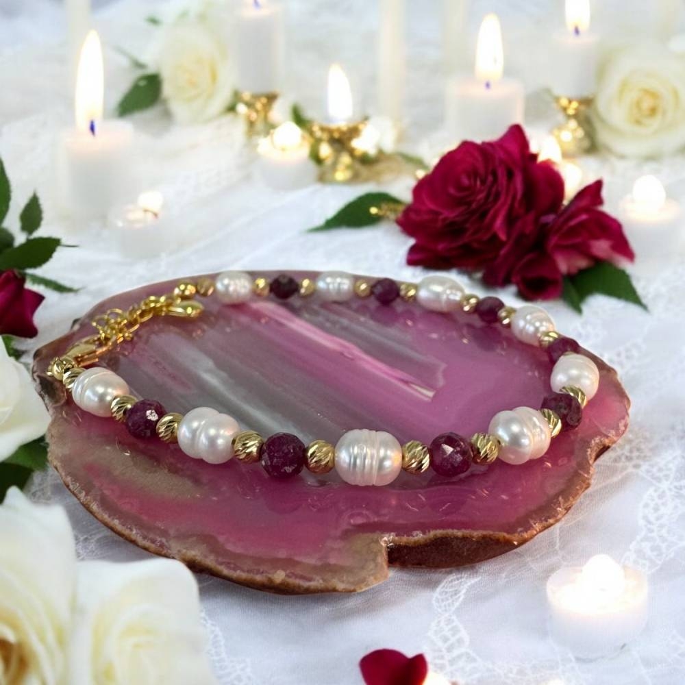 Perlele de cultura, cunoscute pentru finetea si stralucirea lor delicata, confera bratarii un aer de puritate si feminitate, iar rubinul natural, cu nuantele sale intense de rosu, adauga o nota de pasiune si energie. Impreuna, aceste doua pietre semipretioase creeaza o armonie perfecta, simbolizand iubirea, vitalitatea si rafinamentul.