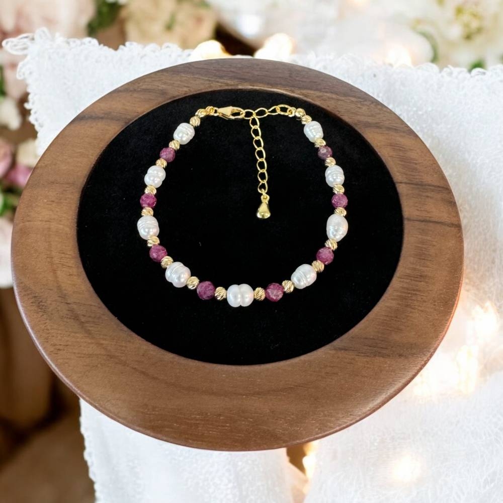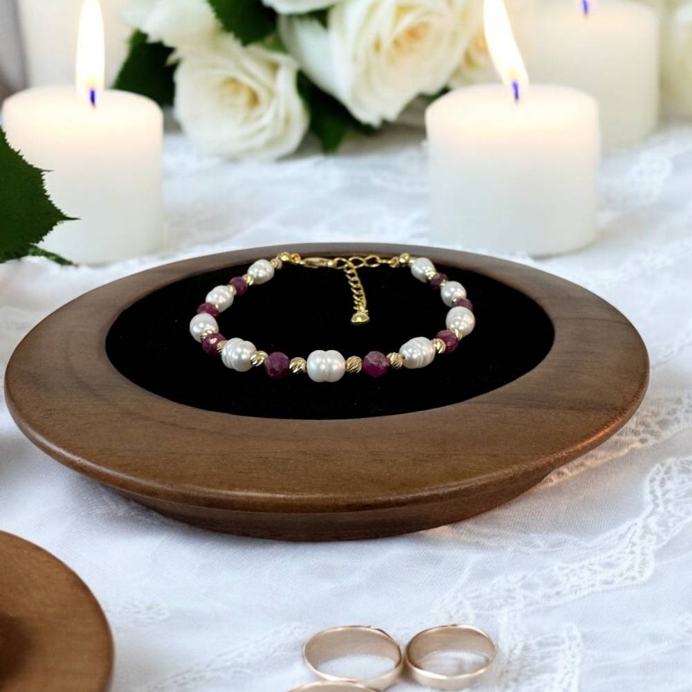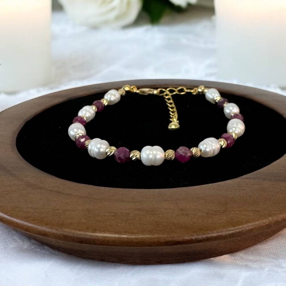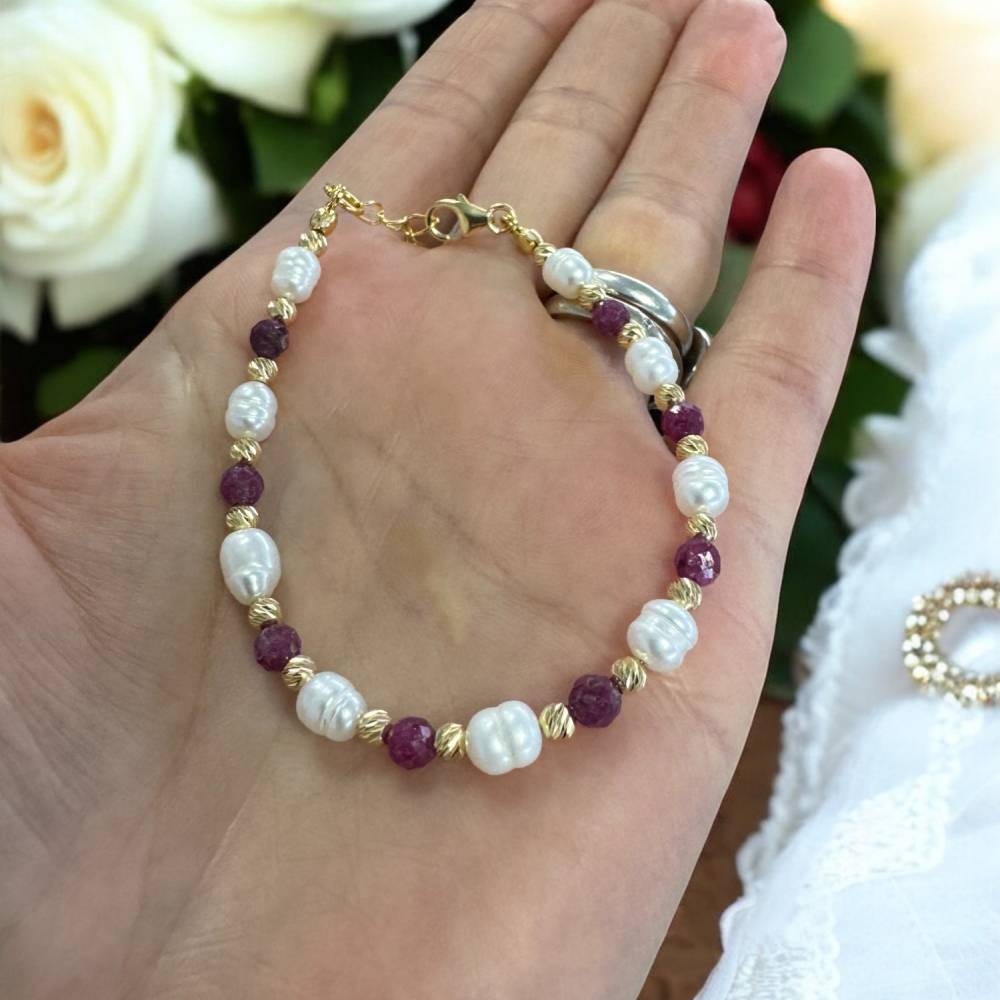 Perlele de cultura, cunoscute pentru finetea si stralucirea lor delicata, confera bratarii un aer de puritate si feminitate, iar rubinul natural, cu nuantele sale intense de rosu, adauga o nota de pasiune si energie. Impreuna, aceste doua pietre semipretioase creeaza o armonie perfecta, simbolizand iubirea, vitalitatea si rafinamentul.