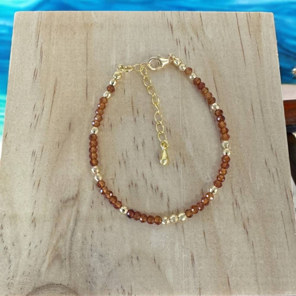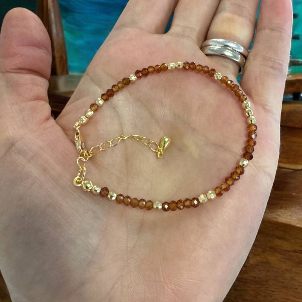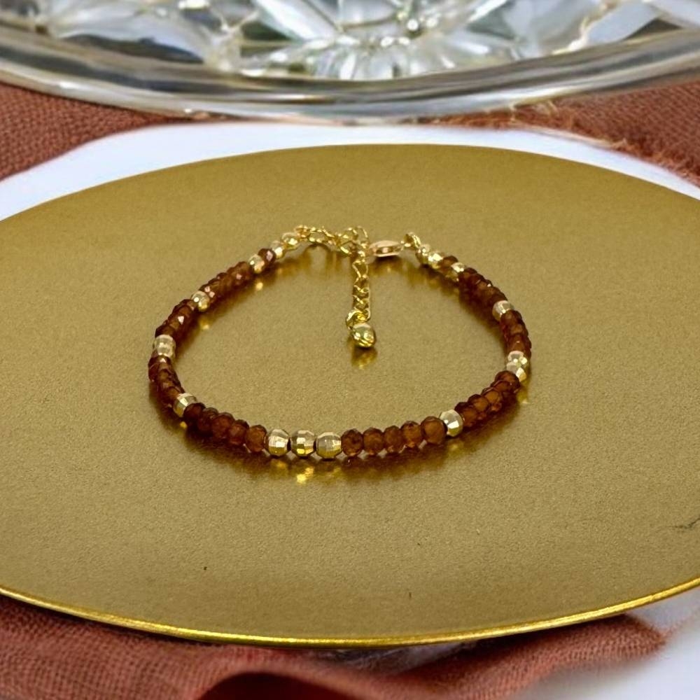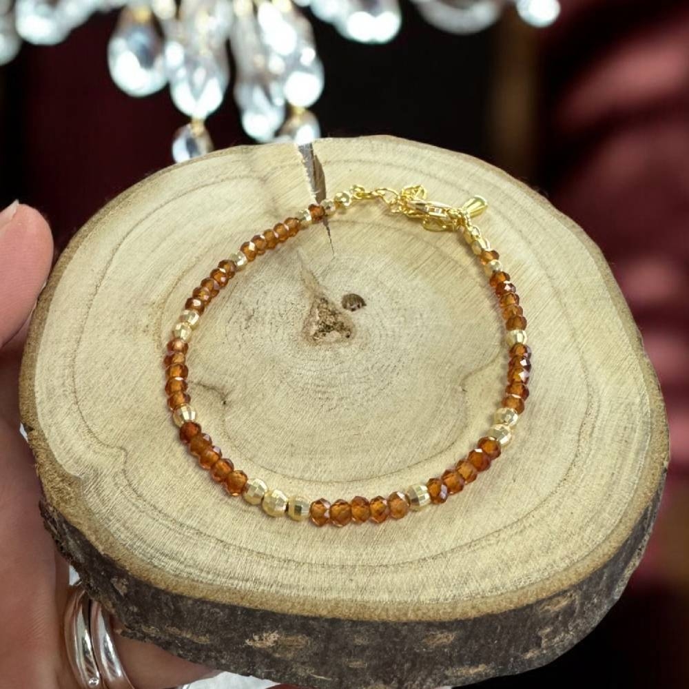 Bratara eleganta Farida este un accesoriu pe care l-am creat pentru femeile care apreciaza detaliile fine si frumusetea lucrurilor realizate manual. Realizata din granat portocaliu, cu accesorii din argint placat cu aur 925, aceasta bratara emana eleganta si stil.