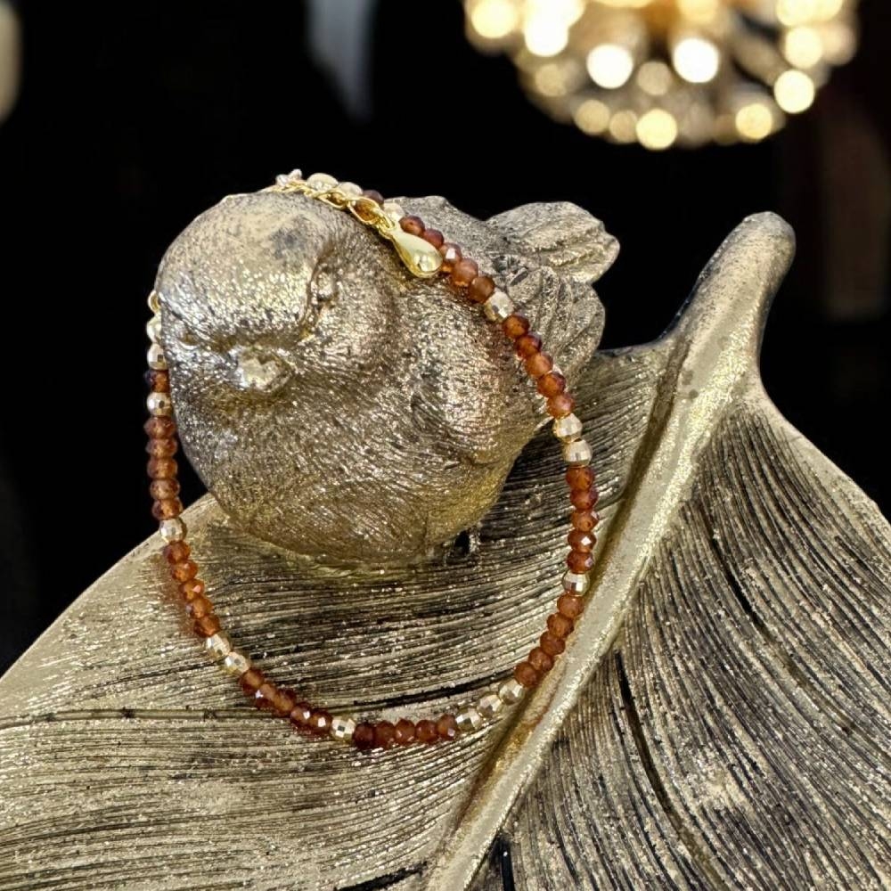 Designul bratarii Farida combina simplitatea si eleganta, permitand ca granatul portocaliu sa fie in centrul atentiei. Argintul placat cu aur 925 adauga o nota de stralucire si finete, completand perfect energia vibranta a pietrei. Aceasta bratara poate fi purtata atat la ocazii speciale, cat si in viata de zi cu zi, fiind un accesoriu versatil care va infrumuseta orice tinuta.