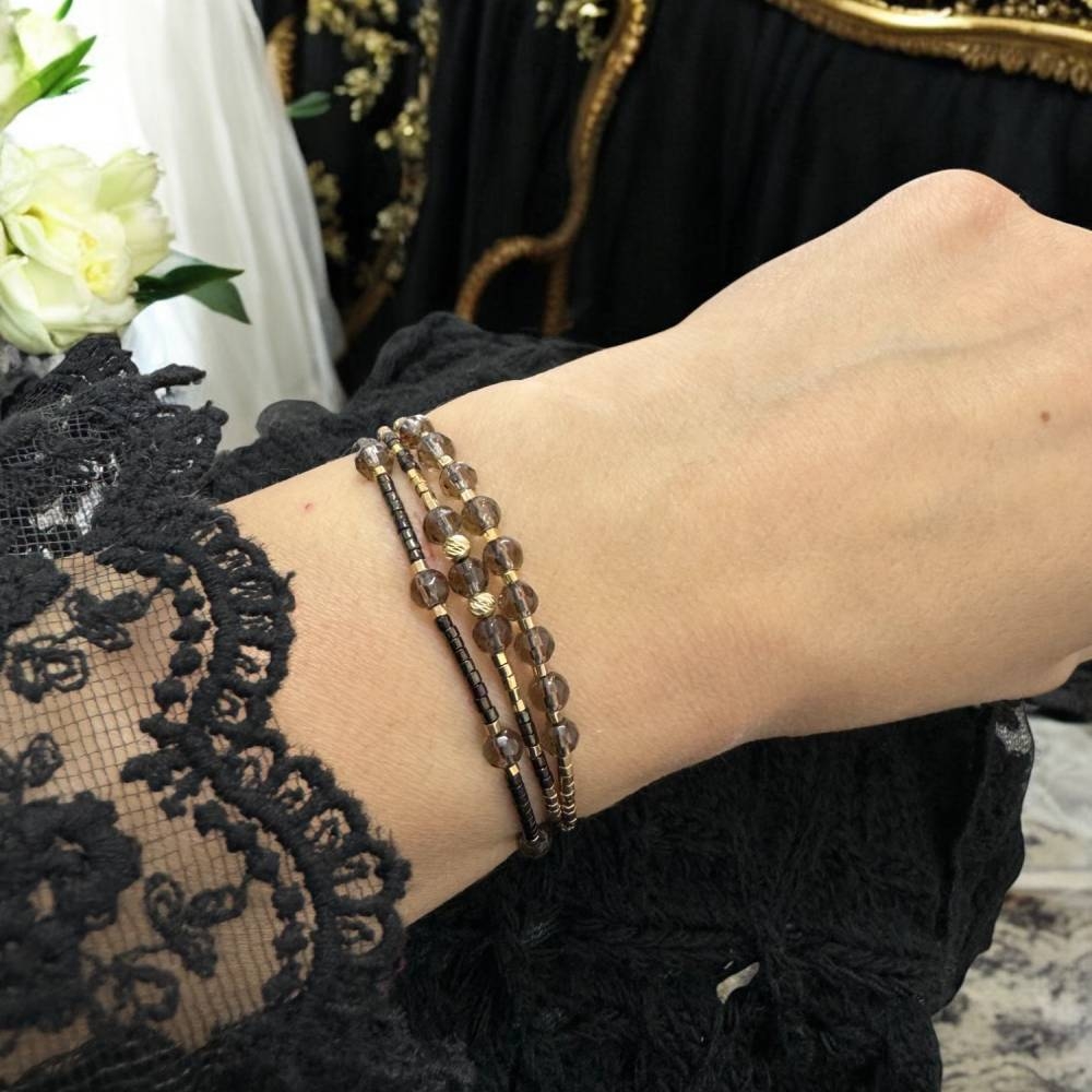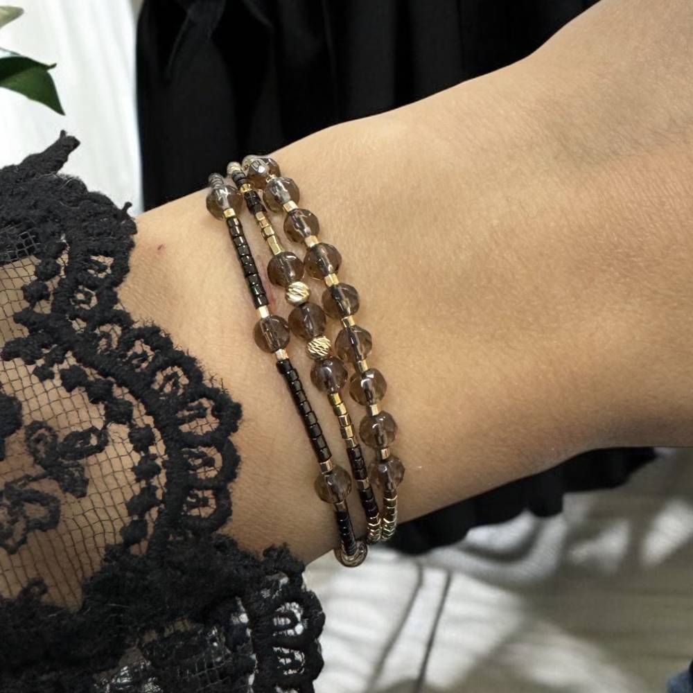 Margelele Miyuki, cu textura lor delicata, sunt combinate cu cristalele de Cuart Fumuriu intr-un contrast subtil, care atrage atentia fara a fi prea incarcat. Detaliile din argint placat cu aur ofera bratarii o nota de eleganta si stralucire, adaugand un plus de rafinament designului general.