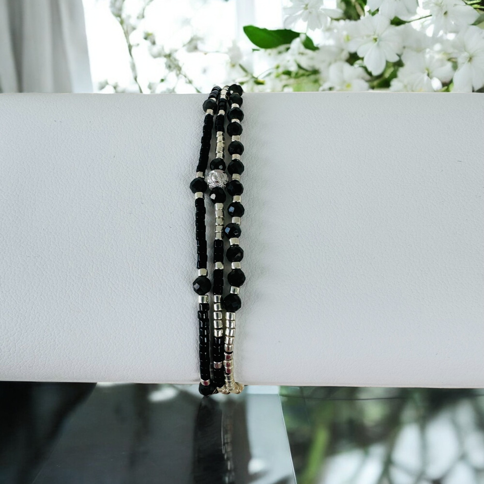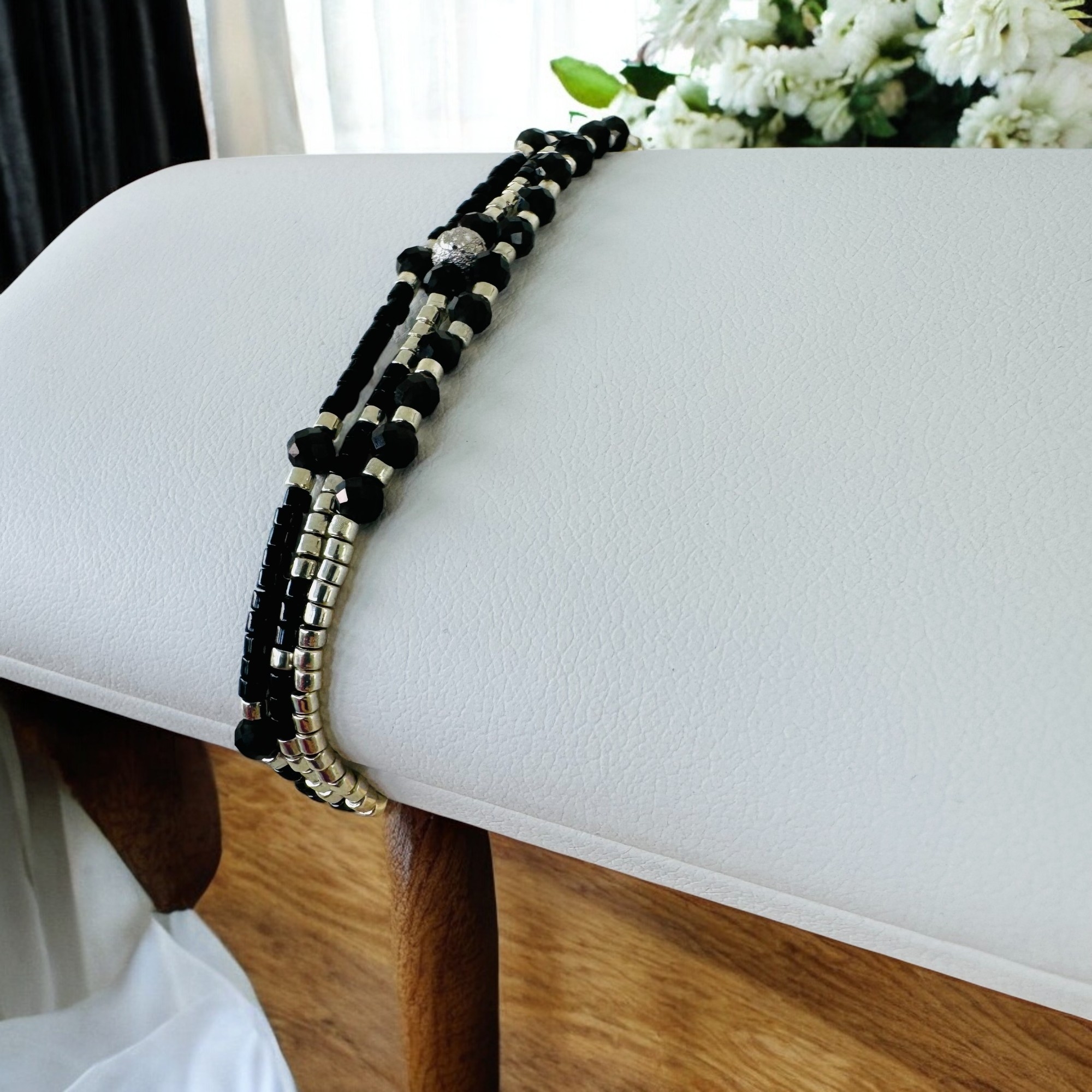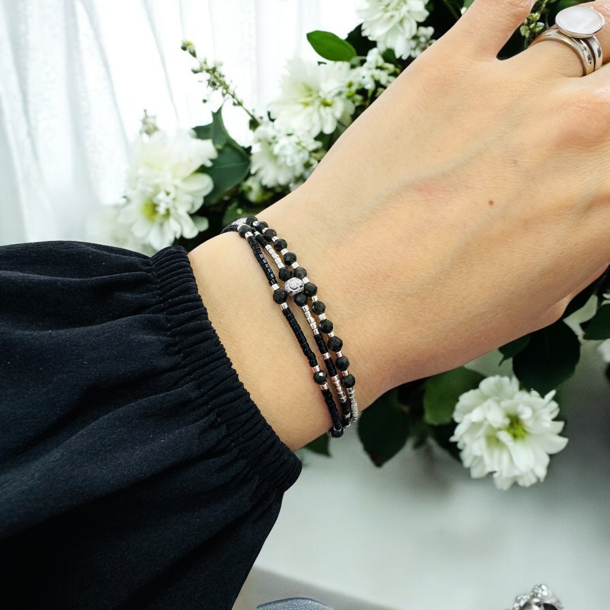 Bratara snur negru-argintiu Elysia 3 straturi Miyuki si Obsidian cu argint 925
