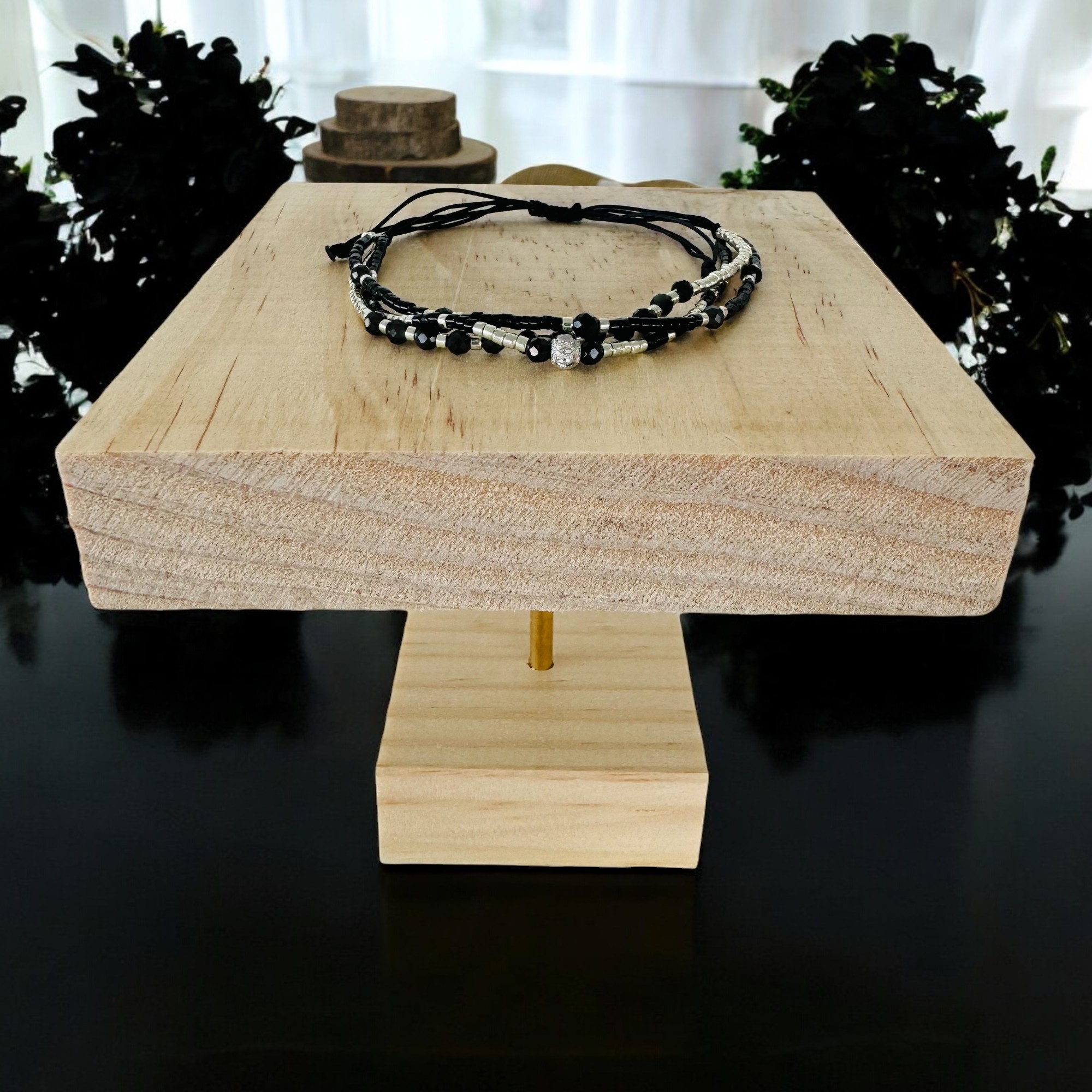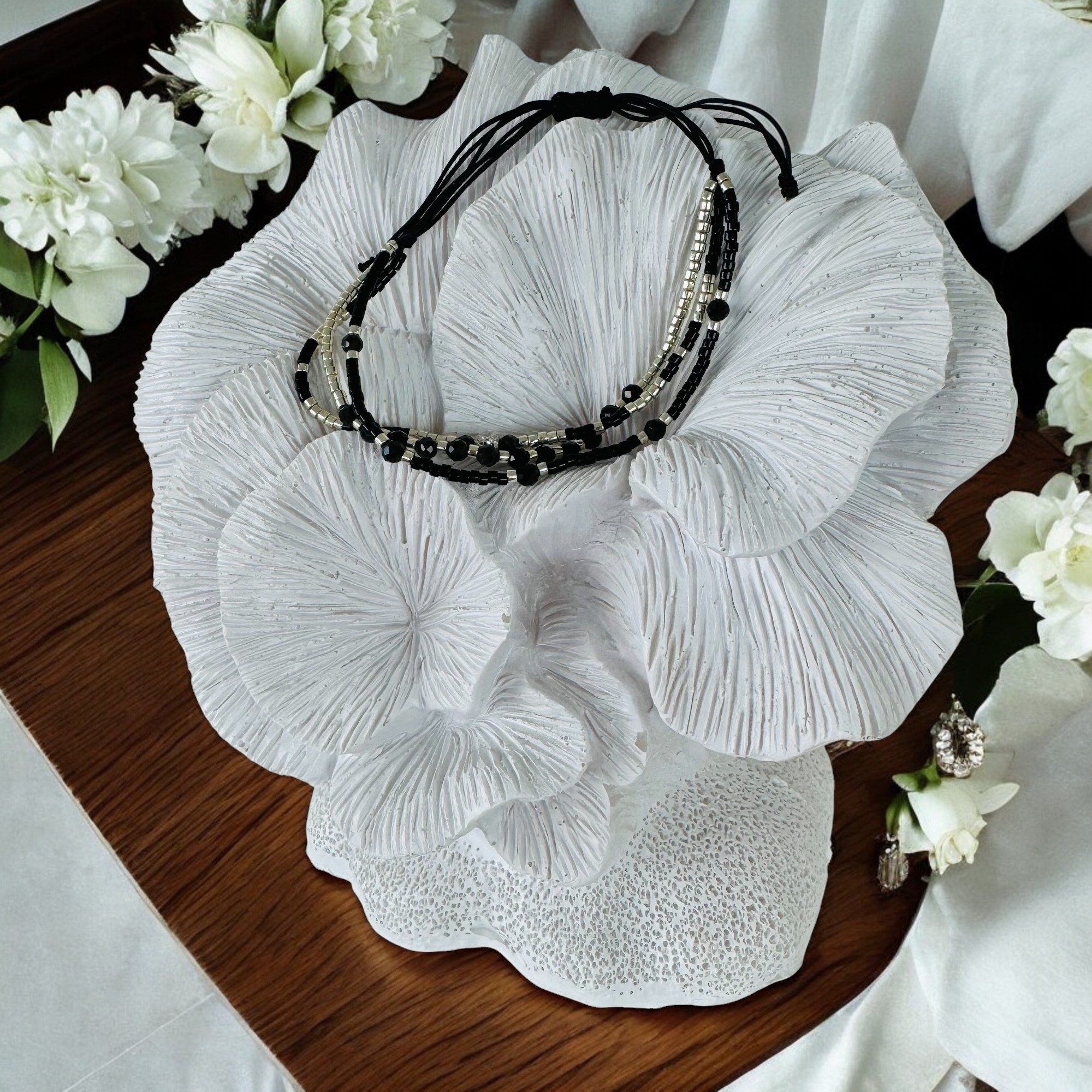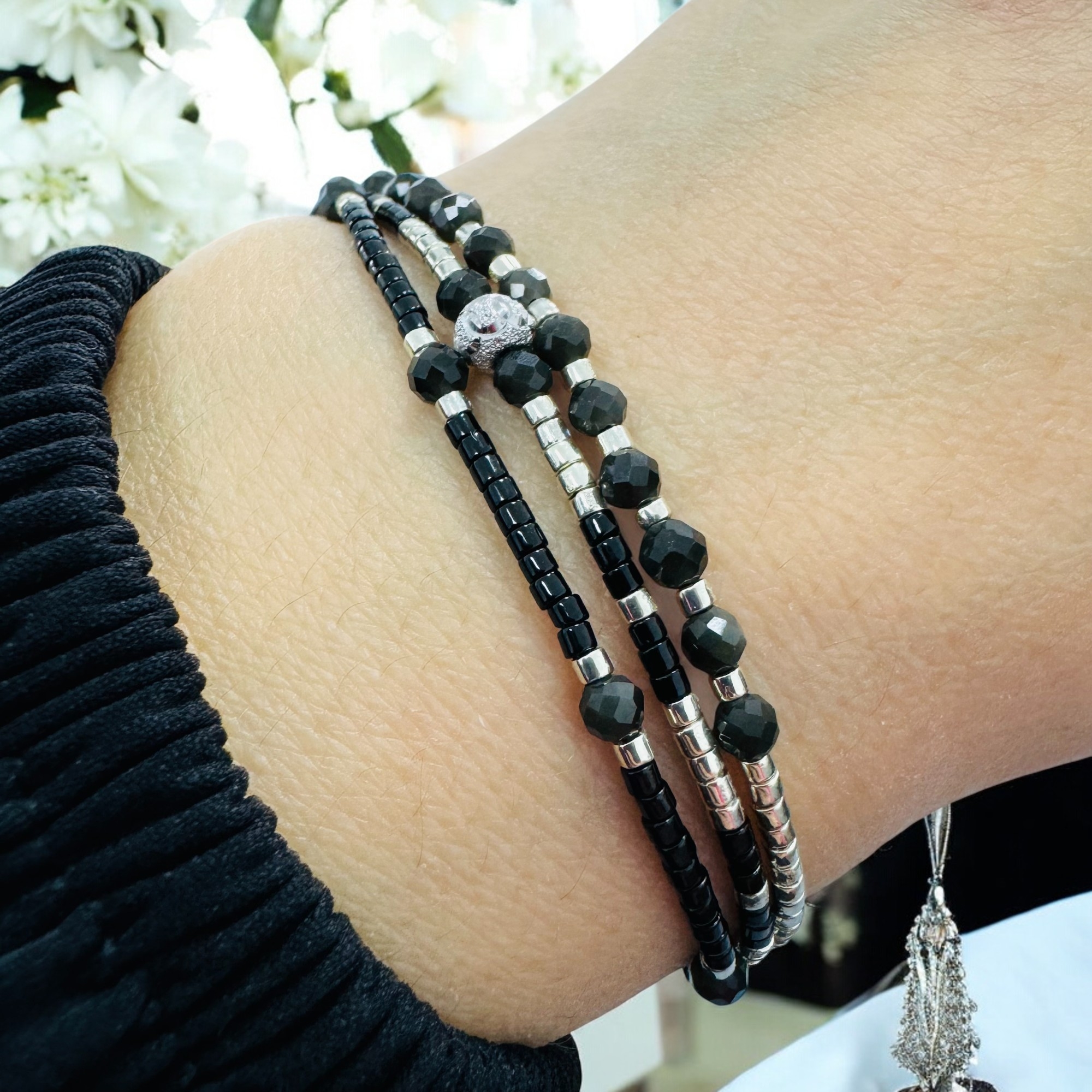 Bratara snur negru-argintiu Elysia 3 straturi Miyuki si Obsidian cu argint 925