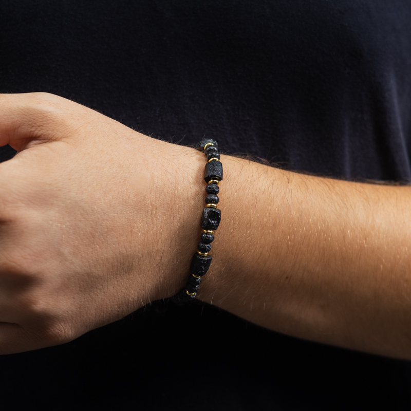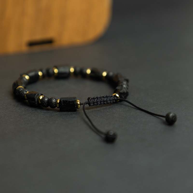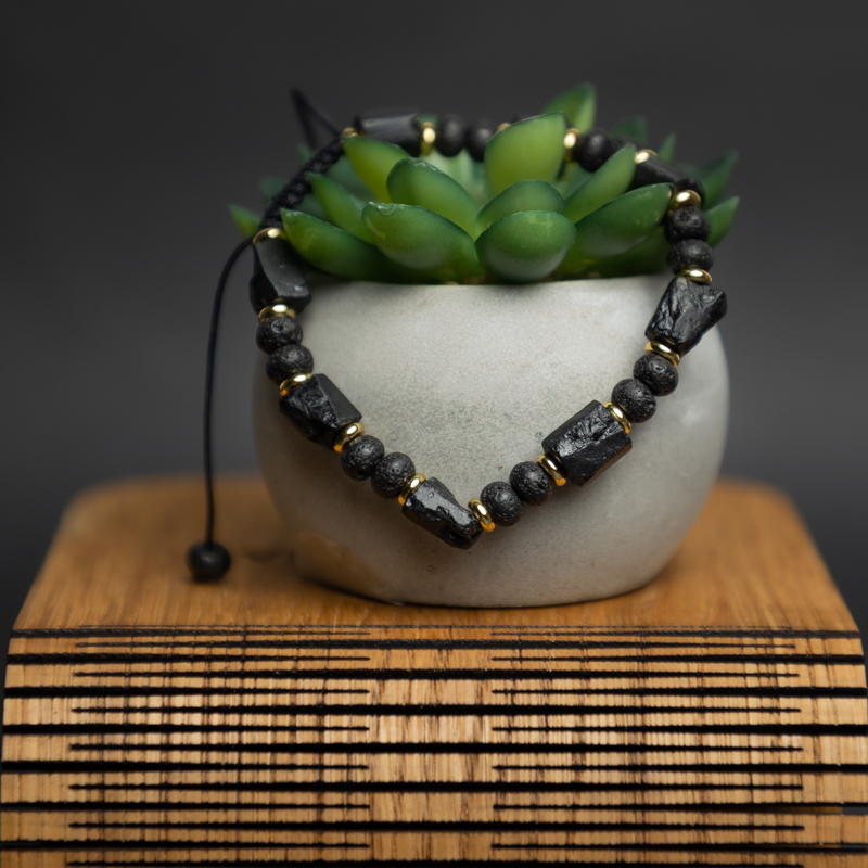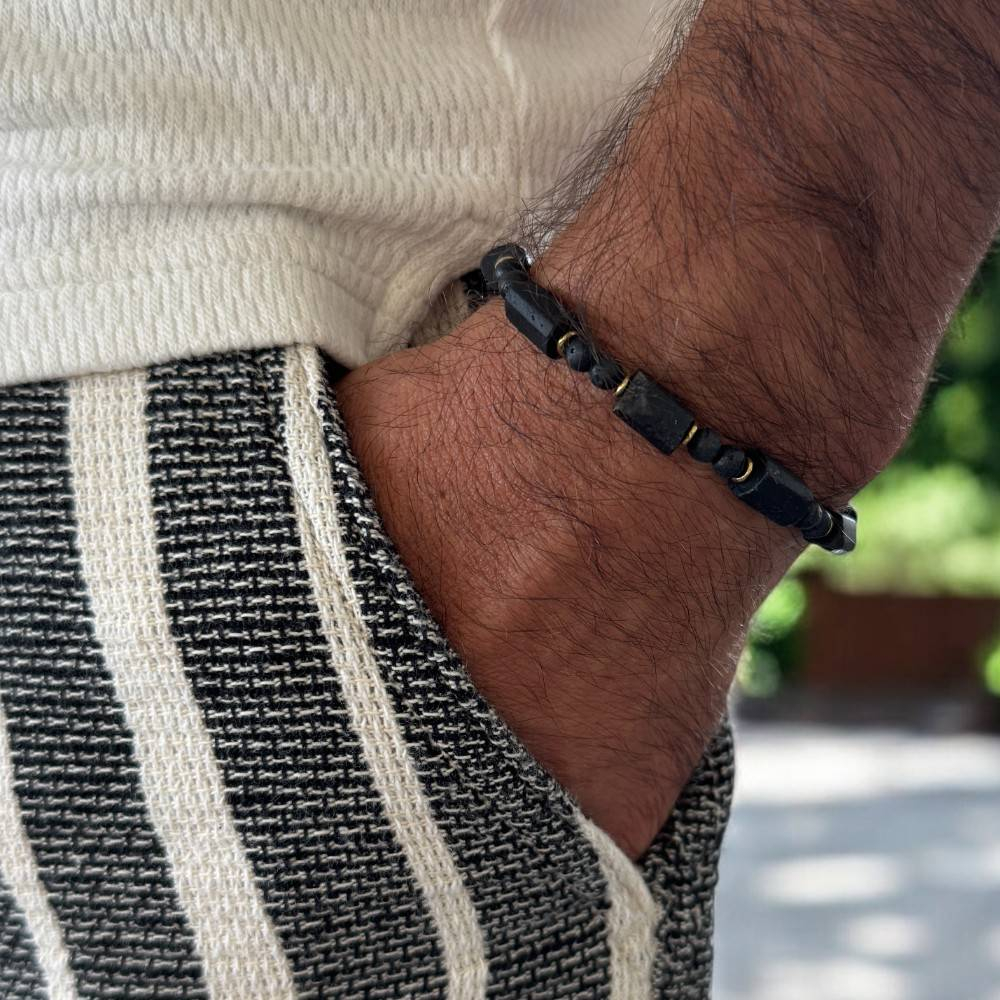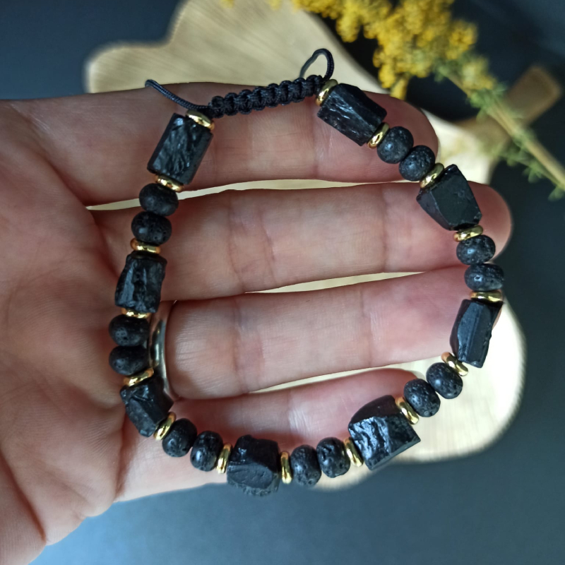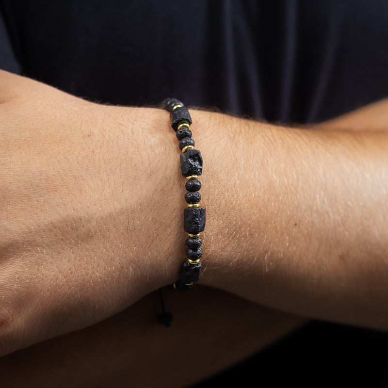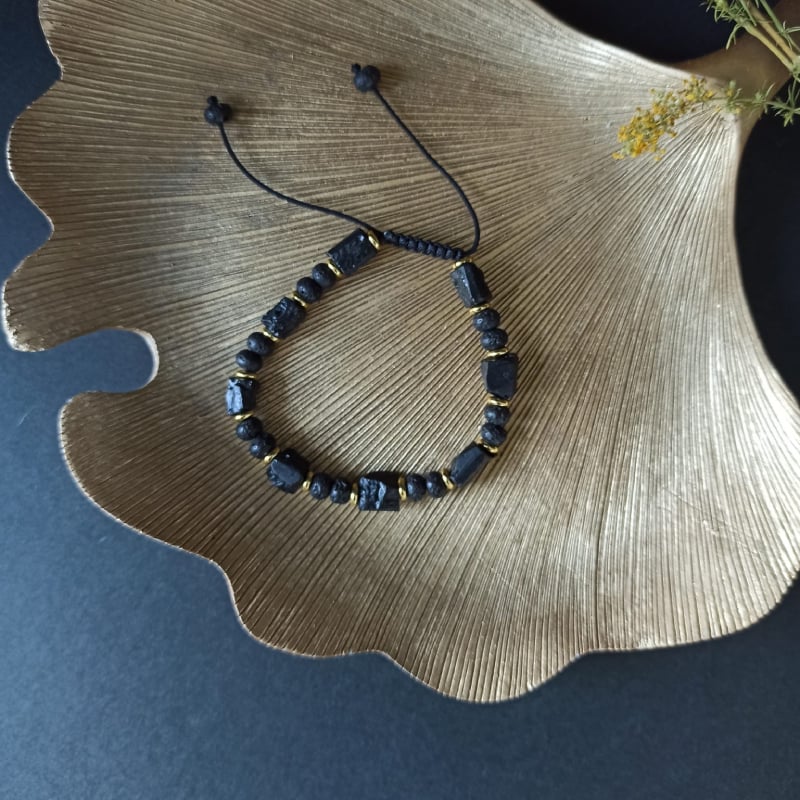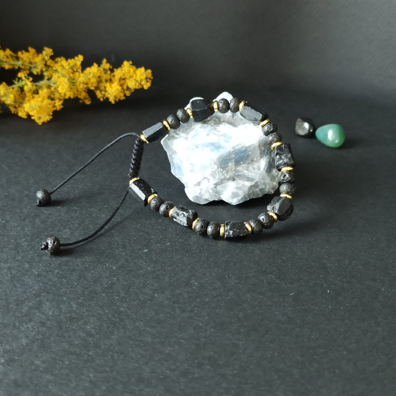 Bratara snur barbati din turmalina neagra naturala realizata manual, cu margele de lava, Devyan