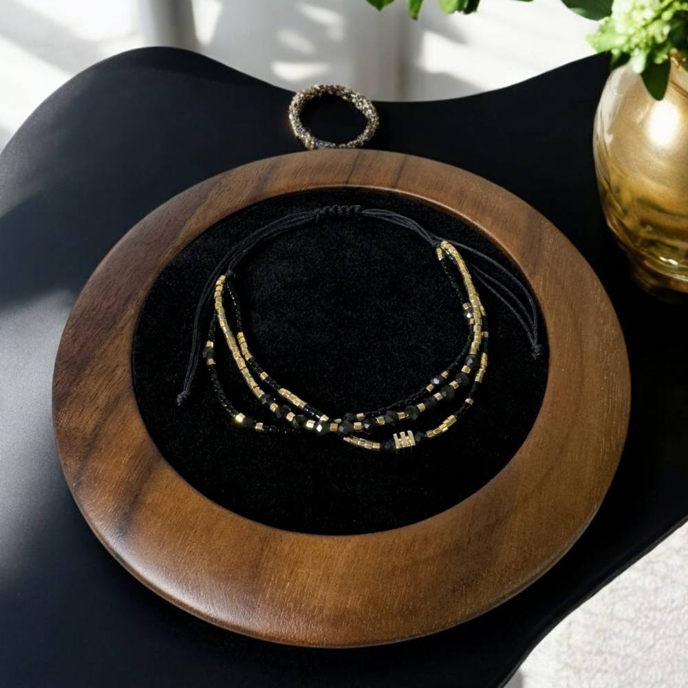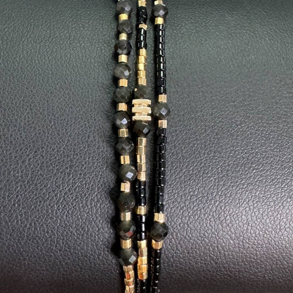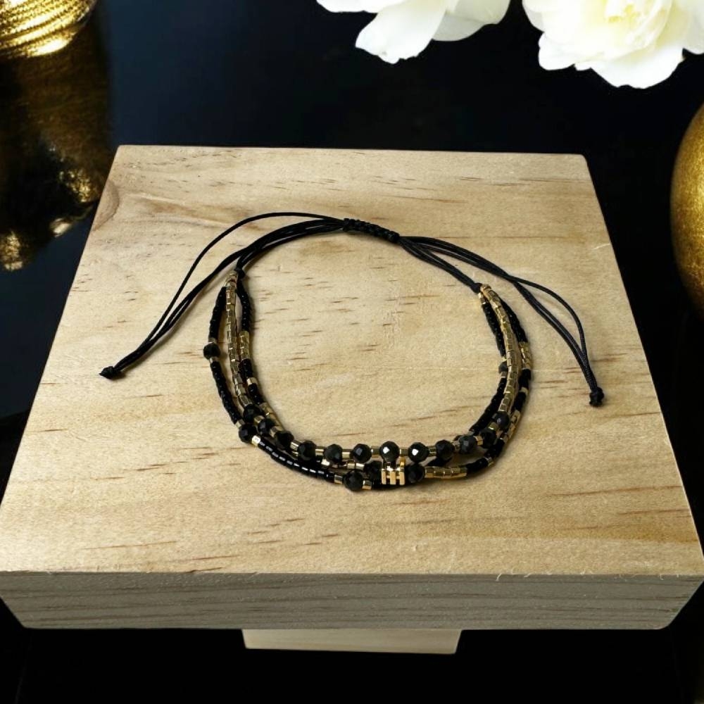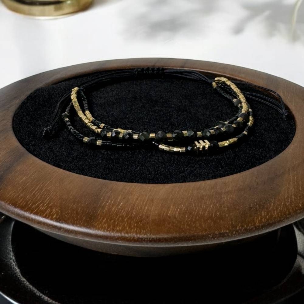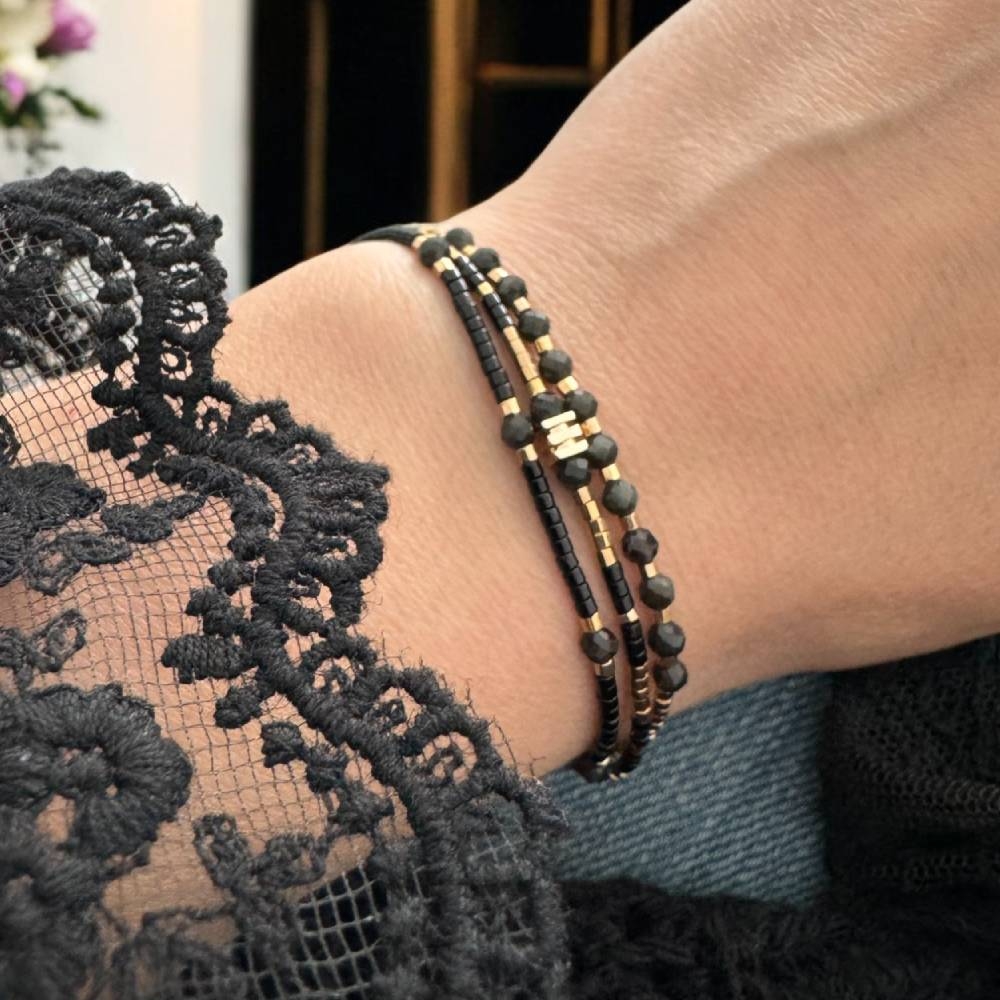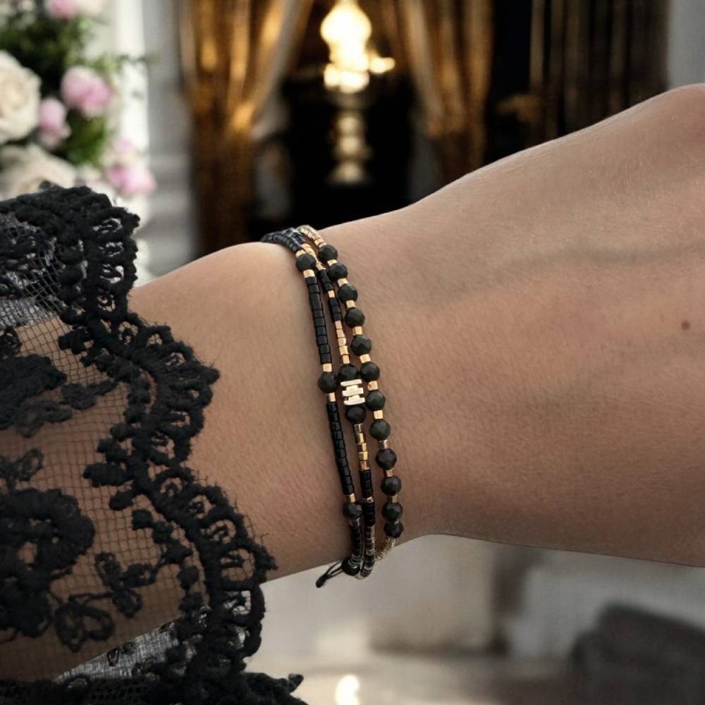 Bratara handmade Malika este o alegere ce-ti va aduce eleganta. Am ales sa imbin margelutele Miyuki aurii si negre cu cristale de Obsidian pentru a crea o bratara deosebita. Fiecare detaliu al acestei bratari este lucrat manual cu atentie, oferind un accesoriu unic ce se remarca prin finetea si calitatea materialelor folosite.