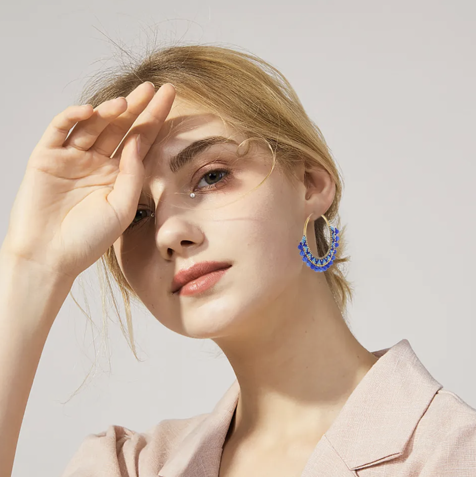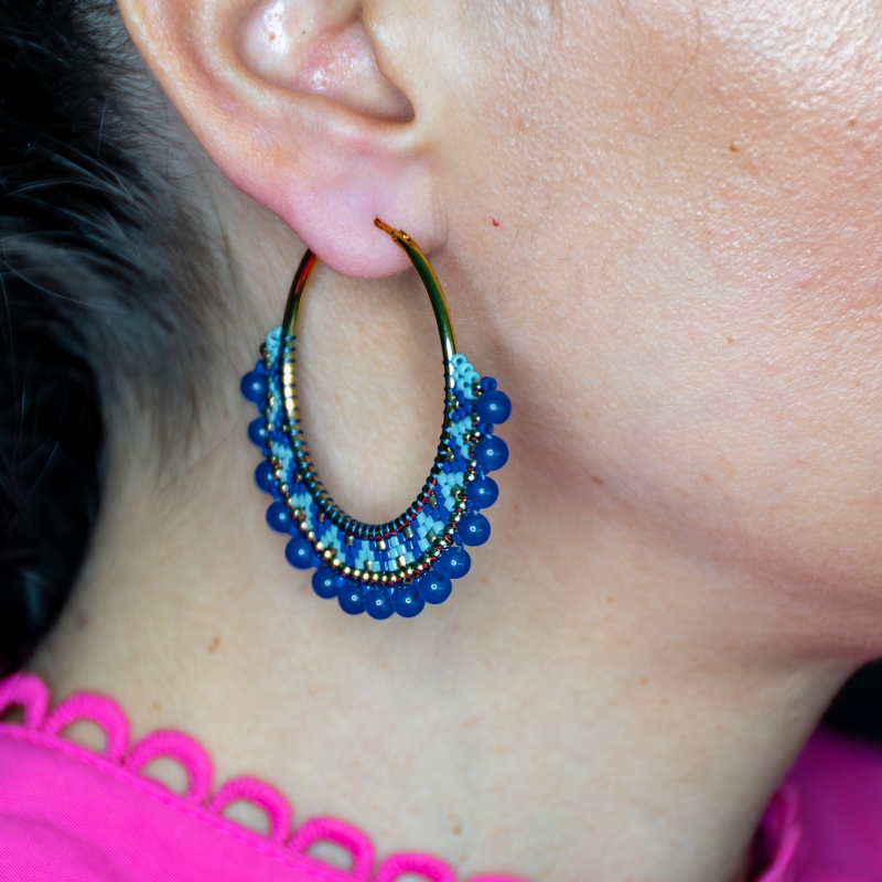 Completeaza-ti aspectul boem- Indiferent daca esti intr-o rochie maxi fluida, o fusta vaporoasa sau in perechea ta de blugi preferata, acesti cercei rotunzi de culoare albastru inchis completeaza stilul tau fara efort, adaugand acea nota de farmec boem care te diferentiaza.