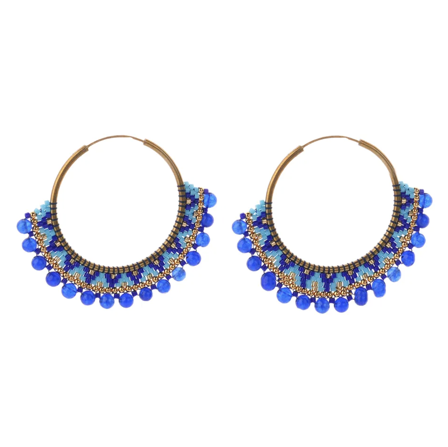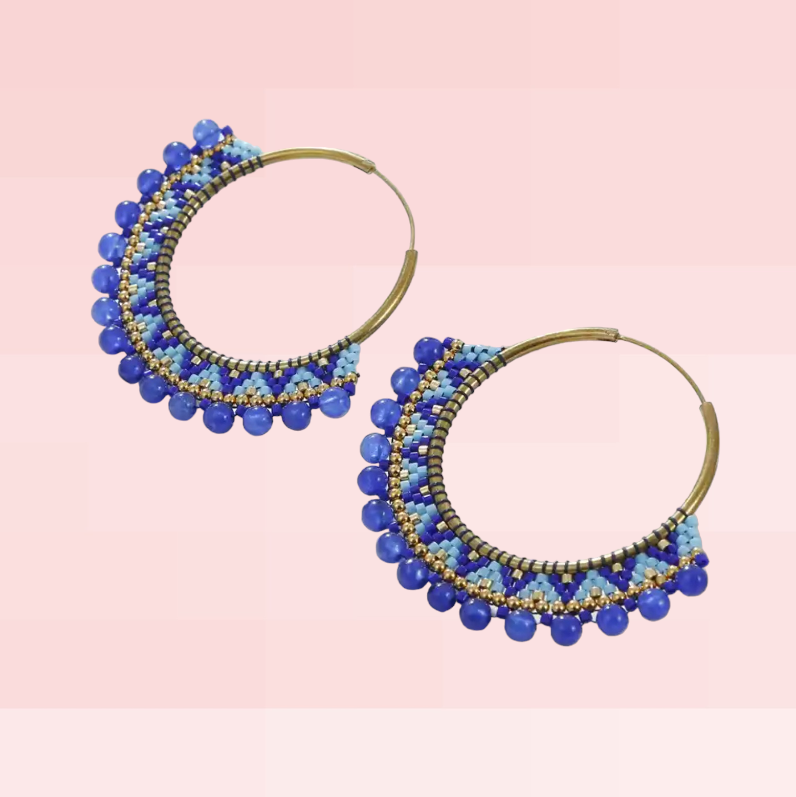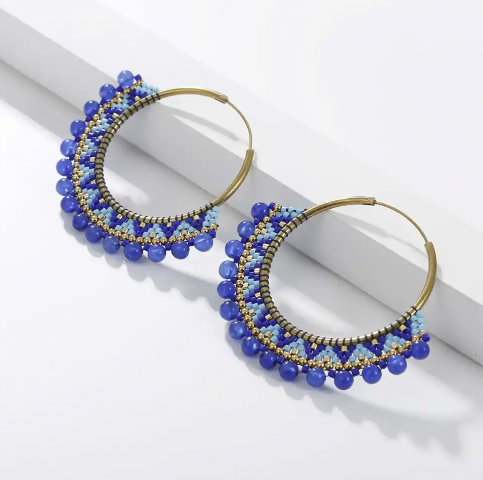 Reaprinde-ti sufletul boem- Intra in lumea fermecatoare a stilului boem cu cerceii nostri rotunzi lucrati manual. O adevarata capodopera, acesti cercei combina margele Miyuki cu alura mistica a cristalelor de cuart vopsite in albastru inchis. Imbratiseaza-ti spiritul unic si lasa-ti frumusetea interioara sa straluceasca.
